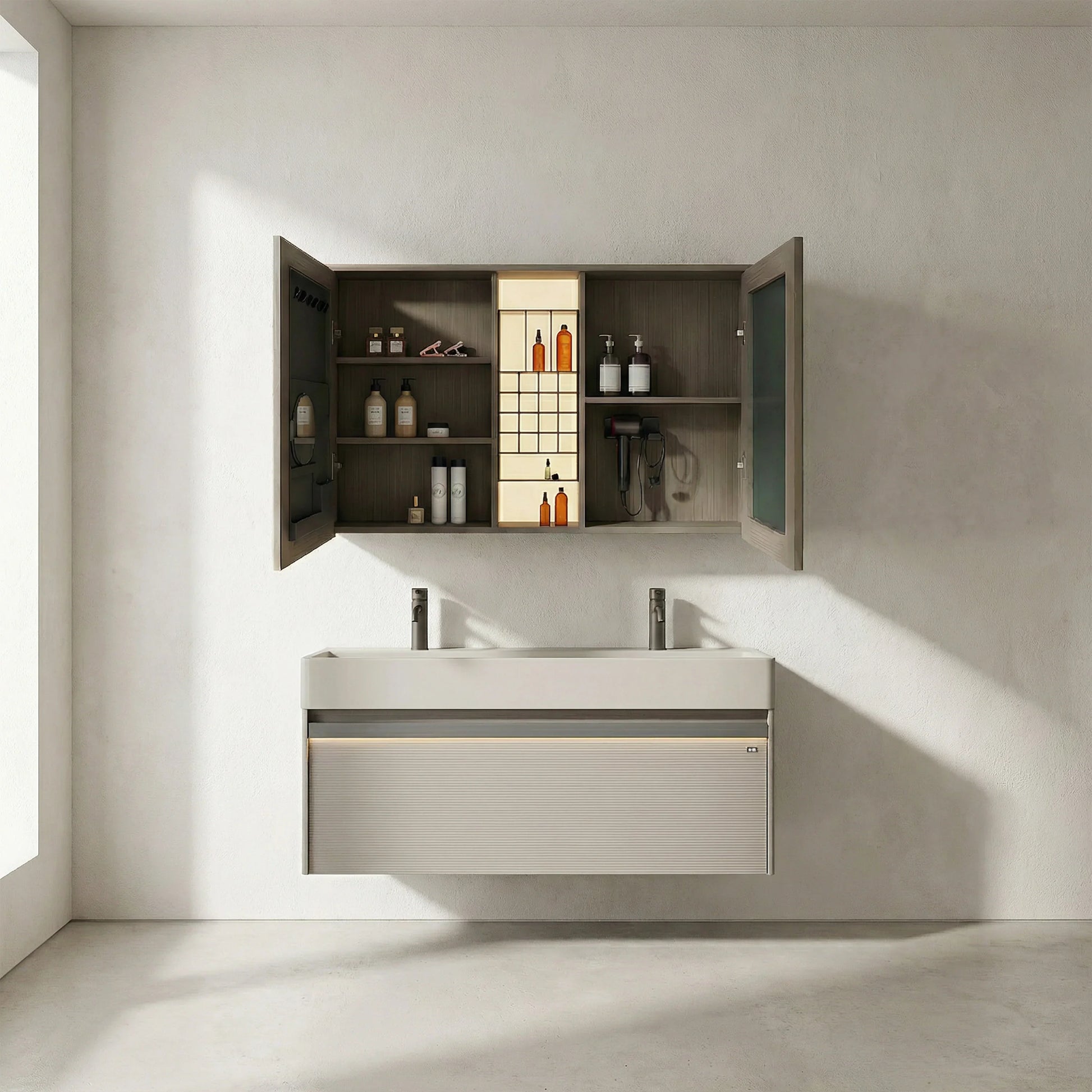 Armoire à Pharmacie DEL Taupe 48po avec Portes à Fermeture Douce