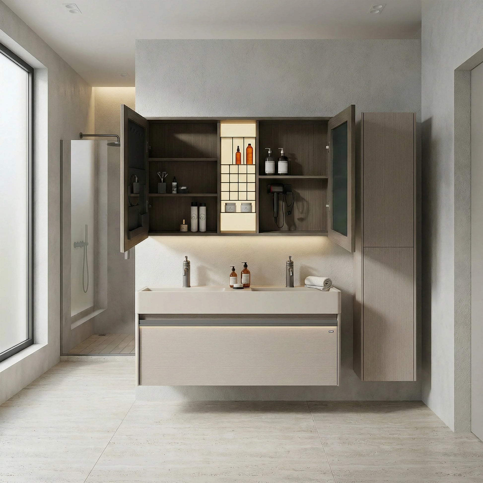 Parmi ses caractéristiques distinctives : des portes à fermeture douce pour une utilisation silencieuse, des tablettes intérieures ajustables et une esthétique minimaliste qui s'harmonise parfaitement avec tout décor contemporain. La couleur taupe neutre s'agence magnifiquement avec divers styles de meubles lavabo.