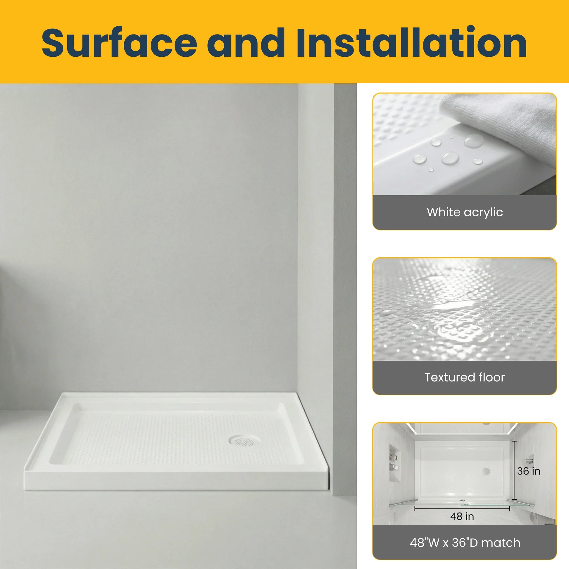 Base de douche blanche en acrylique 48po x 36po – Drain à droite, 2 murs