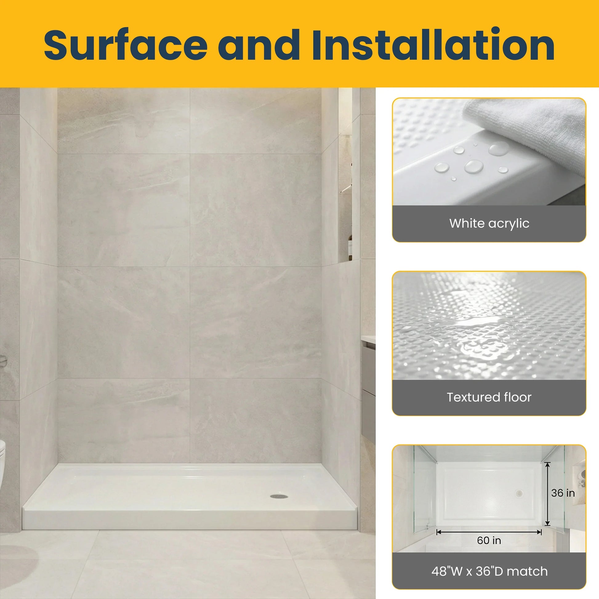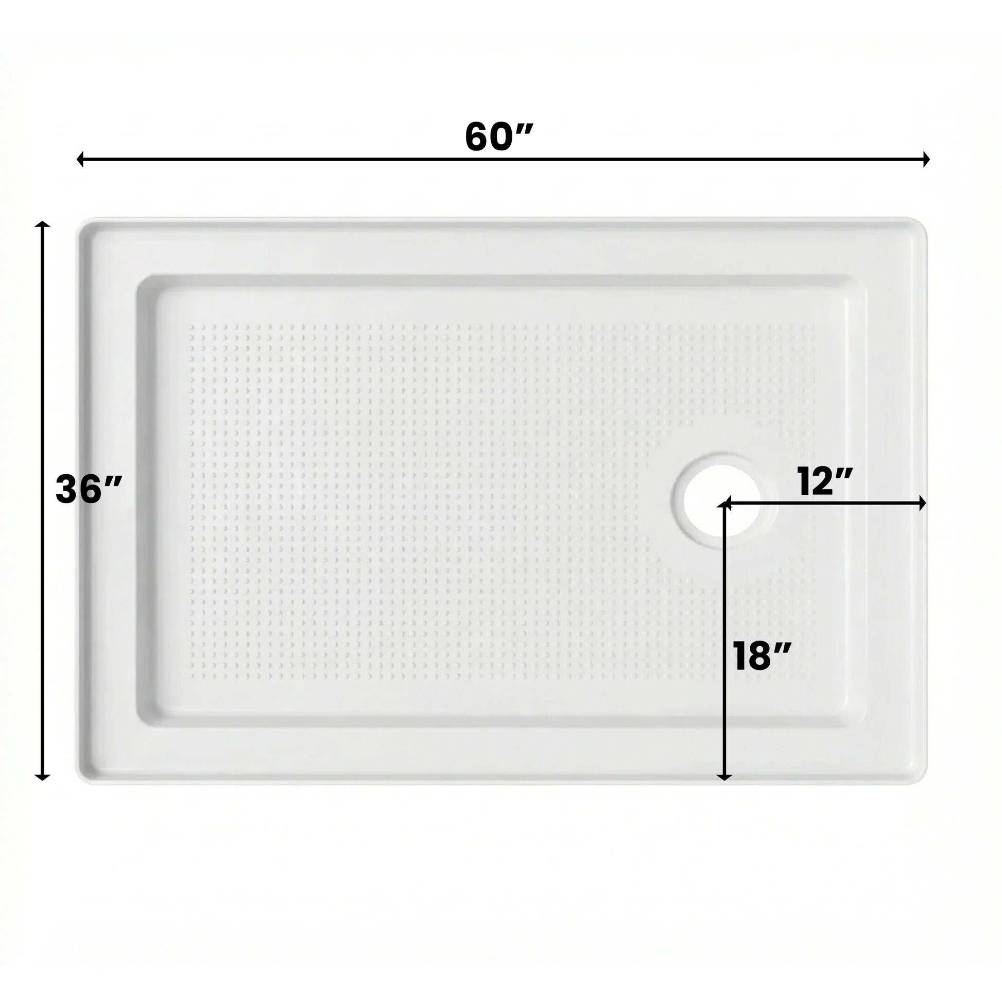 Base de Douche Acrylique Blanche 60po x 36po - Installation 2 Murs avec Drain à Droite