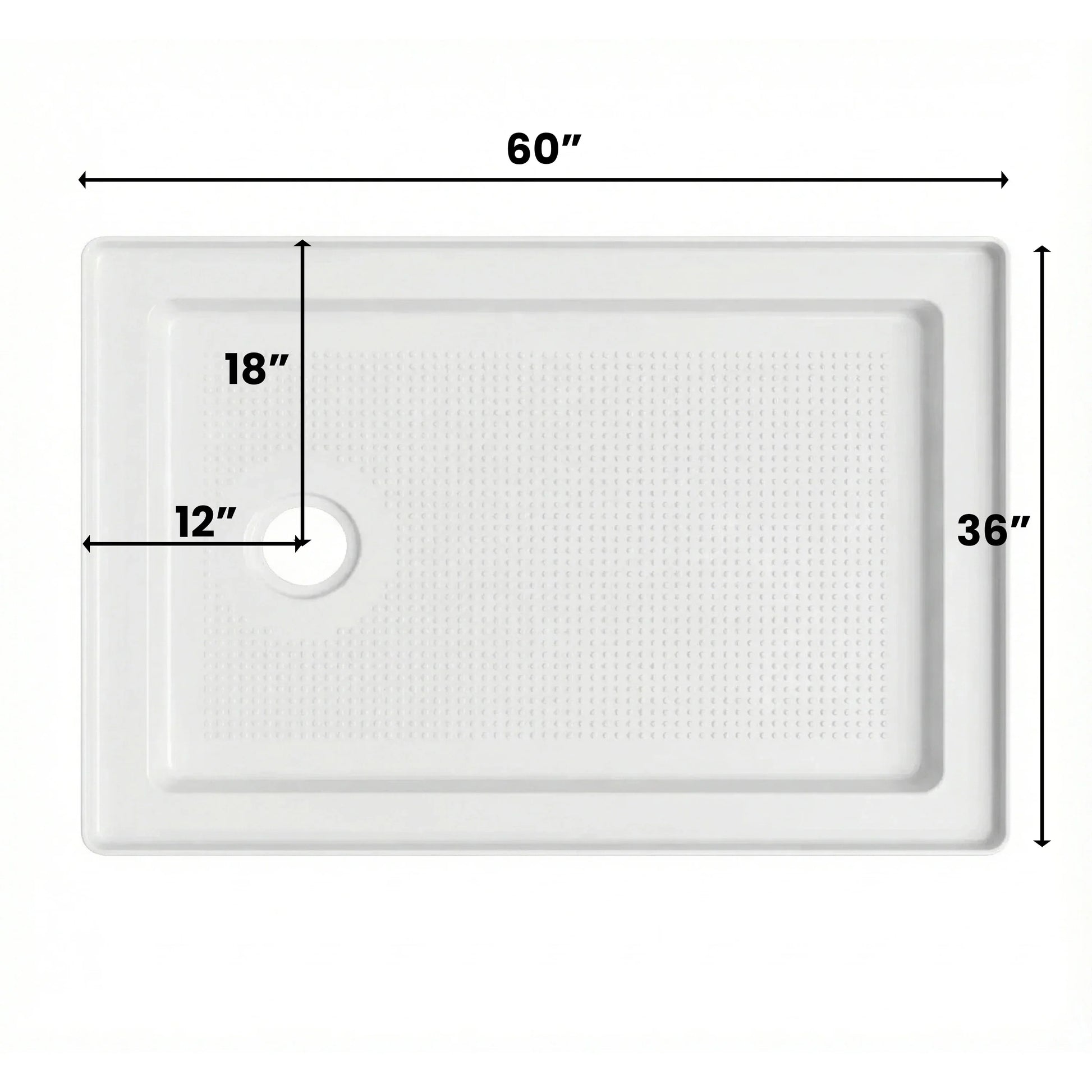 La surface texturée antidérapante assure une sécurité accrue, tandis que le fini blanc lisse facilite grandement l'entretien. Dimensions : 60po (L) x 36po (P) x 3,5po (H). Notez que le drain de douche est vendu séparément — cette base est entièrement compatible avec notre drain de douche ABS pour une installation complète.