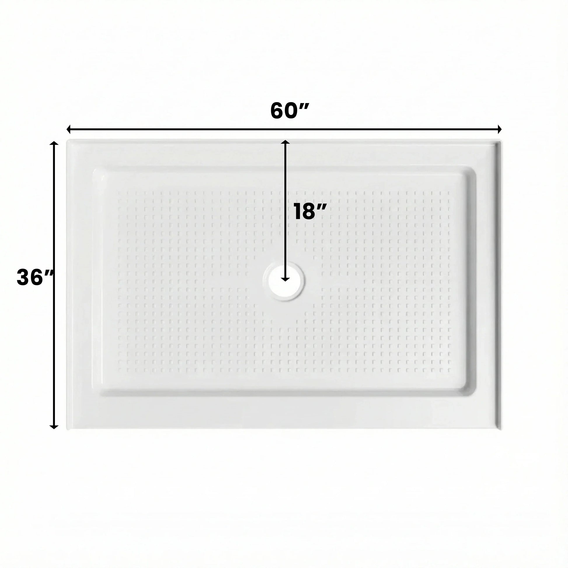 Base de douche acrylique blanche 60po x 36po – Drain central, installation 3 murs