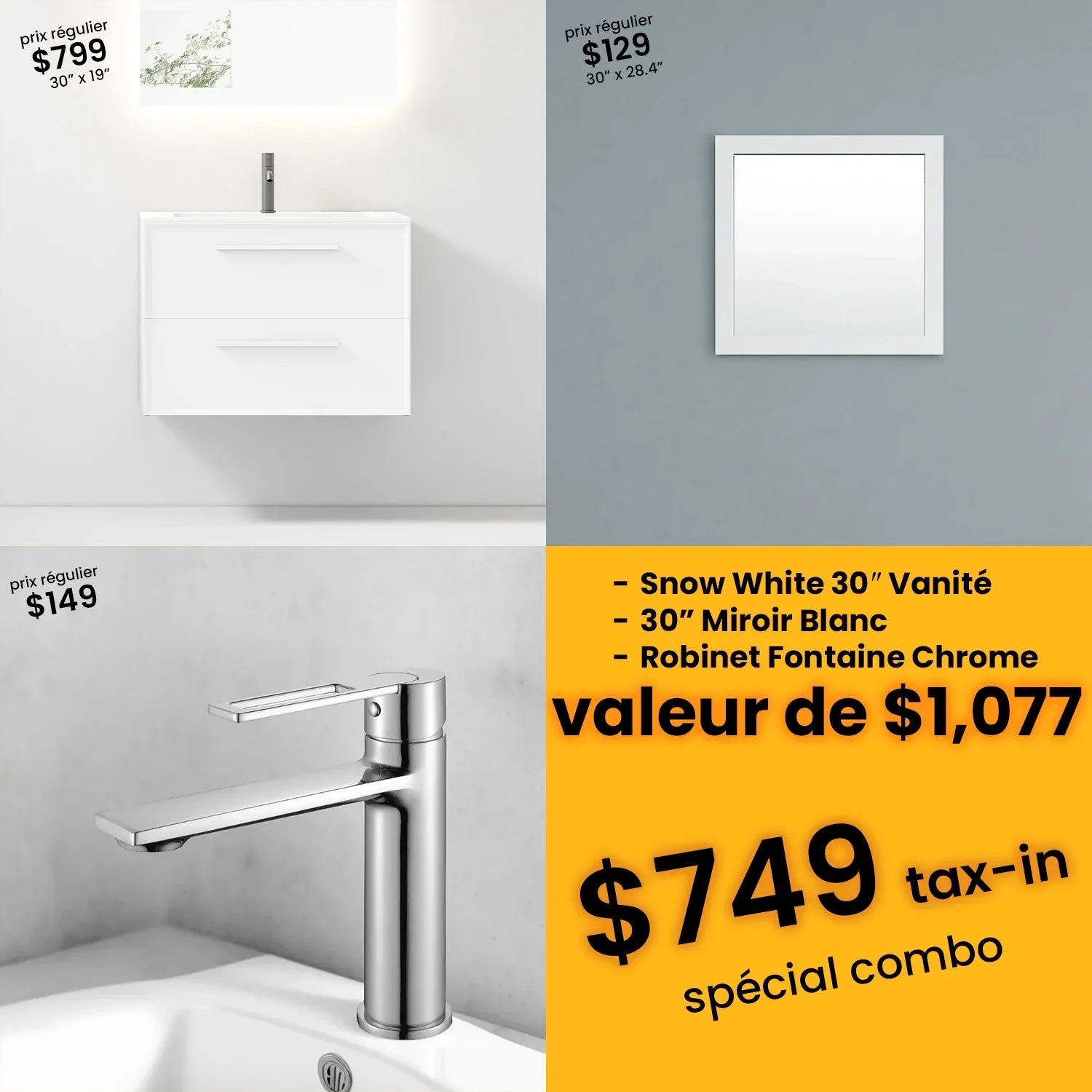 Vendu à l'unité à 1 107 $, cet ensemble exclusif offre tout ce dont vous avez besoin pour sublimer votre salle de bains, le tout dans un seul et même ensemble, simple et abordable. Que vous rénoviez ou conceviez de toutes pièces, cet ensemble offre une esthétique intemporelle, une fonctionnalité peu encombrante et une solution complète, le tout pour seulement 749 $ taxes incluses .