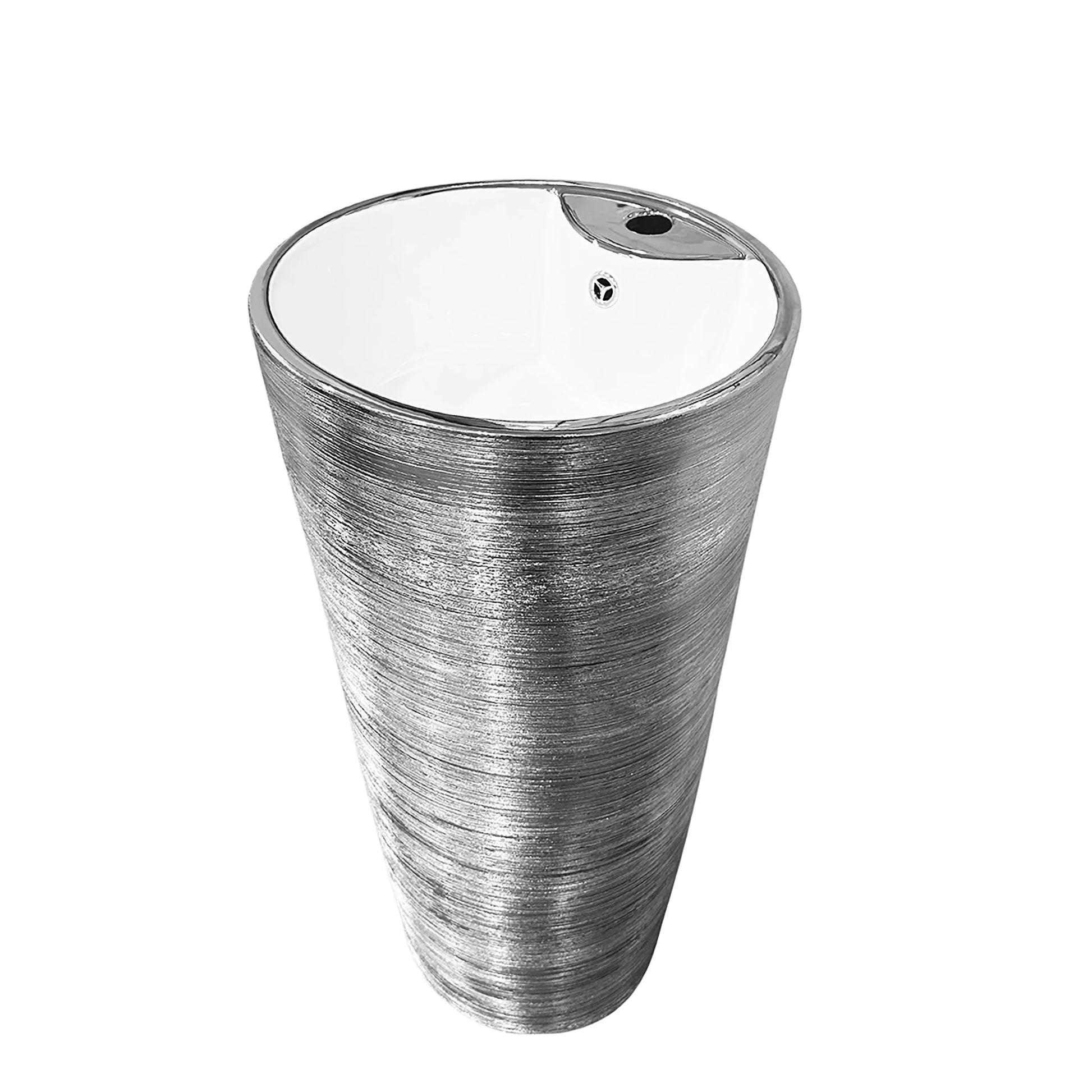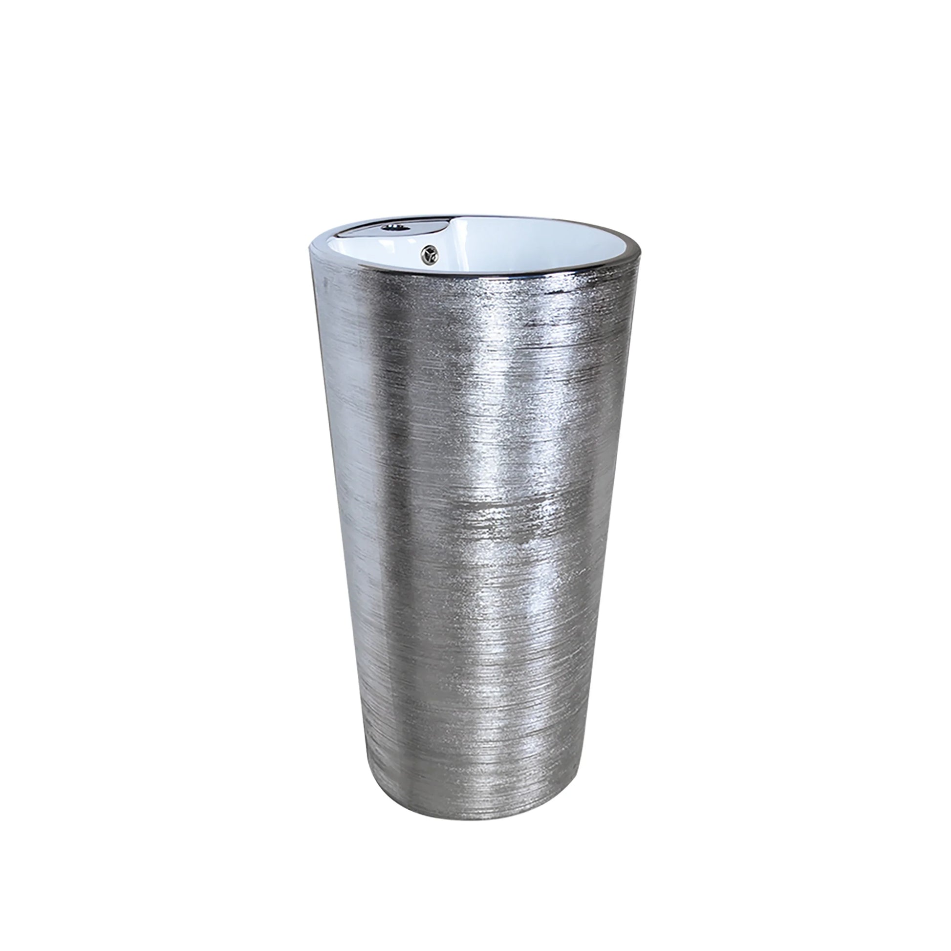 Le design cylindrique présente une finition métallique brossée artisanale aux tons argentés, tandis que le bassin intérieur offre une surface en céramique blanche haute brillance. Fabriqué en céramique de qualité supérieure cuite à haute température, ce lavabo assure une résistance exceptionnelle aux taches, un nettoyage facile et une durabilité remarquable.