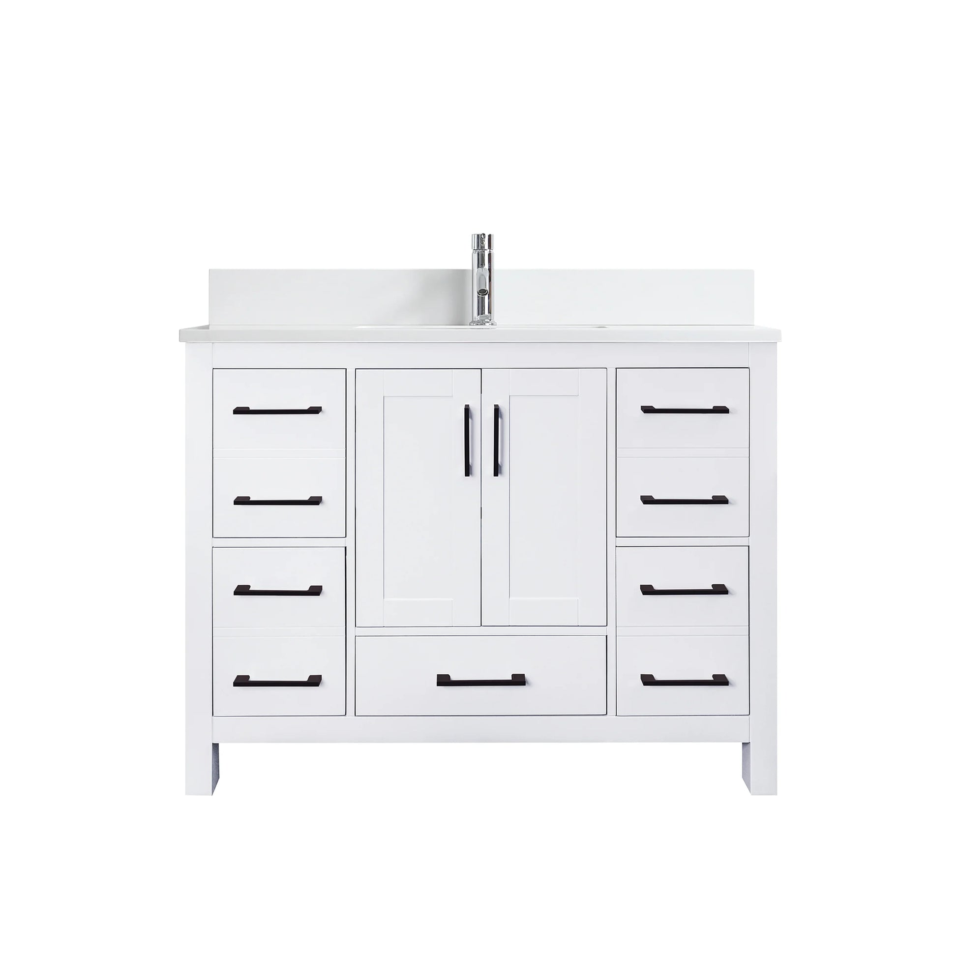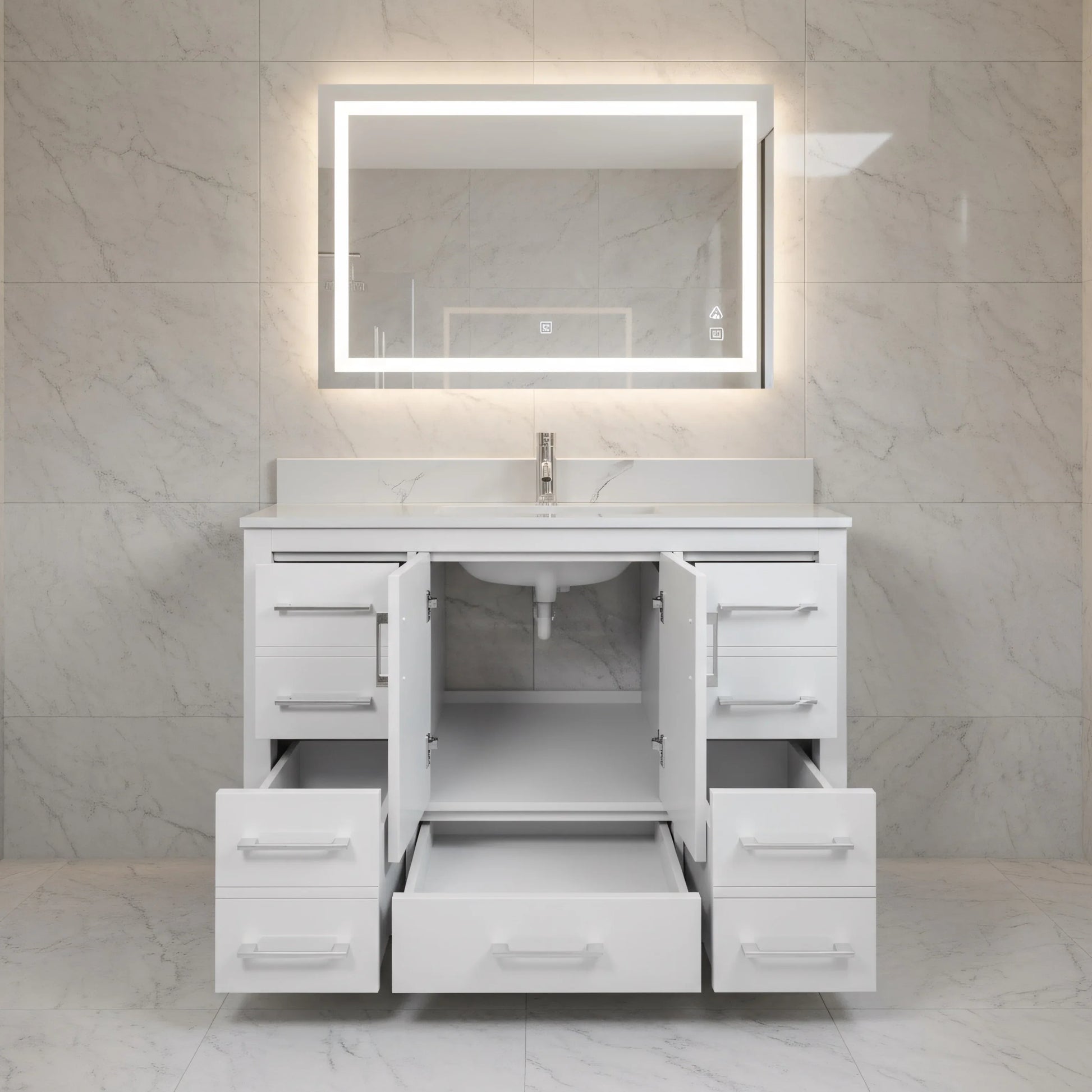 Chaque meuble-lavabo est entièrement équipé d'un évier en porcelaine sous plan pré-monté et certifié CUPC, d'un dosseret en marbre assorti de 4 pouces de hauteur, de trous de robinet mono-percés, de pieds réglables et d'un drain escamotable pour une installation facile.