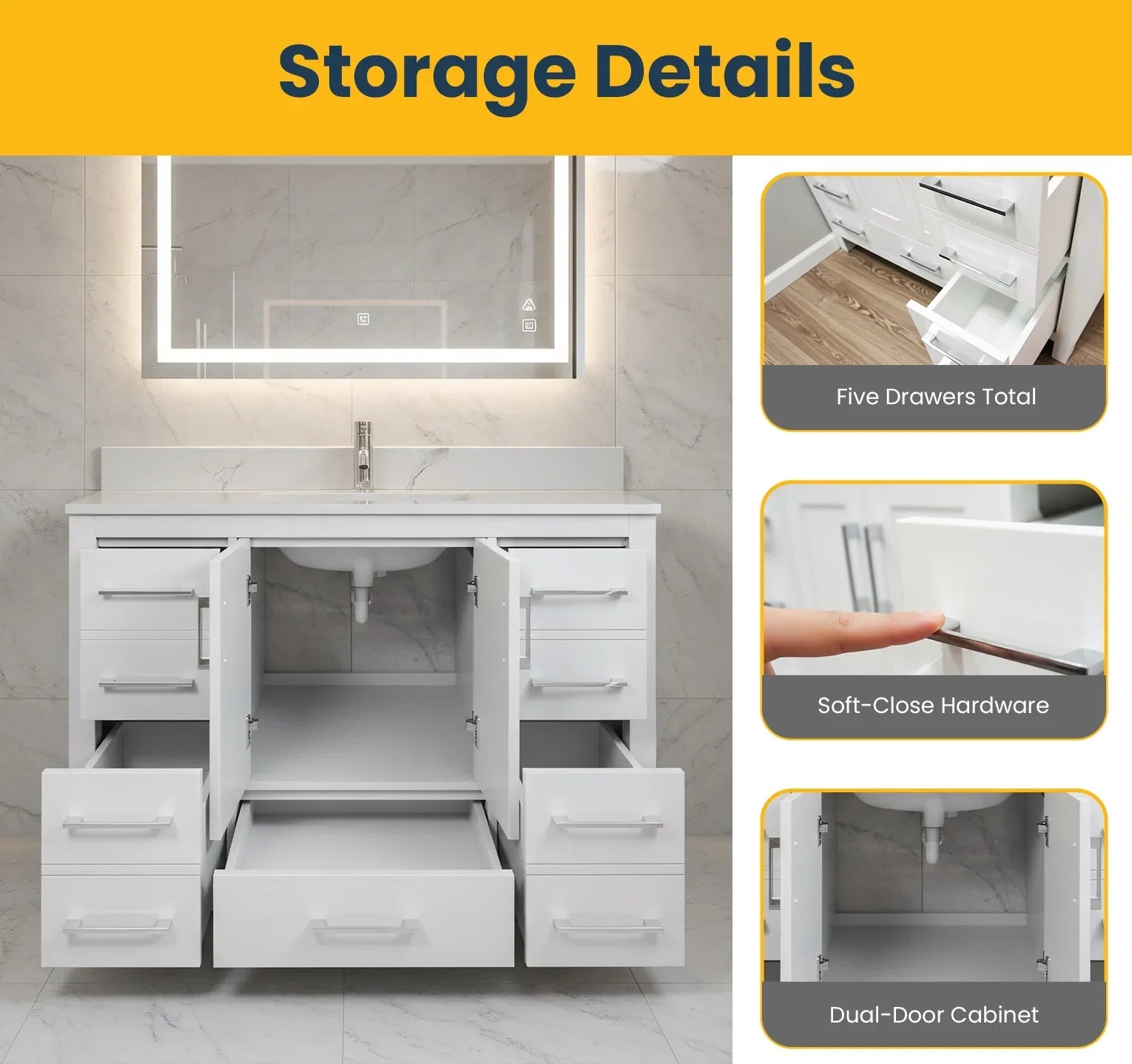 De plus, il comprend deux ensembles de poignées - Chrome et Noir mat, afin que vous puissiez adapter votre vanité à votre vision de design personnelle.