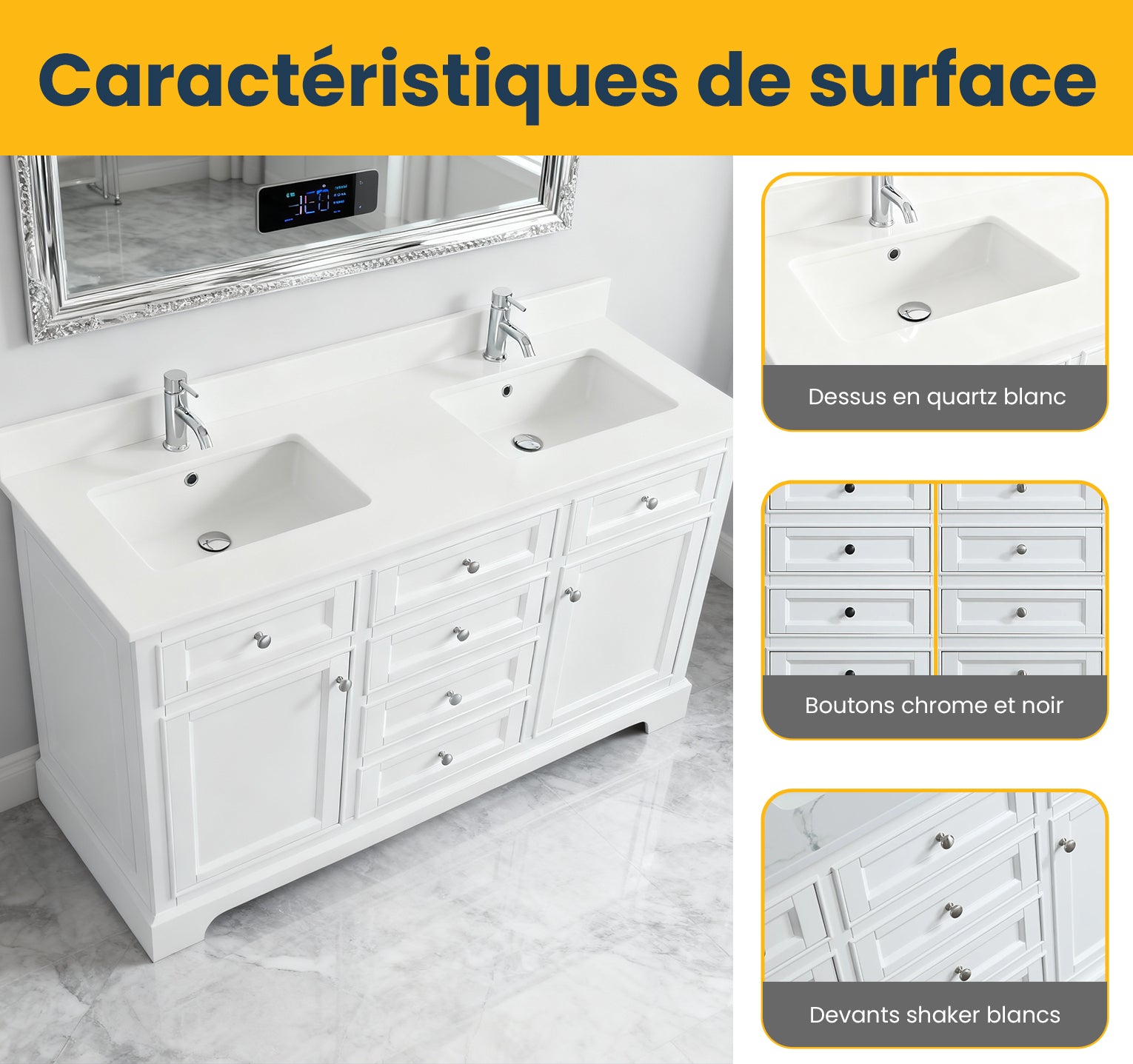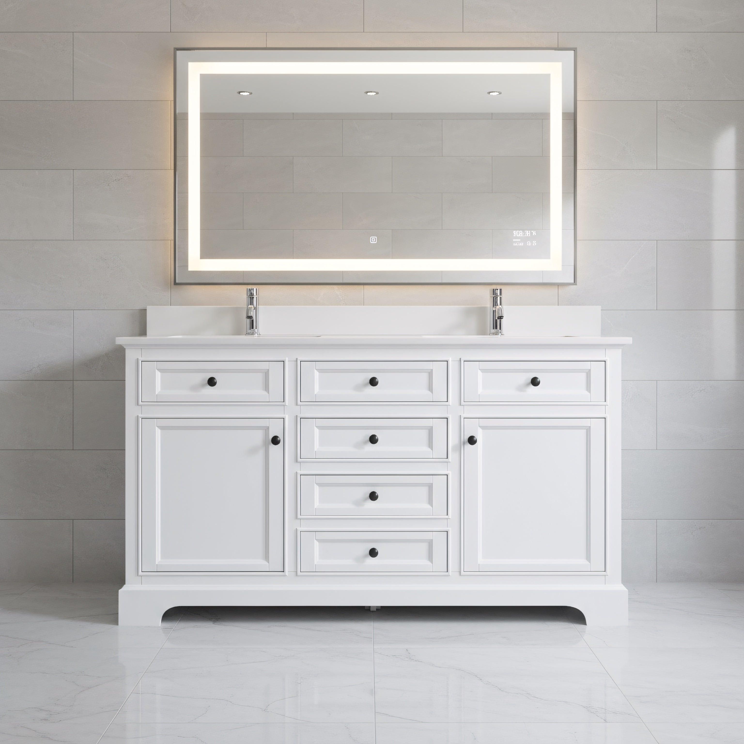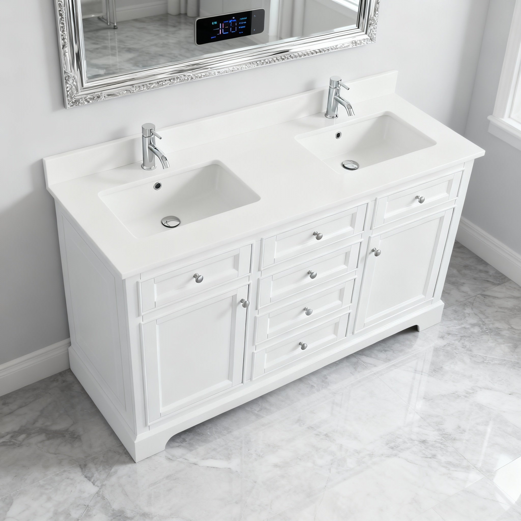 Meuble-Lavabo Autoportant 60po Blanc avec Comptoir de Quartz Blanc Solide