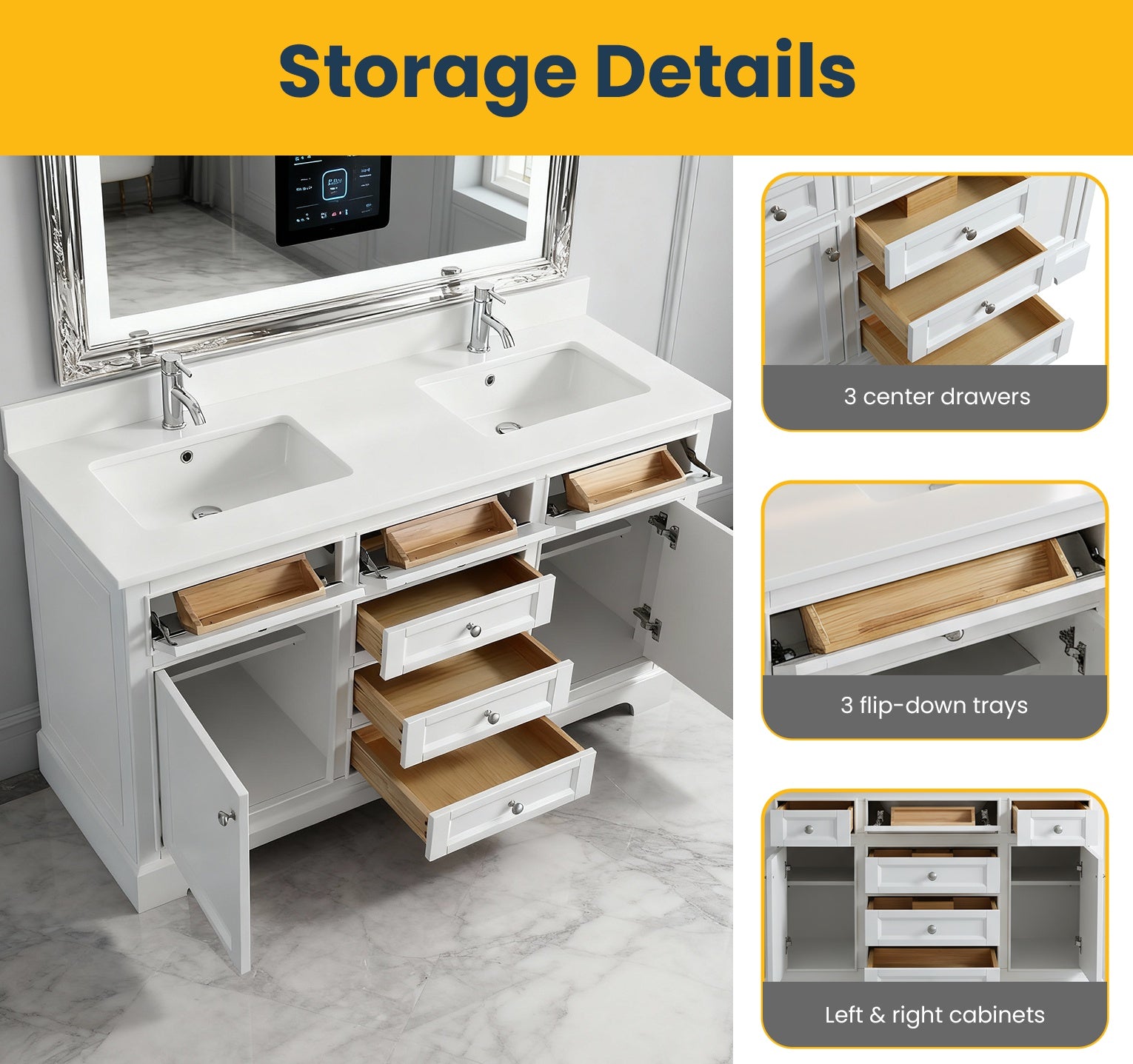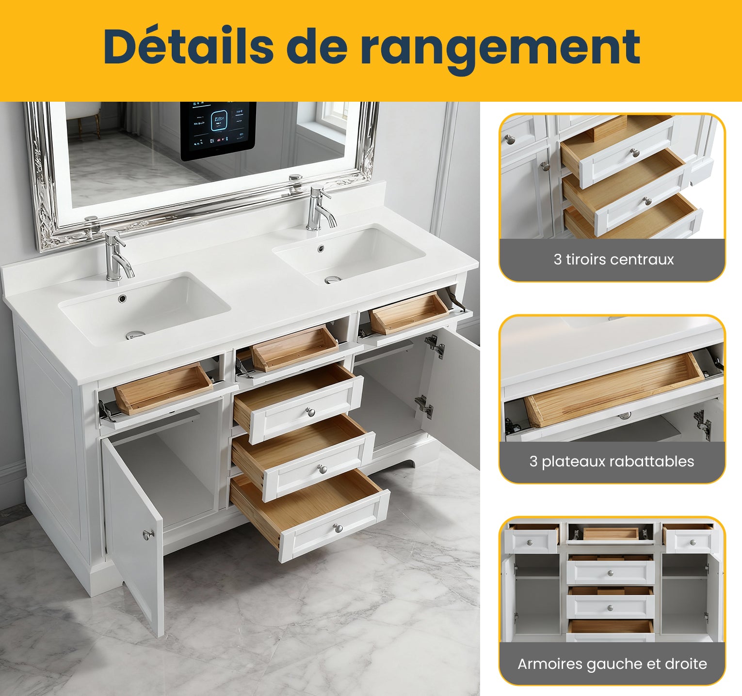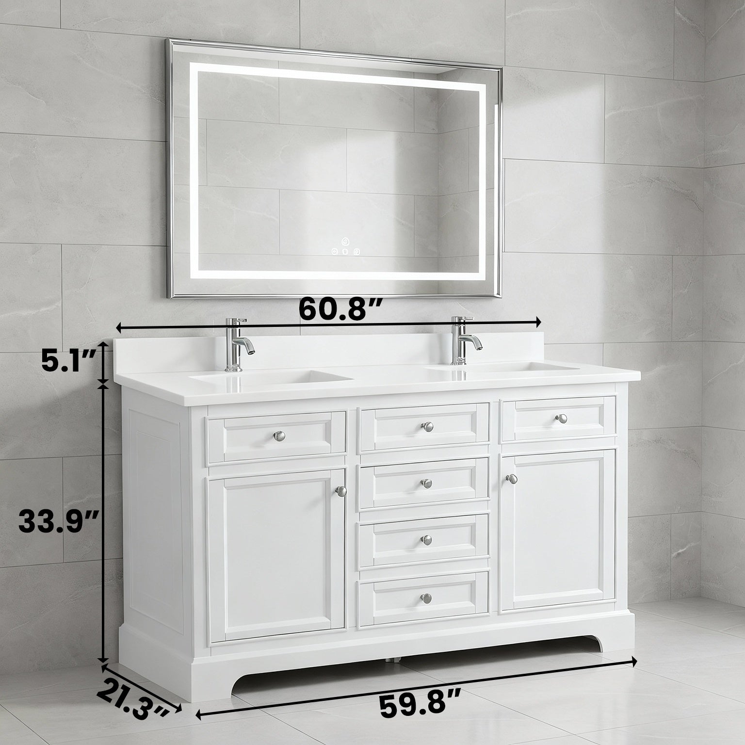 Meuble-Lavabo Autoportant 60po Blanc avec Comptoir de Quartz Blanc Solide