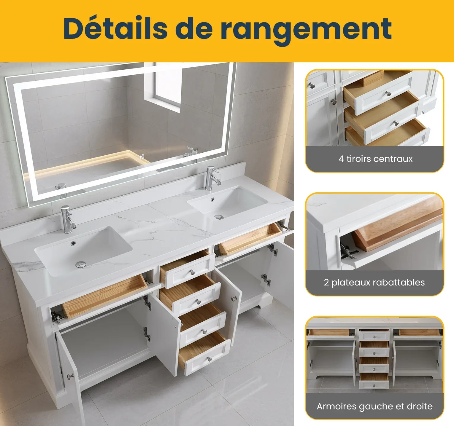 Cette approche sur mesure garantit que, que vous rénoviez votre maison dans une ville animée ou dans une campagne tranquille, Golden Elite Deco rend la réception de votre nouvelle vanité de salle de bain pratique, claire et sans stress.