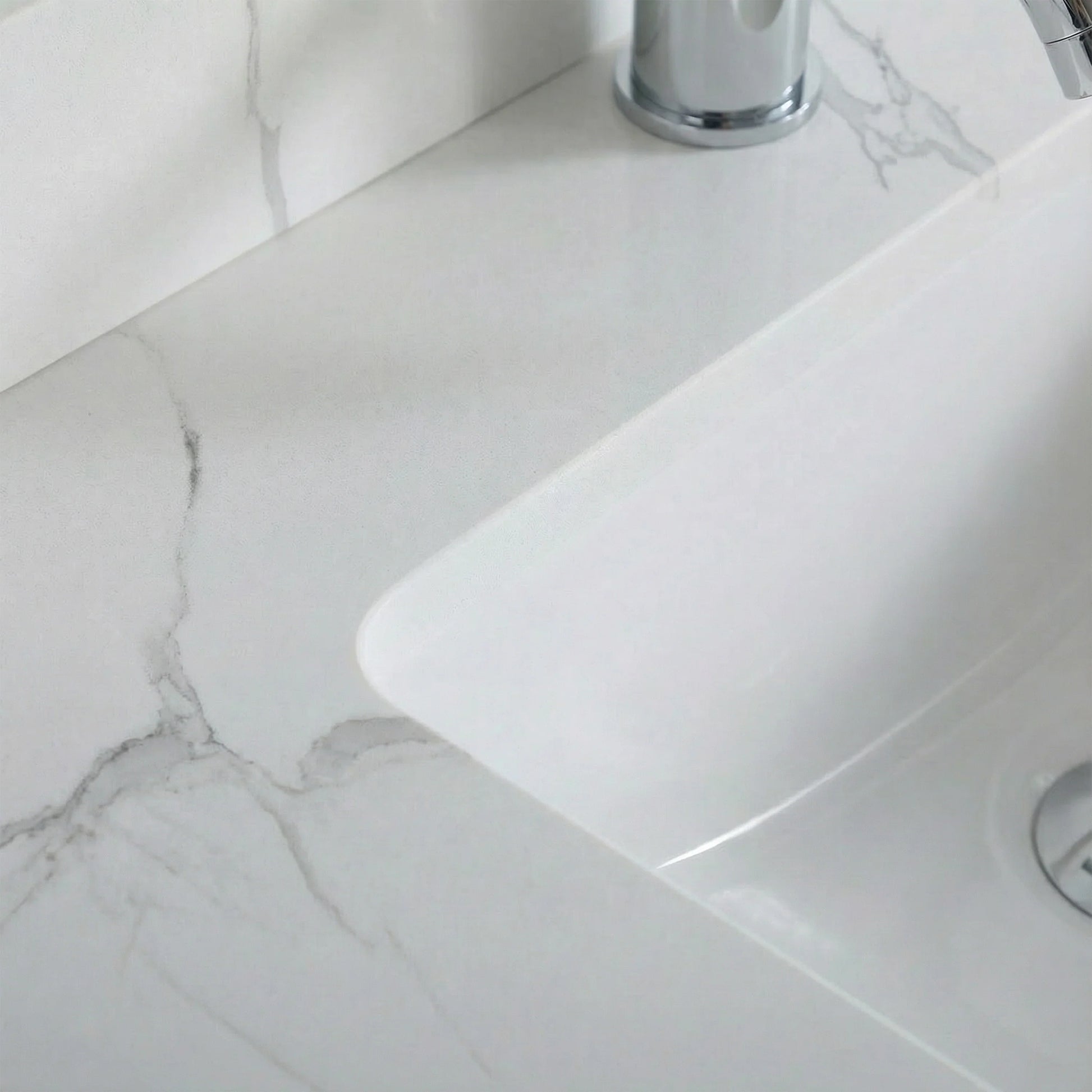 Mella présente une construction en bois massif, des panneaux latéraux en MDF et des tiroirs avec des mécanismes de fermeture en douceur pour une simplicité d'utilisation. Son plateau en marbre Carrera blanc méticuleusement choisi démontre l'excellence en matière de qualité et de savoir-faire et est poli pour une apparence améliorée. Connue pour sa simplicité, la collection Golden Elite Carmela est entièrement équipée d'un évier en porcelaine pré-monté certifié CUPC, d'un dosseret en marbre assorti de 4" de haut, pré-percé pour un robinet mono, de pieds réglables et d'un drain escamotable.