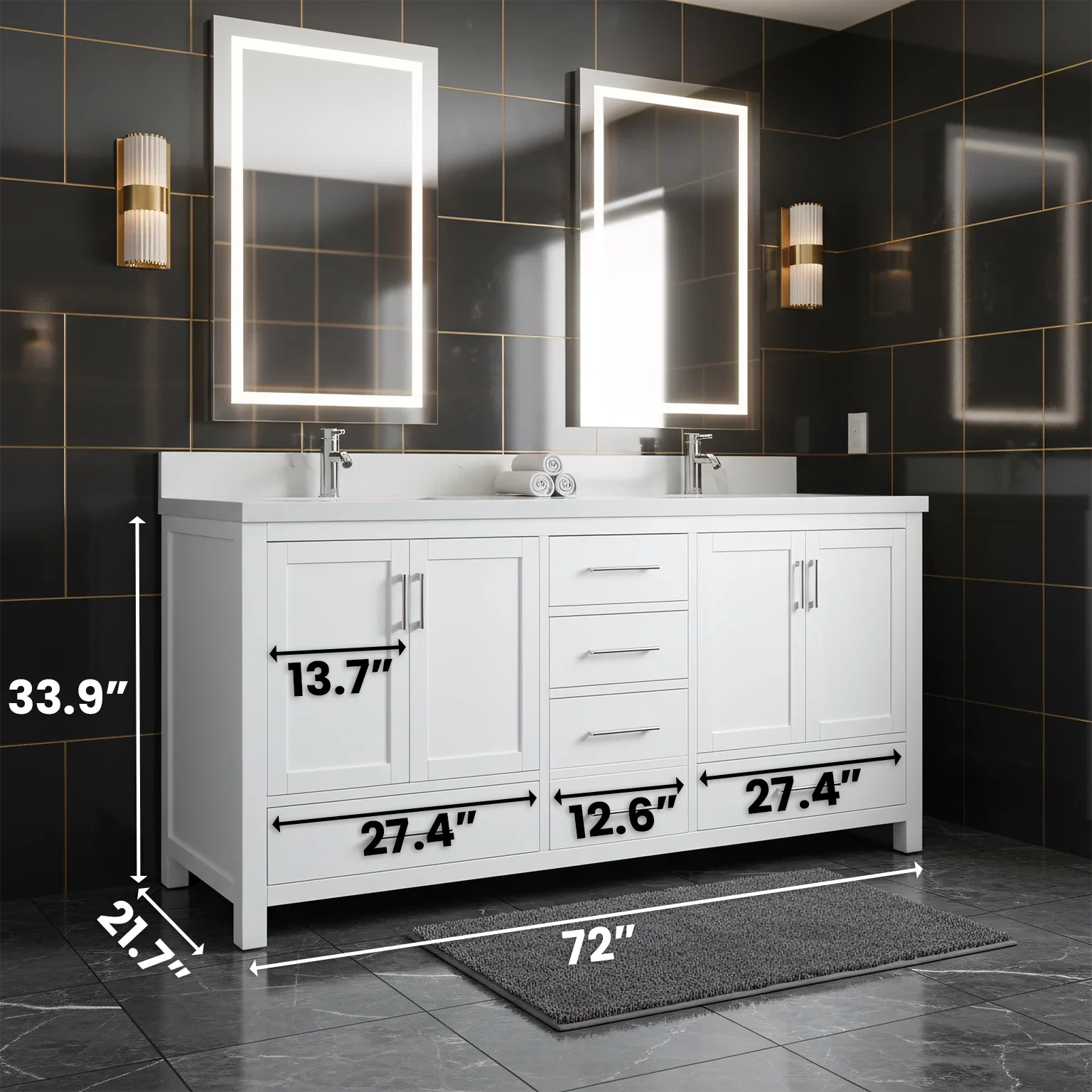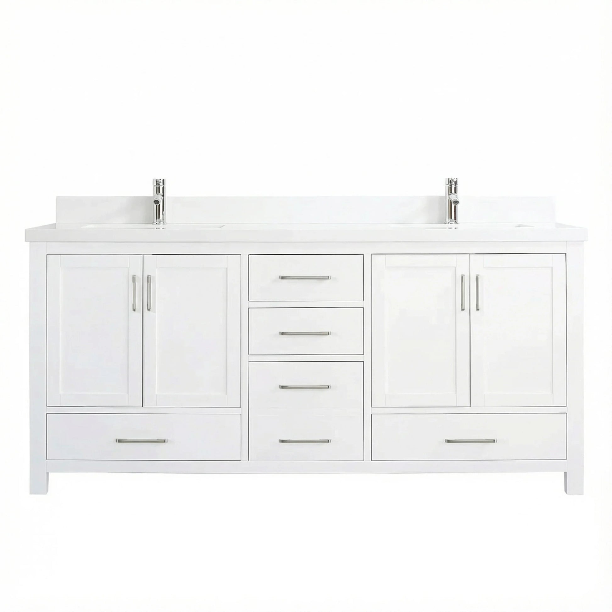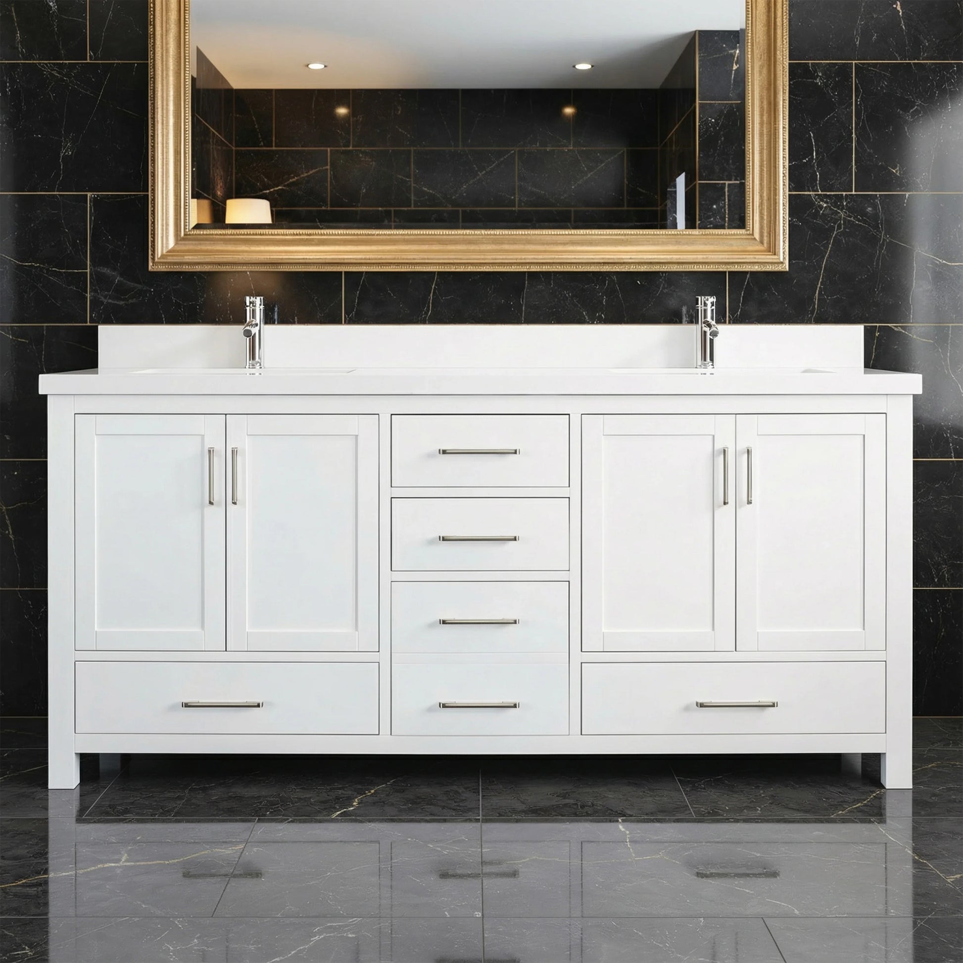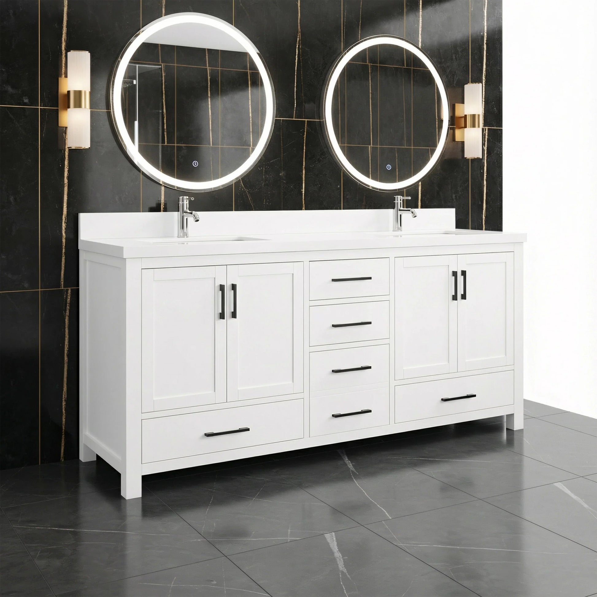 Meuble-lavabo double sur pied blanc de 72 po avec comptoir en marbre blanc reconstitué