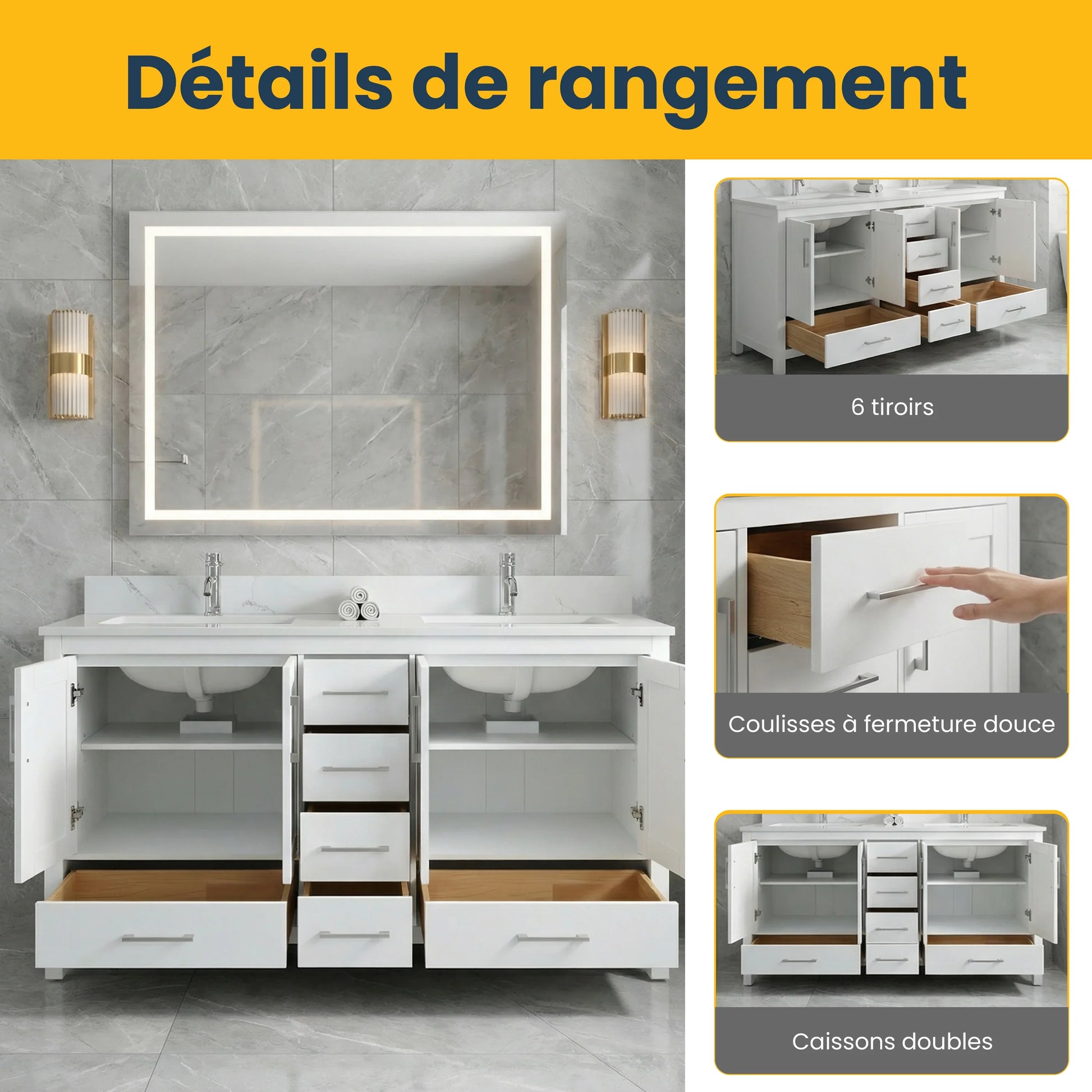Cette approche sur mesure garantit que, que vous rénoviez votre maison dans une ville animée ou dans une campagne tranquille, Golden Elite Deco rend la réception de votre nouvelle vanité de salle de bain pratique, claire et sans stress.