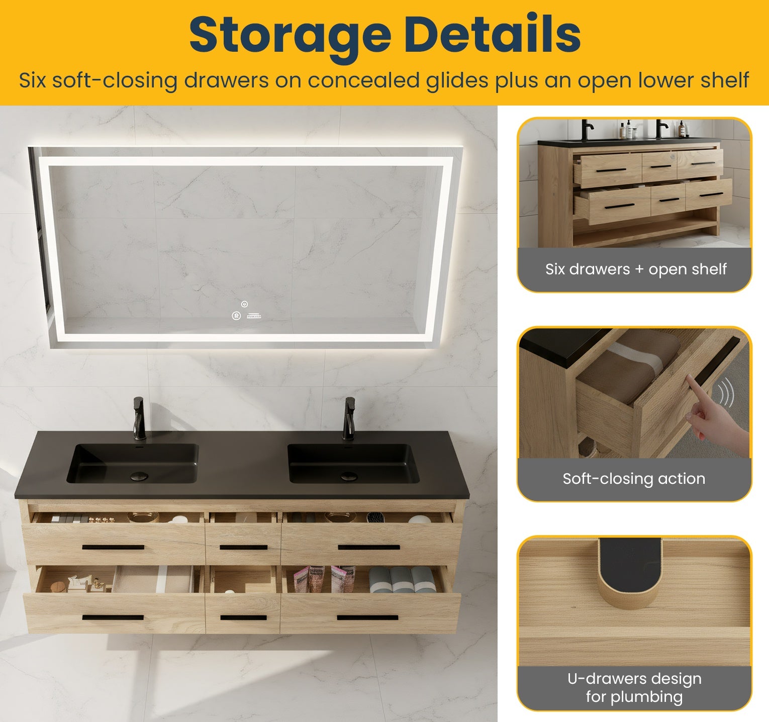Fiory, la nouvelle collection de meubles-lavabos autoportants Golden Elite, ajoute un look contemporain à toute salle de bain. Conçu pour vous offrir un grand espace de rangement, le grand meuble-lavabo est doté de rangements ouverts et dissimulés pour optimiser l'organisation. Les tiroirs de vanité à fermeture douce avec poignées noires mates offrent une expérience silencieuse et élégante. Les tiroirs sont spécialement conçus pour accueillir la plomberie et vous offrir le plus d'espace de rangement possible dans votre vanité.