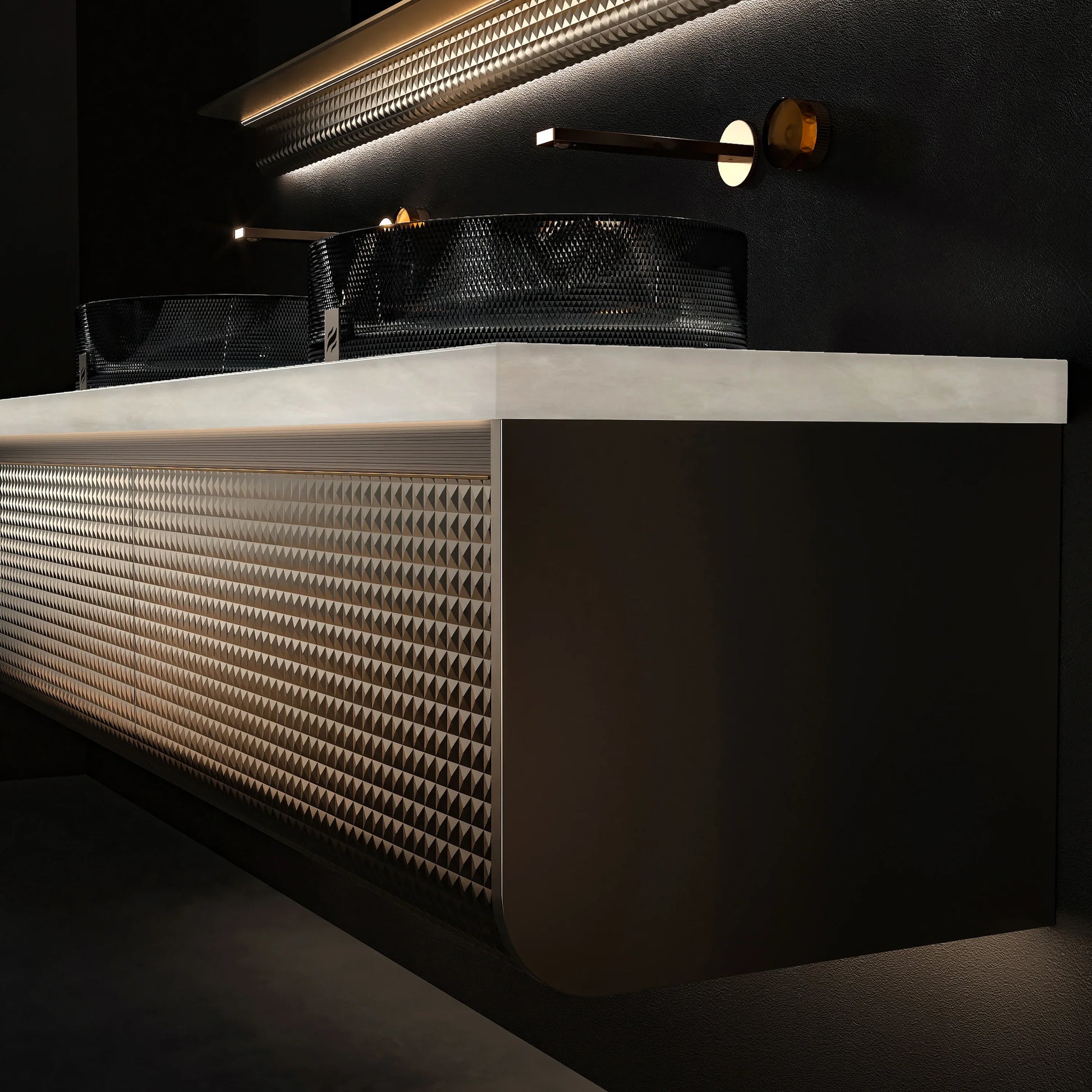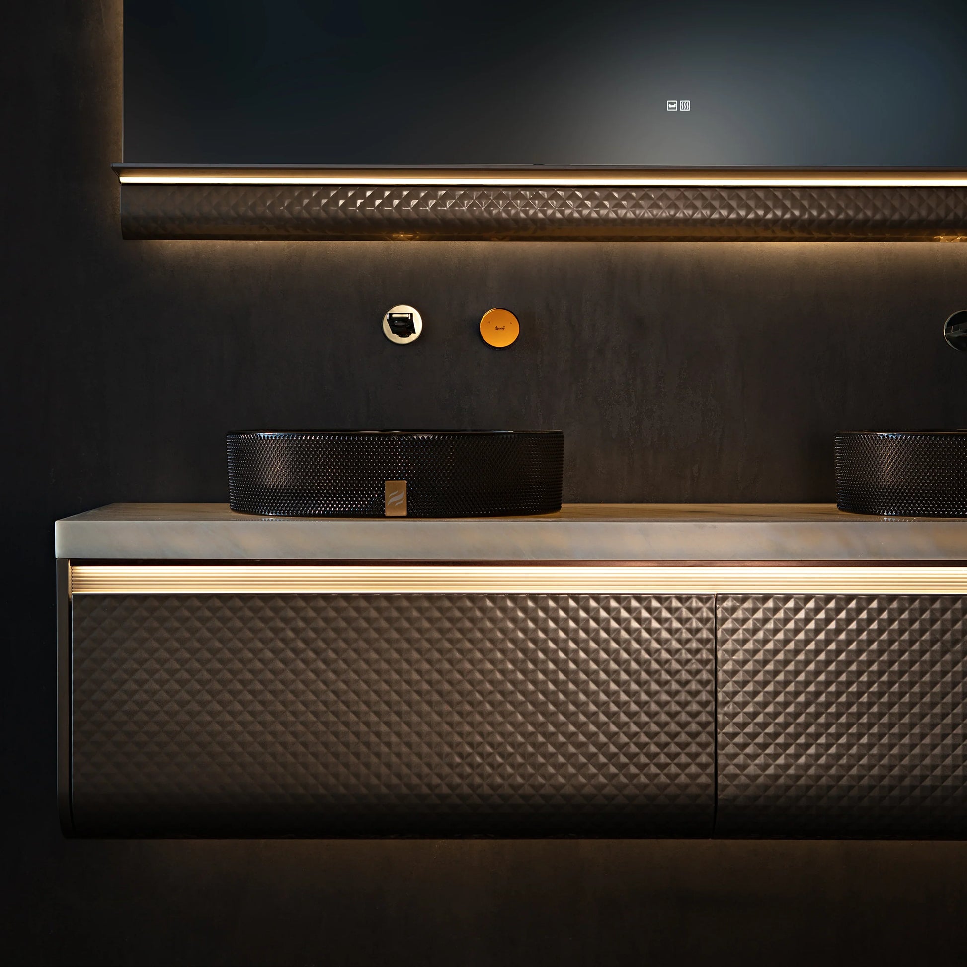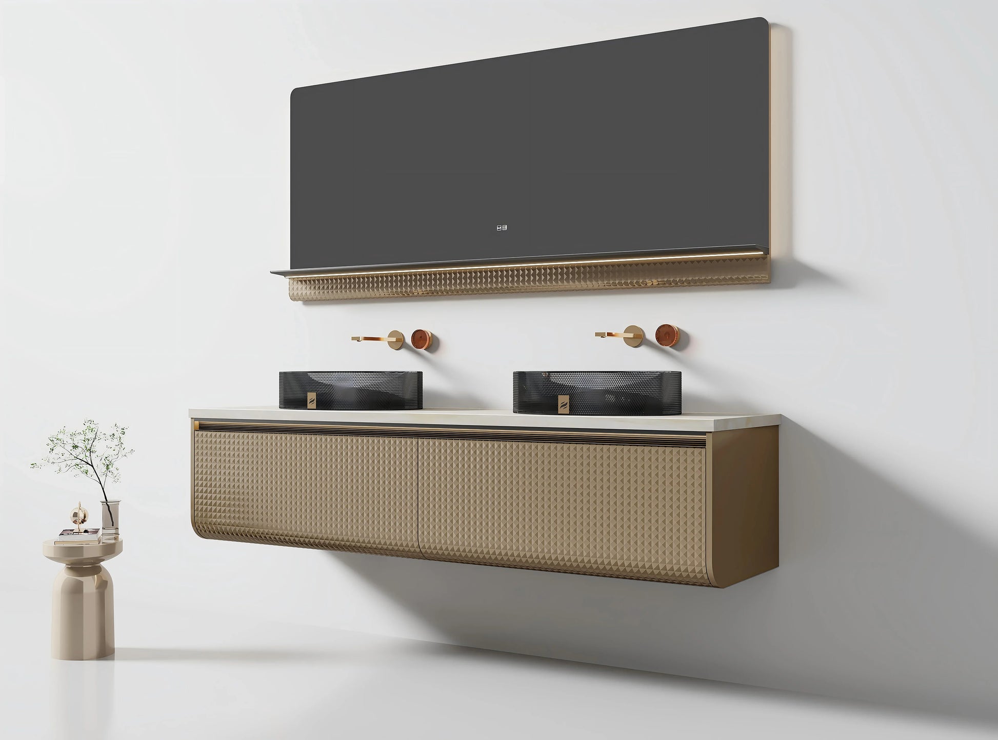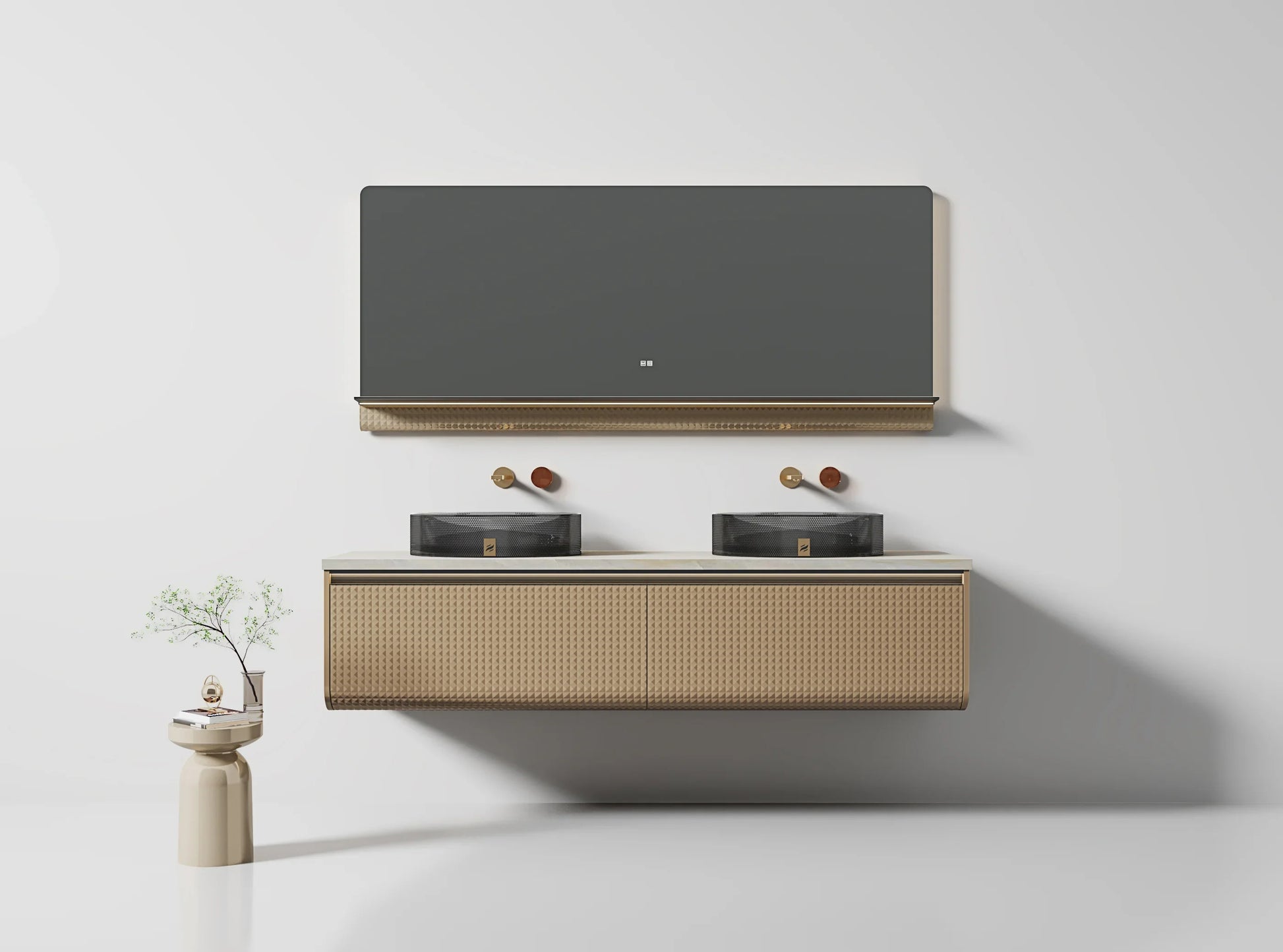 Meuble-lavabo Mural DEL 72 po Champagne avec Comptoir en Marbre Jade Blanc Royal et Double Vasques en Cristal