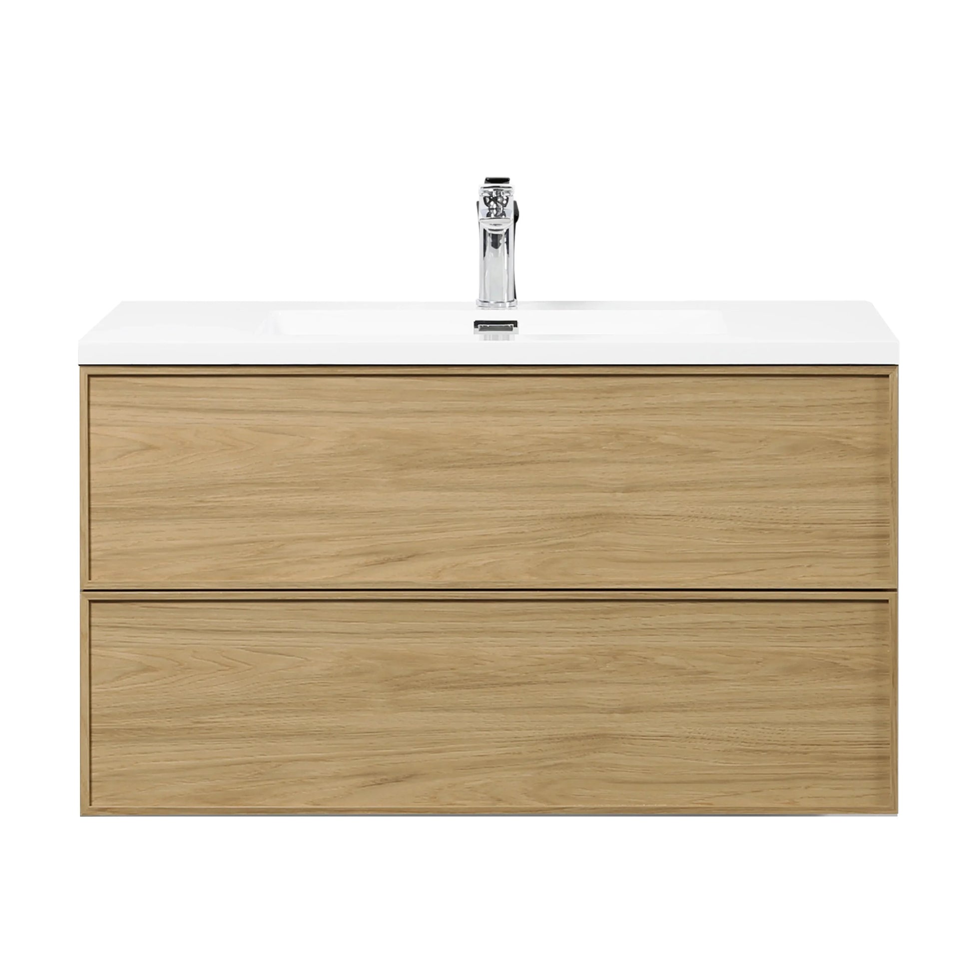 Les glissières à fermeture douce de conception allemande assurent une opération silencieuse et fluide pour des années. Le comptoir est pré-percé pour robinet à trou unique. Dimensions : 36po (L) x 19po (P) x 19,63po (H) — rangement généreux dans un format compact idéal pour les salles de bain modernes.