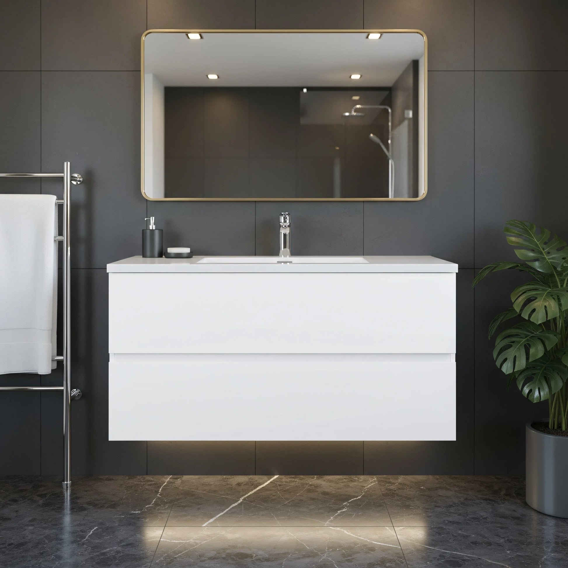 Transformez votre salle de bain en un espace moderne et élégant avec le meuble-lavabo mural Edge de 40po en blanc lustré. Cette magnifique vanité flottante arbore un fini blanc brillant qui apporte une touche contemporaine à n'importe quel décor. Son design minimaliste met en valeur deux grands tiroirs avec poignées intégrées, créant une esthétique épurée à la fois stylée et fonctionnelle.