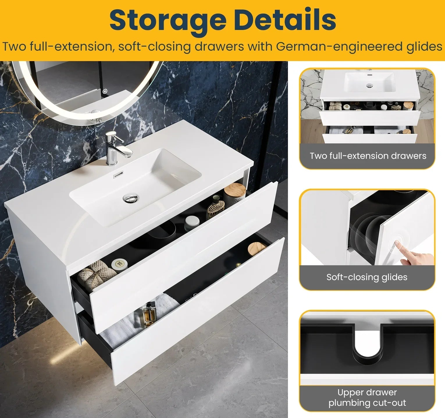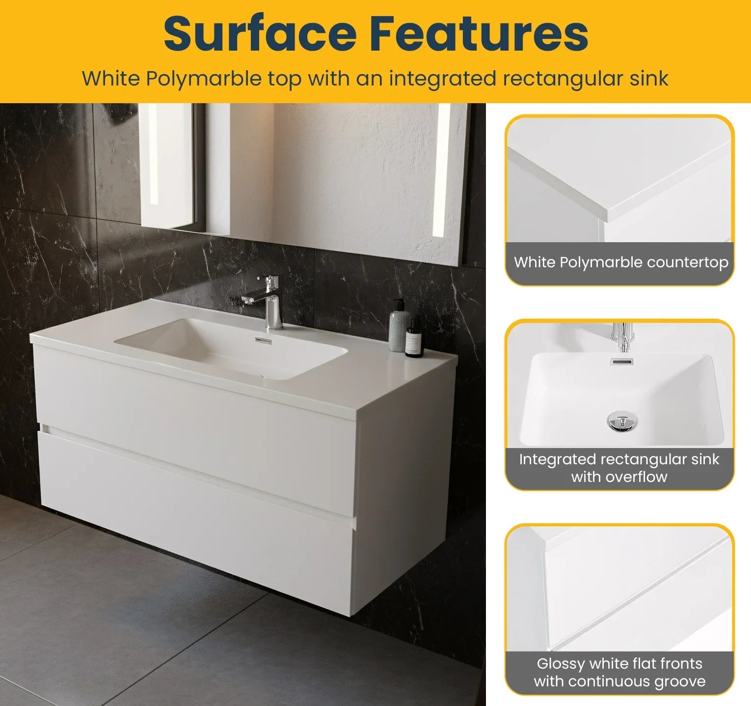 Fabriqué avec un cadre en PBC résistant à l'humidité et des façades de tiroirs en MDF, ce meuble-lavabo est conçu pour résister aux exigences quotidiennes. Le luxueux comptoir en polymarbre blanc comprend un lavabo rectangulaire intégré avec trop-plein, pré-percé pour robinetterie à trou unique. Les glissières de tiroirs à fermeture douce de conception allemande assurent un fonctionnement silencieux et fluide.