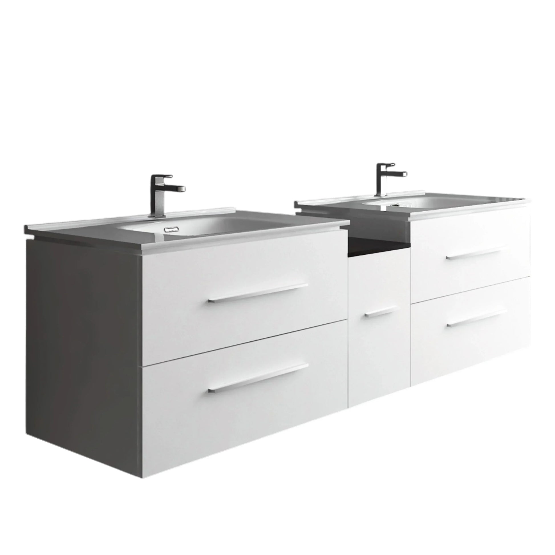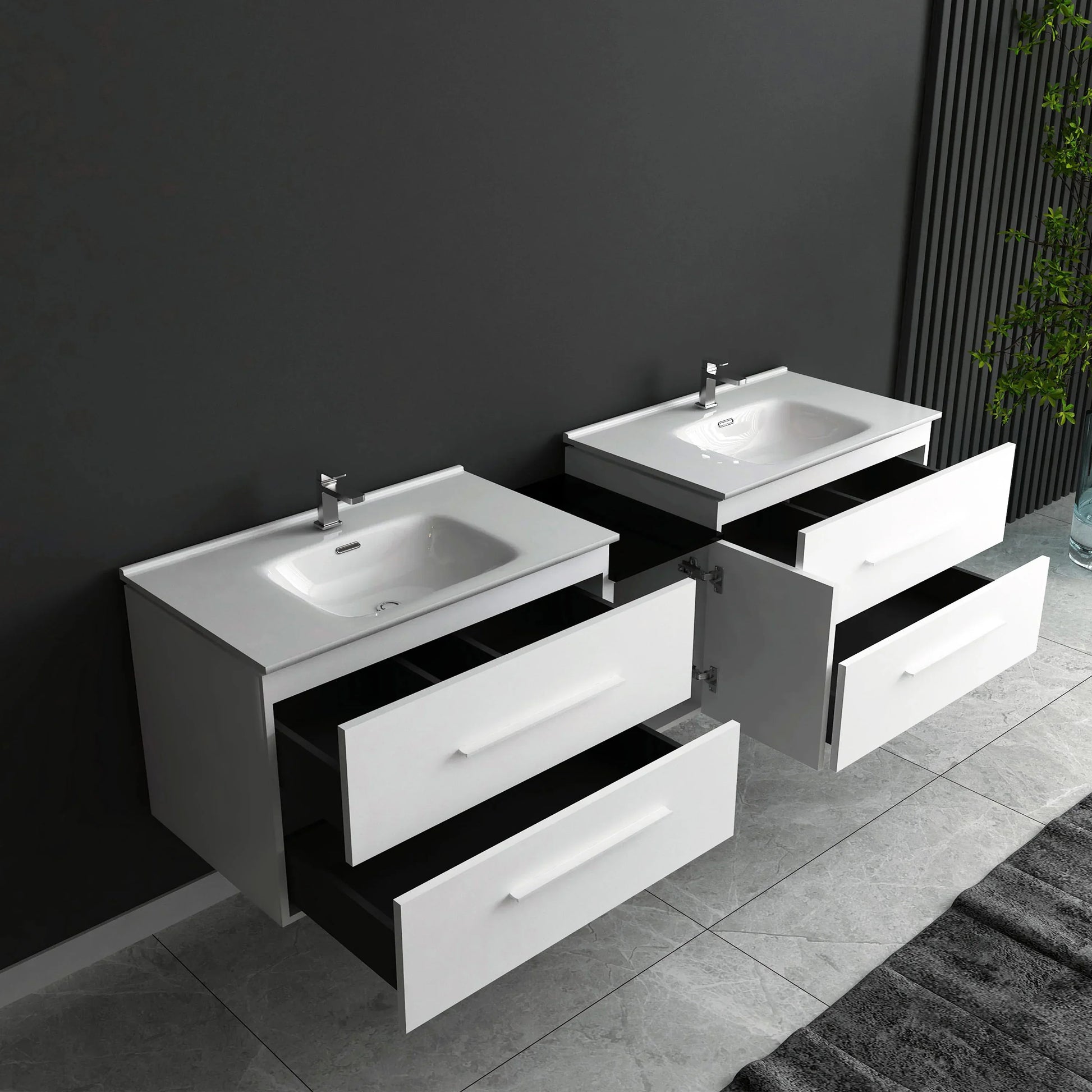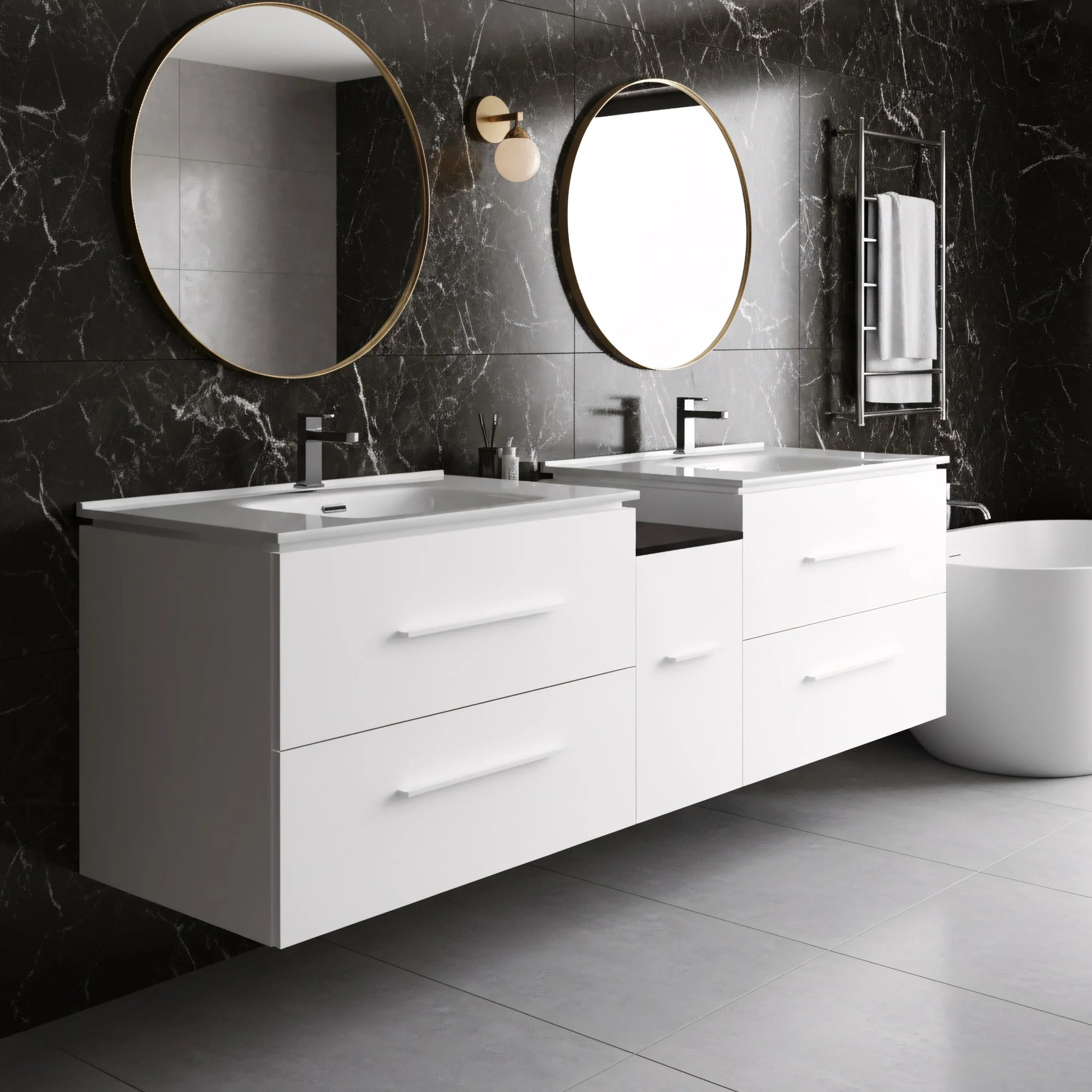 Présentation du Lido de Golden Elite, un meuble-lavabo flottant qui incarne le design moderne. Fabriqué avec excellence, ce meuble-lavabo présente deux tiroirs « intelligents » à fermeture en douceur parfaitement intégrés, intelligemment conçus pour accueillir la plomberie sans sacrifier l'espace de rangement.