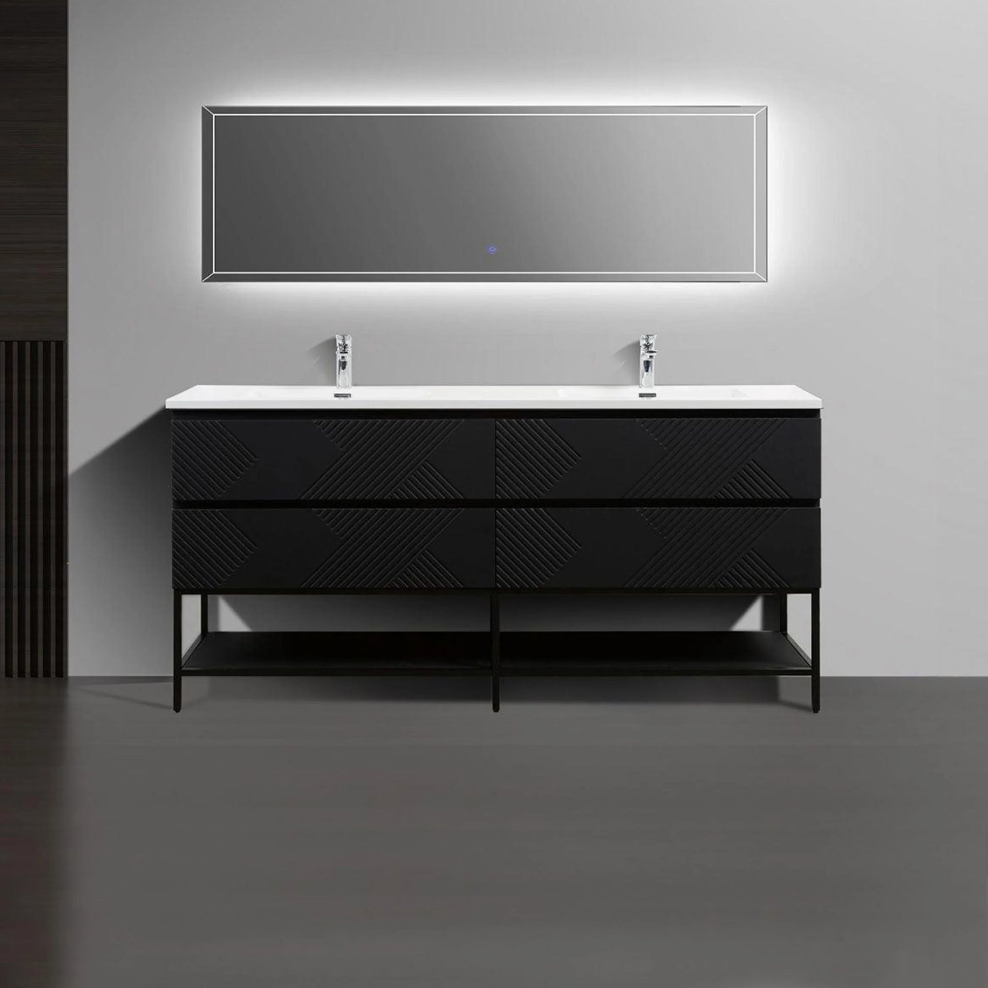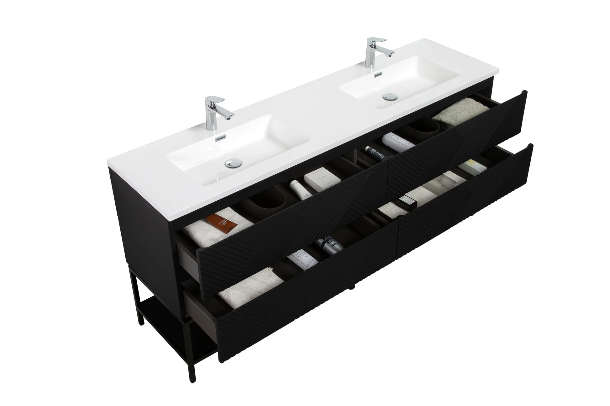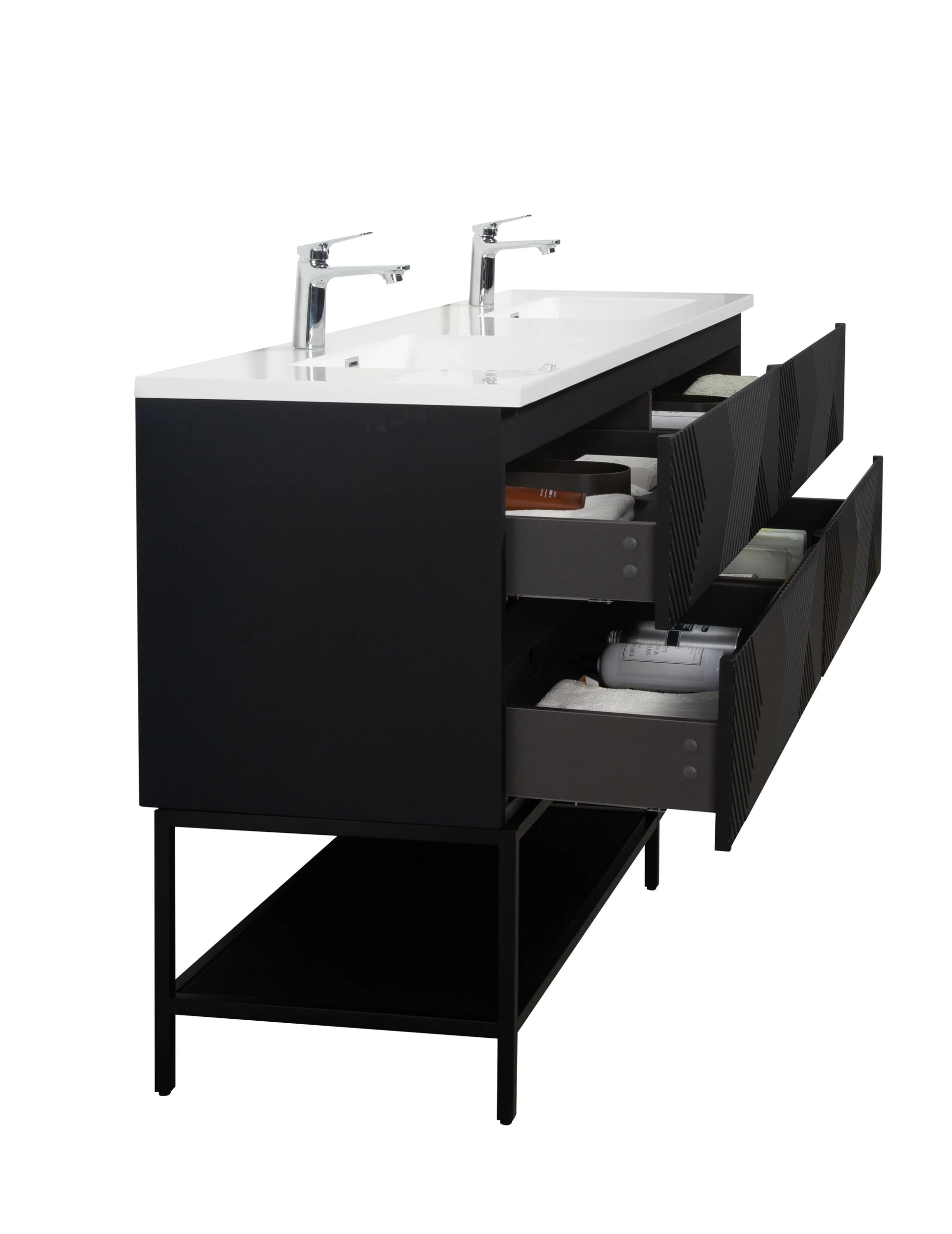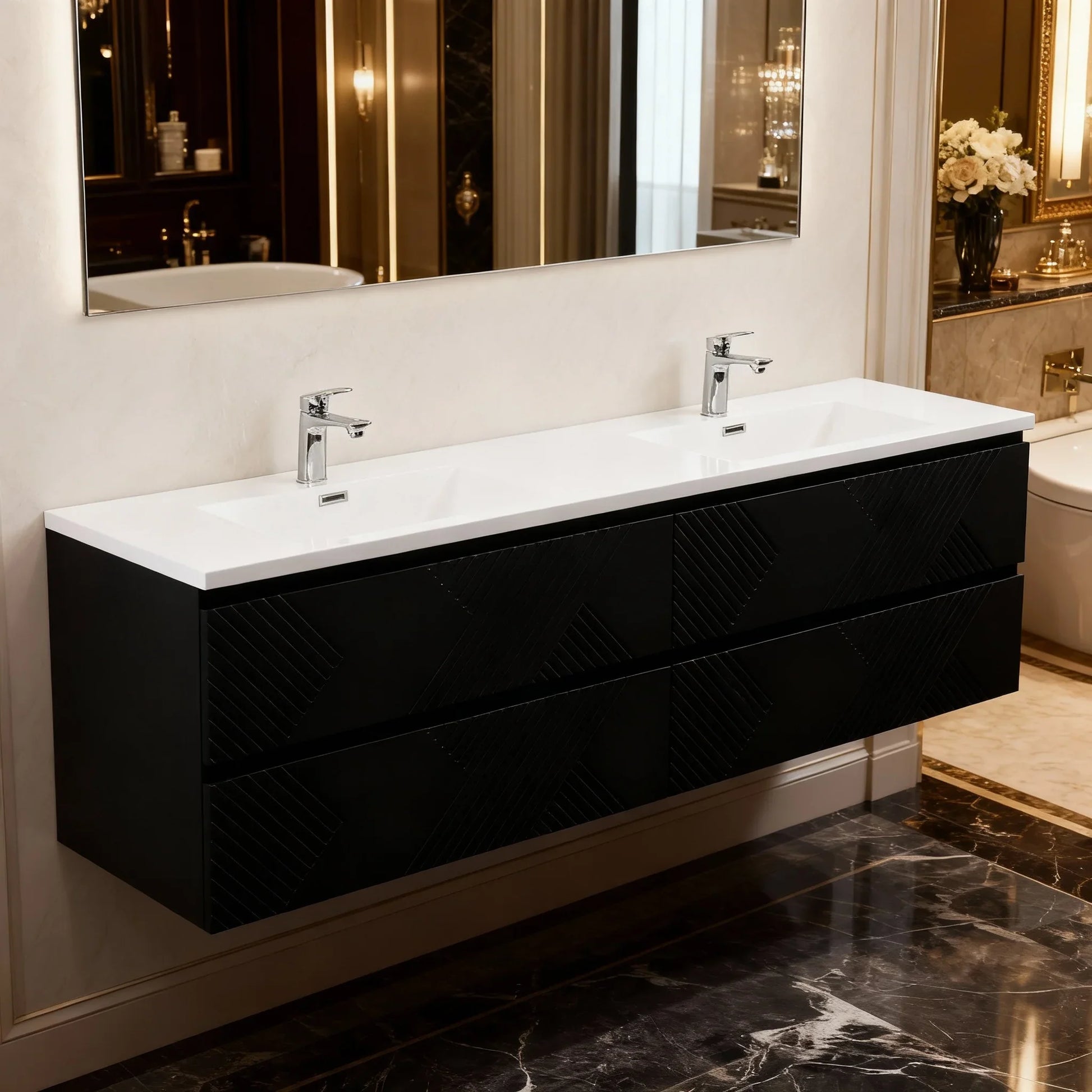 Meuble-lavabo double noir de 72" à fixer au mur avec Comptoir en polymarbre blanc
