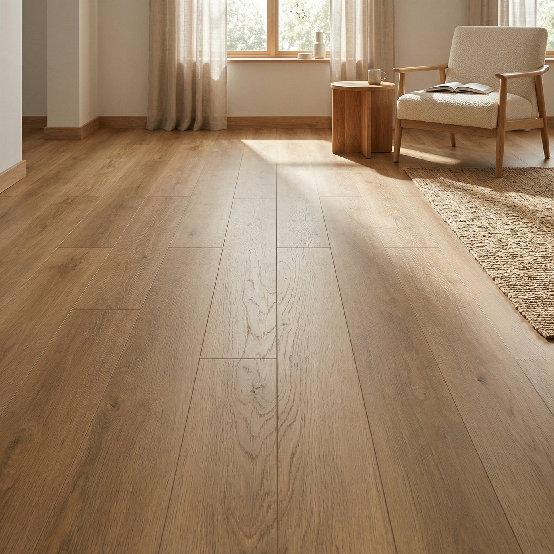 Ce plancher SPC Golden Coast offre l'apparence chaleureuse du chêne naturel — tons brun doré avec veinage authentique et détails de nœuds subtils visibles sur chaque planche. Format généreux de 9po x 60po avec système clic drop-down pour installation flottante rapide.