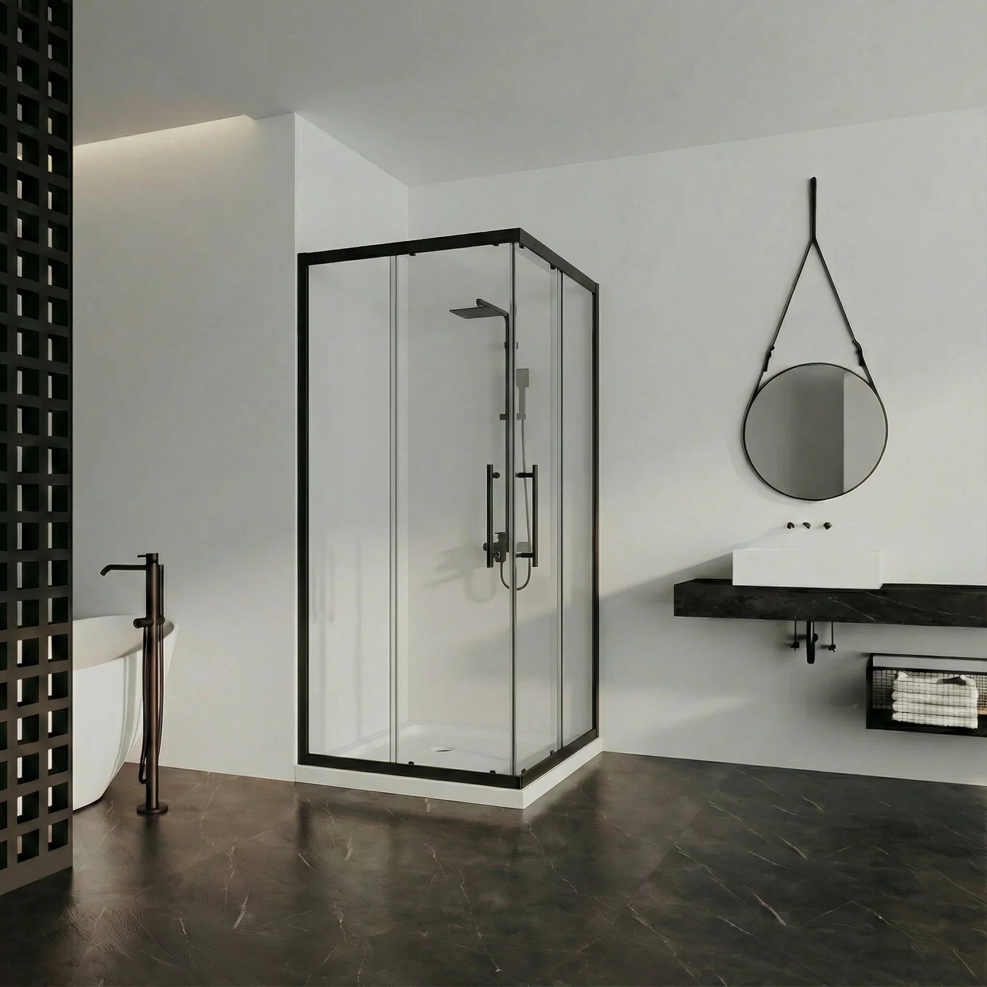 Le verre trempé transparent de 8mm crée une atmosphère lumineuse et spacieuse tout en assurant sécurité et durabilité. Le cadre en aluminium noir mat au fini contemporain s'harmonise parfaitement aux salles de bain modernes. Le mécanisme de fermeture magnétique assure une opération fluide et sécuritaire à chaque utilisation.