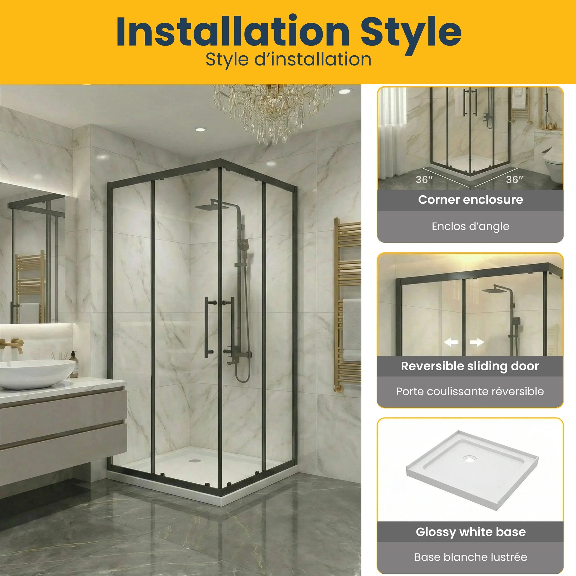 Porte de douche coin coulissante 36po x 36po noir mat avec base acrylique blanche
