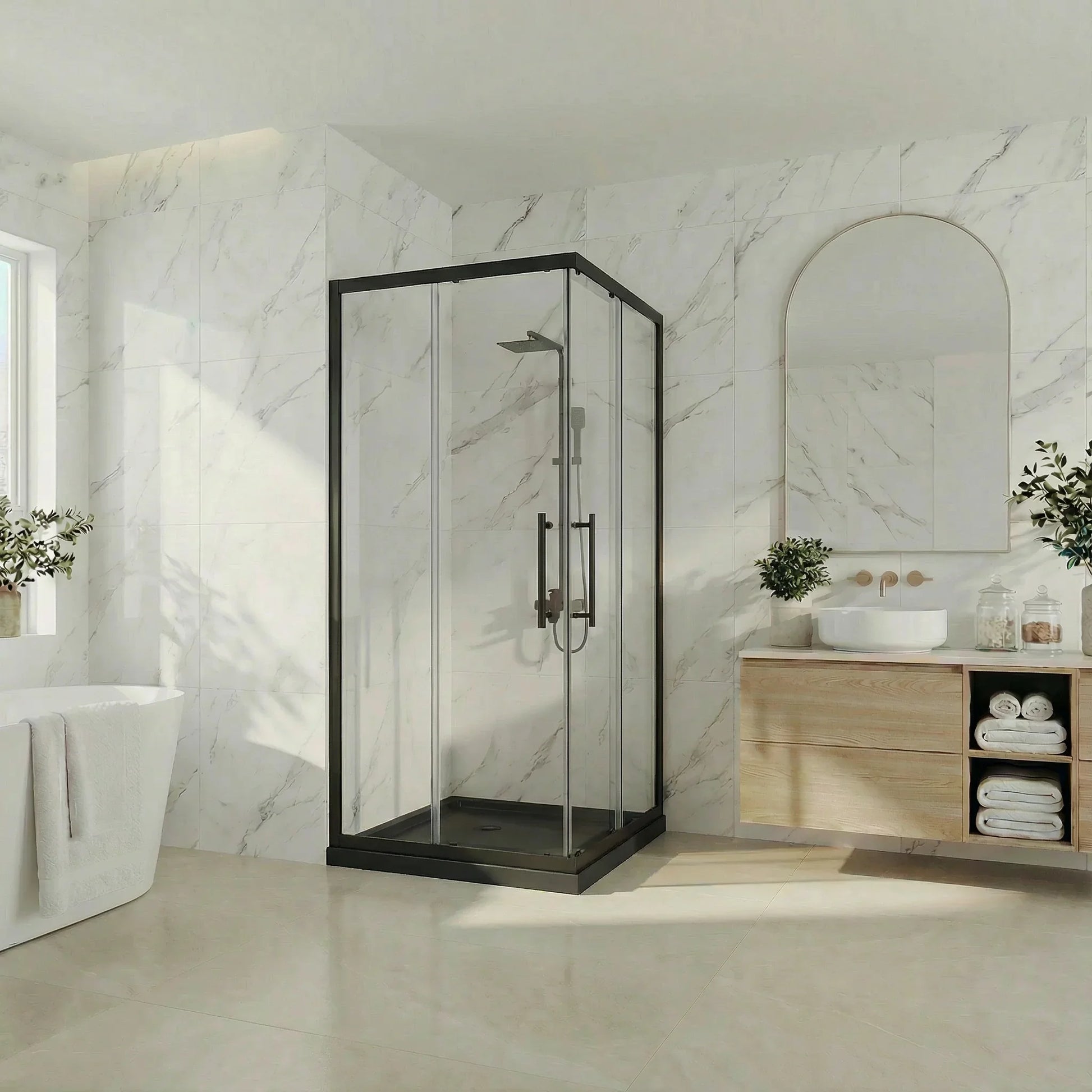 Transformez votre salle de bain en espace moderne avec cet ensemble douche de la Collection Byfield. Le cadre noir mat crée un contraste saisissant avec le verre trempé transparent de 8mm — ce look industriel-chic que les propriétaires montréalais recherchent.