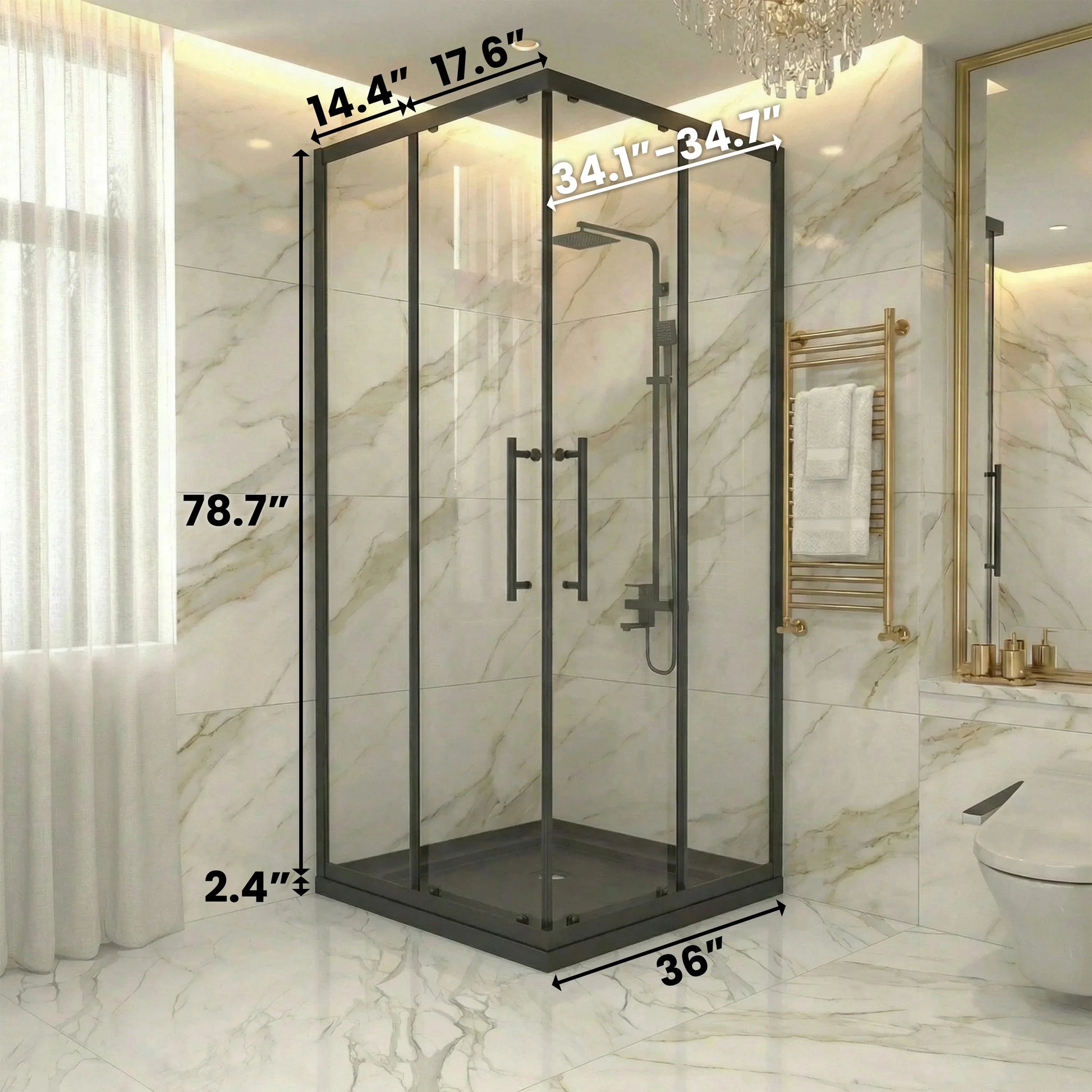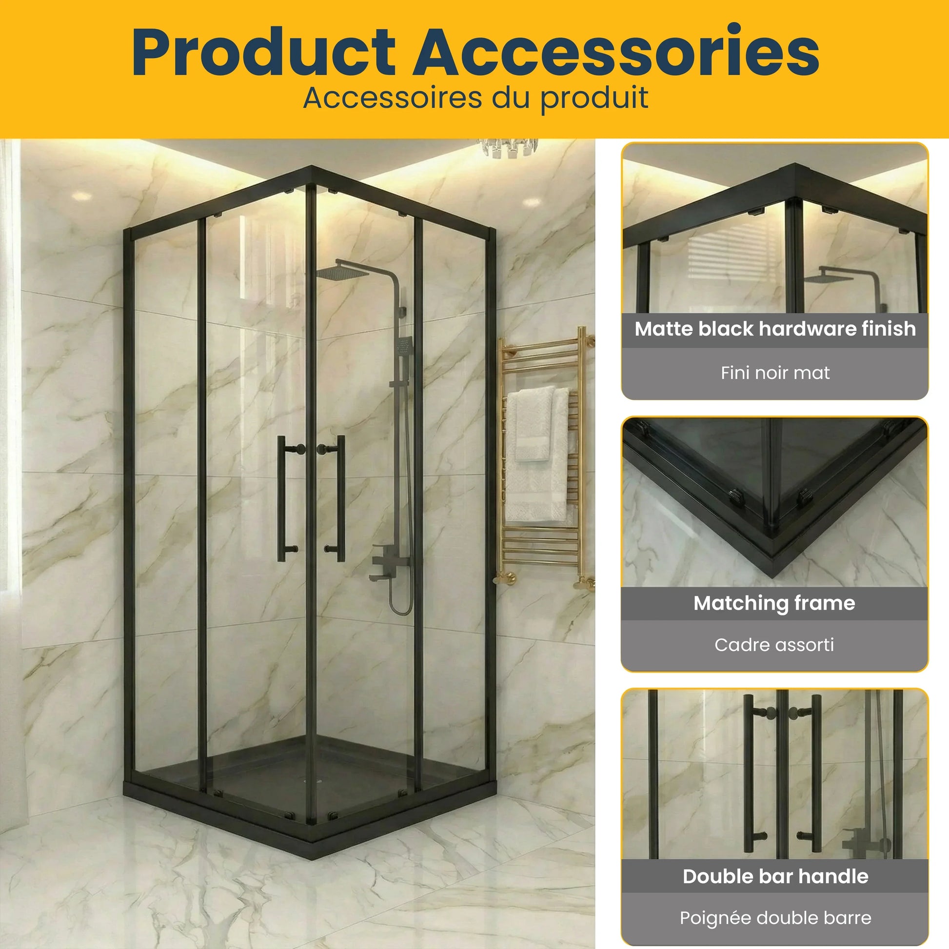 Cet ensemble complet pour installation en alcôve comprend une porte coulissante réversible de 36po (L) x 36po (P) x 79po (H) et une base de douche en acrylique noir brillant avec drain de coin. Le design réversible permet une installation flexible à gauche ou à droite selon votre configuration.