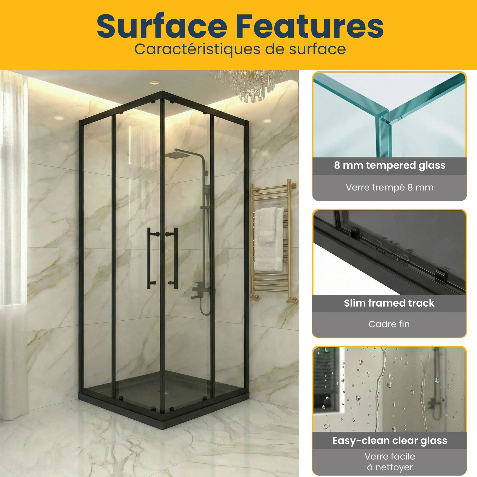 - Verre trempé sécuritaire de 8mm — épais, durable et facile à nettoyer