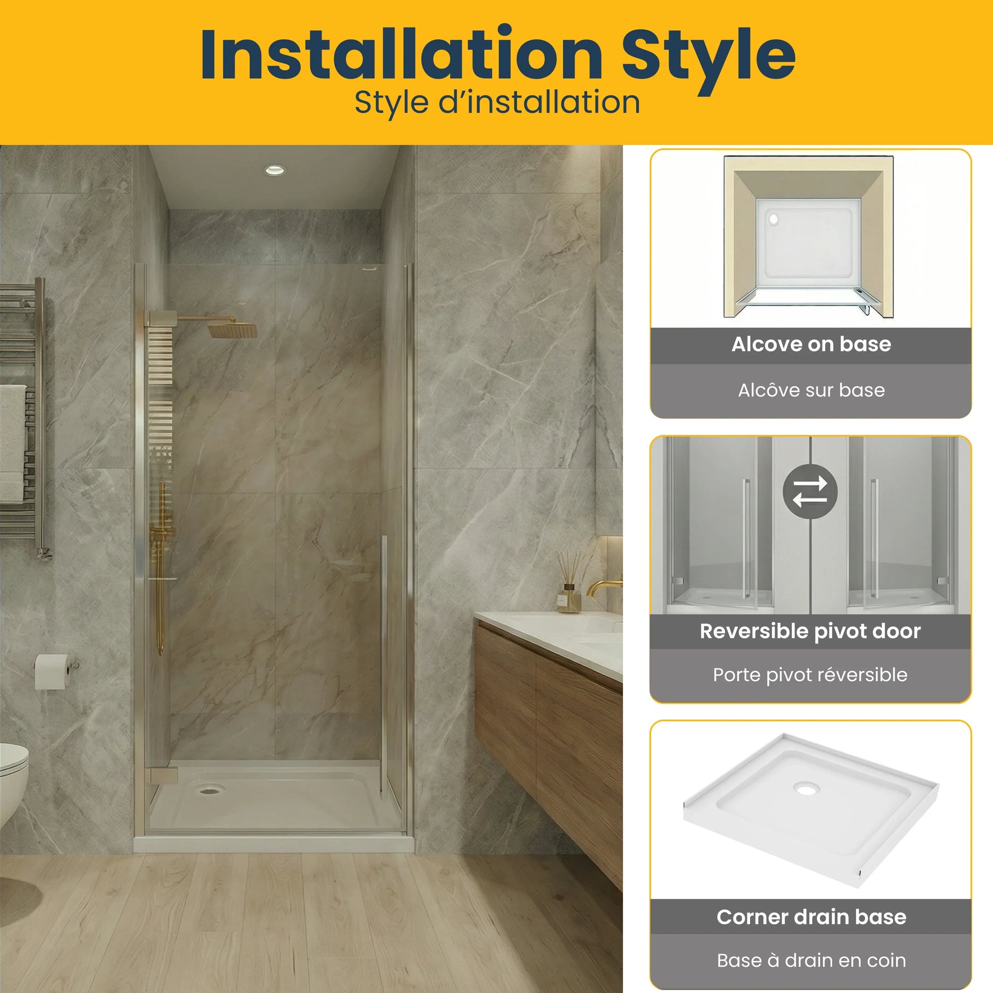 La base de douche en acrylique blanc brillant de 32po (L) x 32po (P) incluse dispose d'un drain de coin pratique et est compatible avec notre drain de douche ABS (vendu séparément). Cette installation d'alcôve complète offre une valeur exceptionnelle avec une garantie de 5 ans.