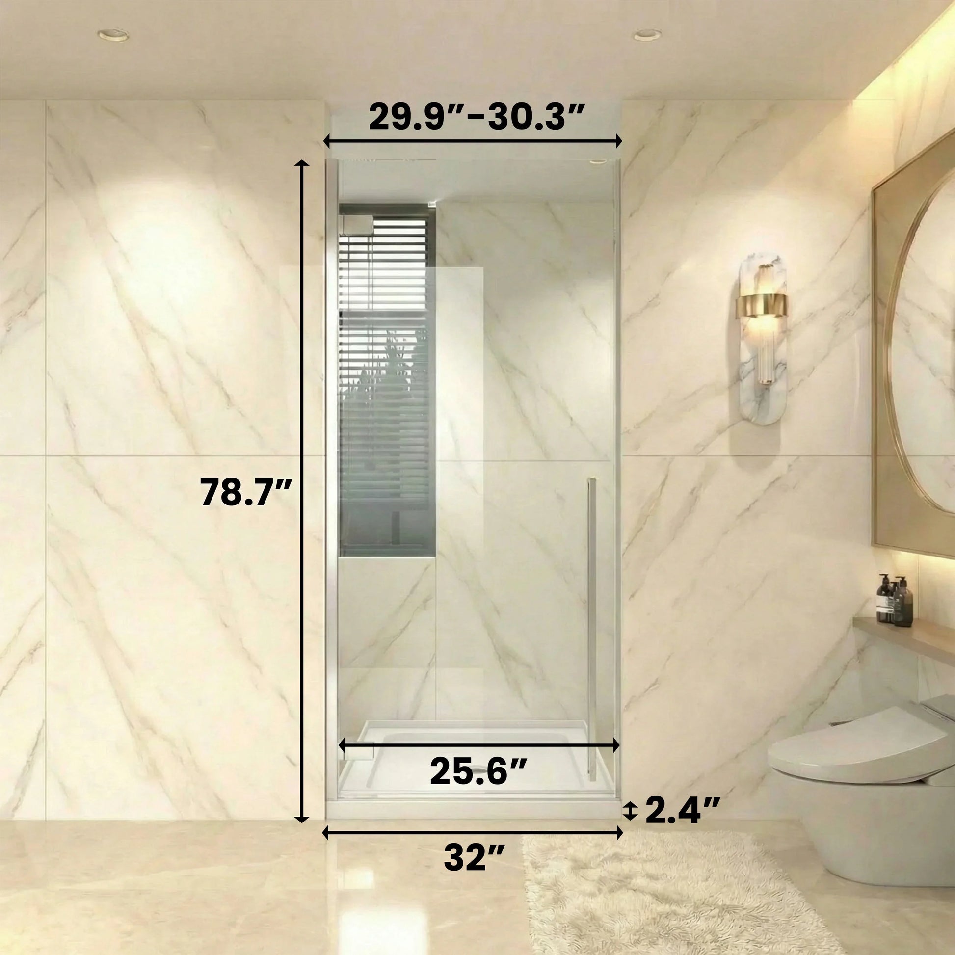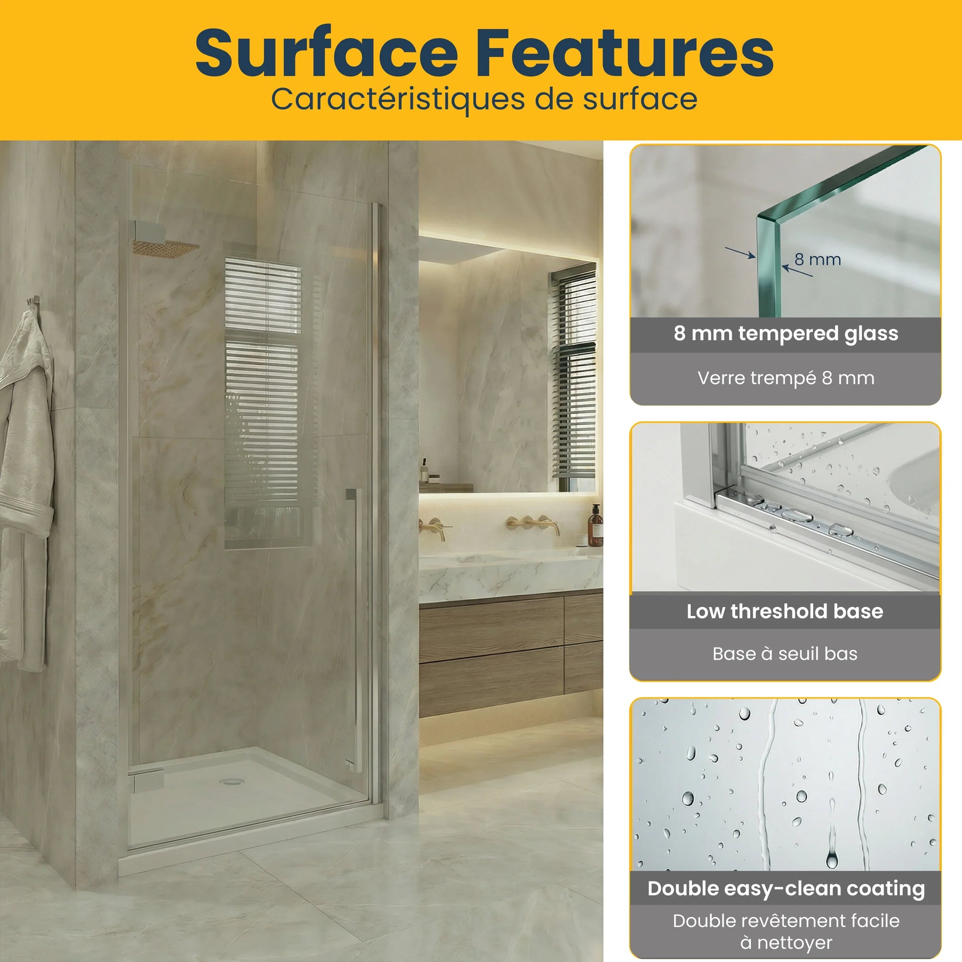 Transformez votre salle de bain en un havre de paix moderne avec cet ensemble de la Collection Divine. Cette porte de douche pivotante réversible de 32po (L) x 79po (H) en chrome poli avec verre trempé transparent de 8mm crée une atmosphère lumineuse et spacieuse.