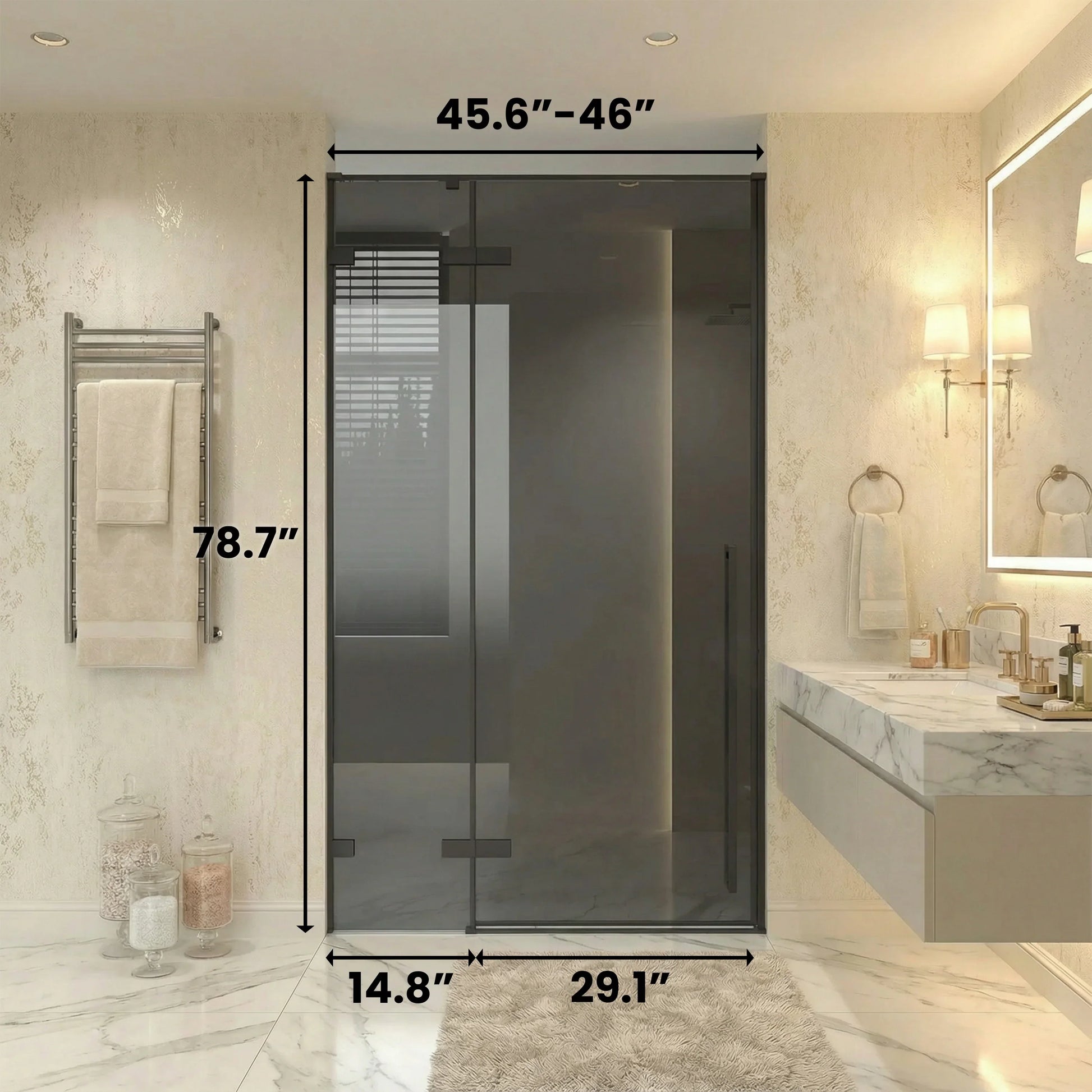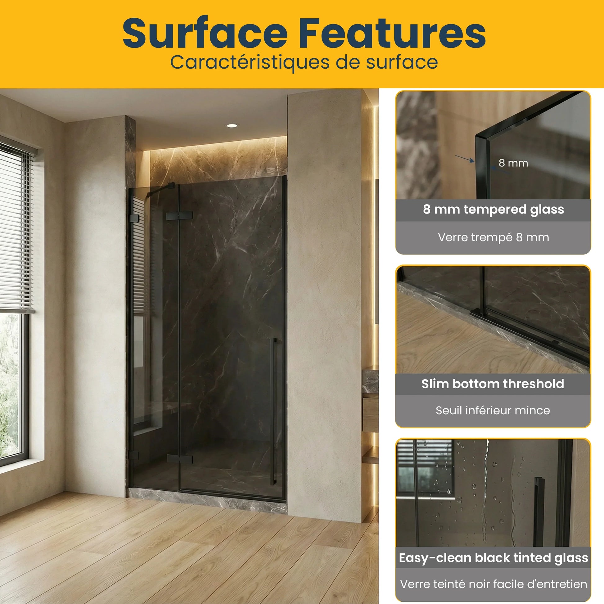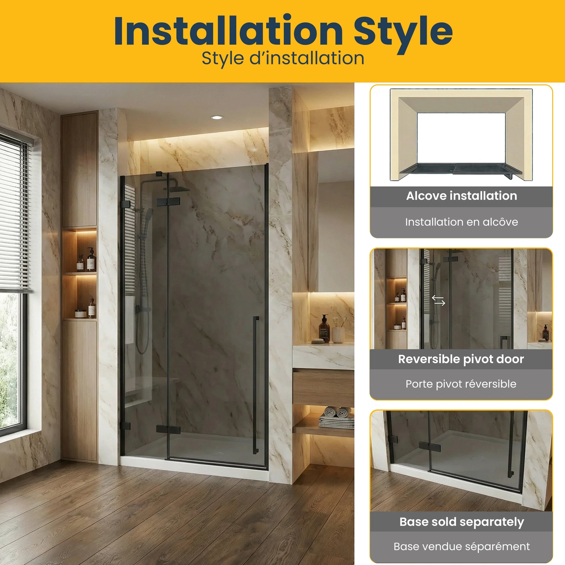 Transformez votre salle de bain avec la porte de douche pivotante réversible Divine Collection de 48po x 79po, mettant en vedette un cadre noir mat élégant et un verre teinté noir sophistiqué. Cette porte de douche en alcôve allie design minimaliste contemporain et fonctionnalité exceptionnelle, créant un point focal saisissant dans toute salle de bain moderne.