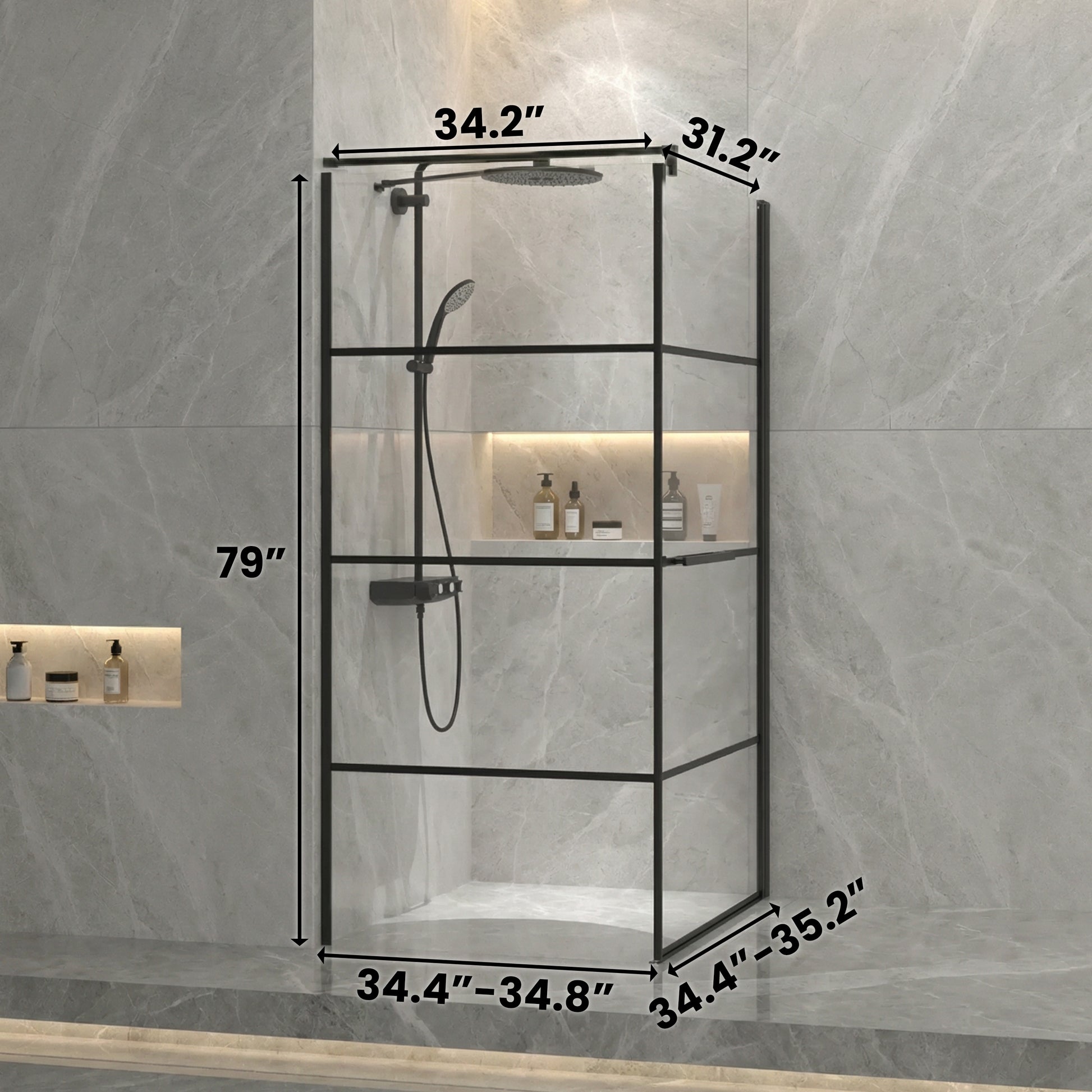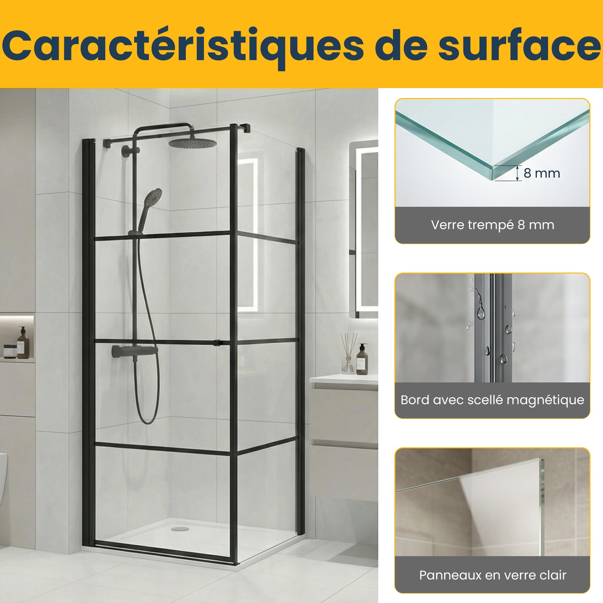 Avec une hauteur de 79po, cette cabine s'adapte parfaitement aux installations de coin standard. La porte pivotante réversible s'ouvre en douceur grâce à des charnières de qualité et comprend un système de fermeture magnétique et douce pour une opération silencieuse. Le revêtement protecteur facilite le nettoyage au quotidien.