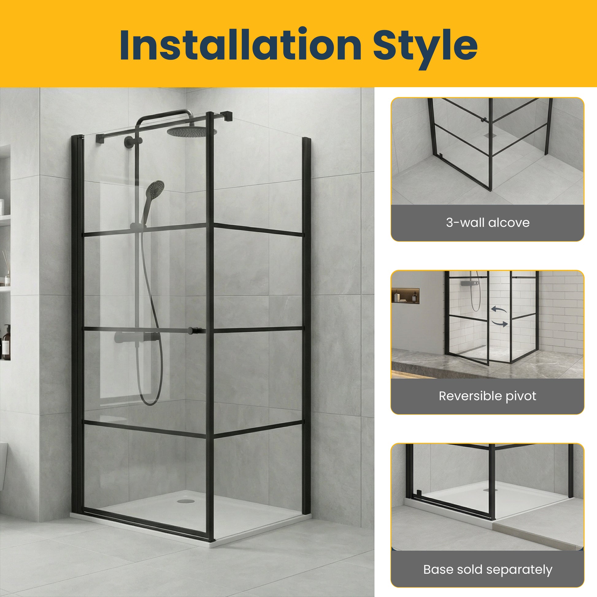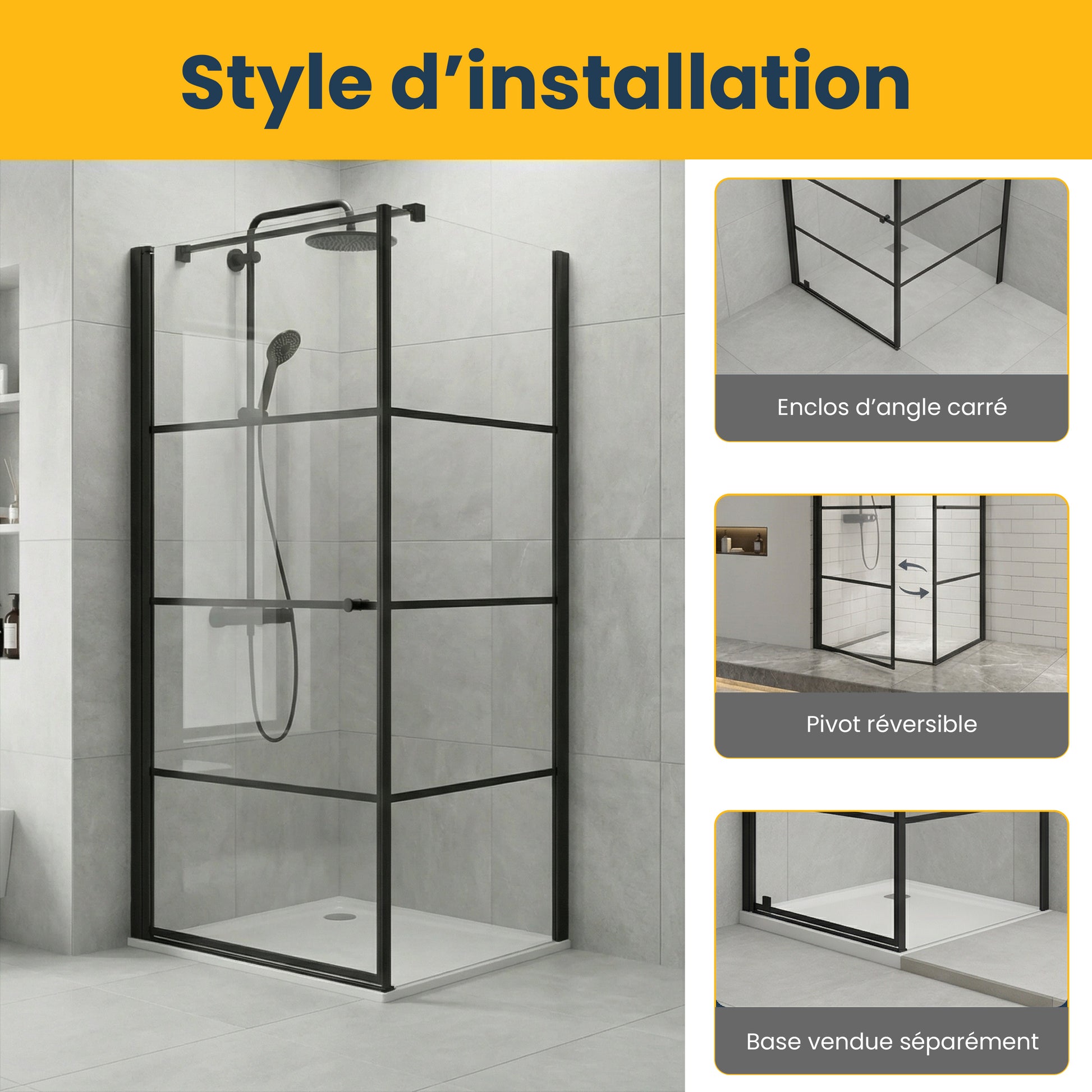 Base de douche vendue séparément. Cette cabine s'agence parfaitement avec nos bases de douche acryliques et est compatible avec notre drain de douche ABS pour une installation complète.