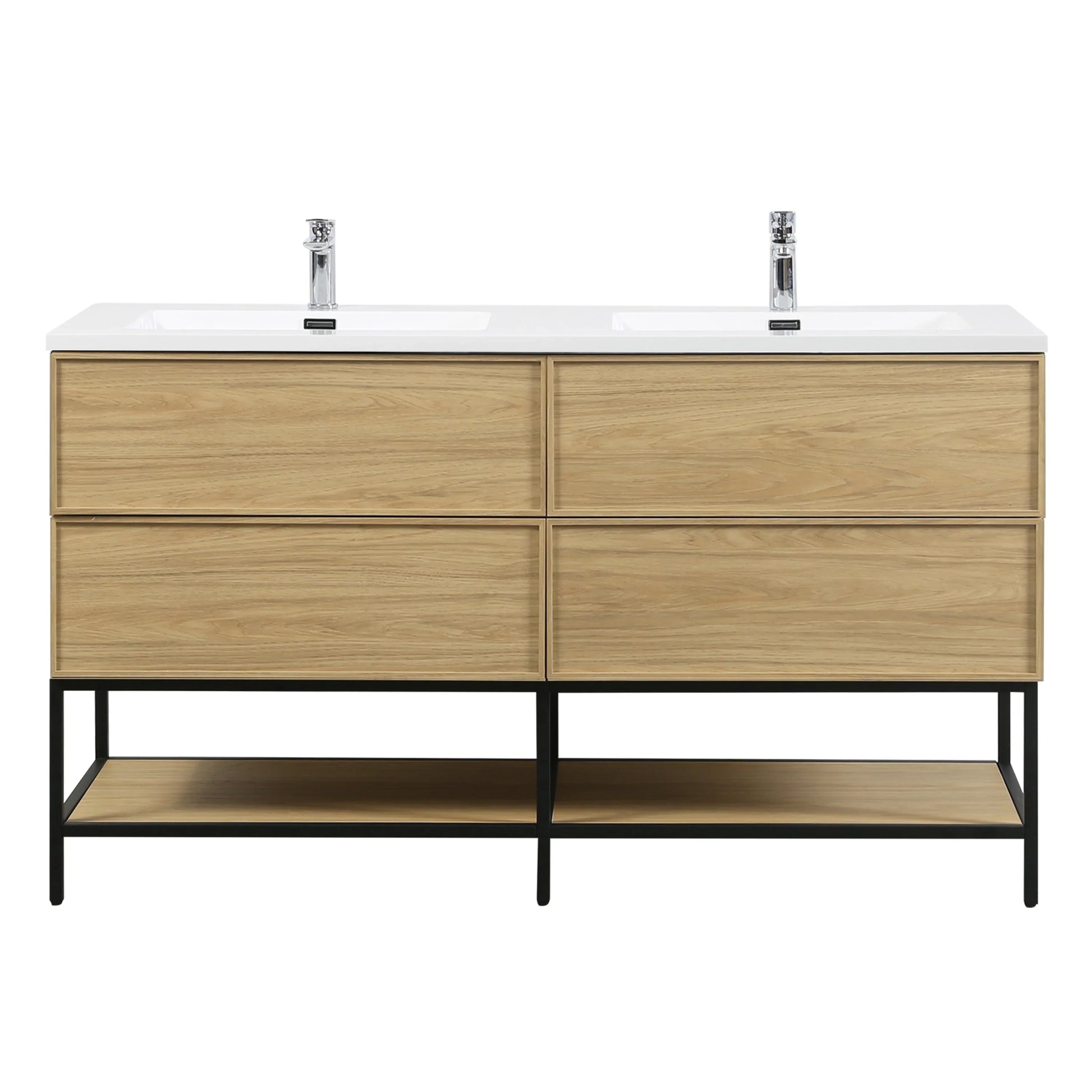 Meuble Lavabo Mural 60 pouces Noyer Couchant Double Vasque avec Comptoir Polymarbre Blanc