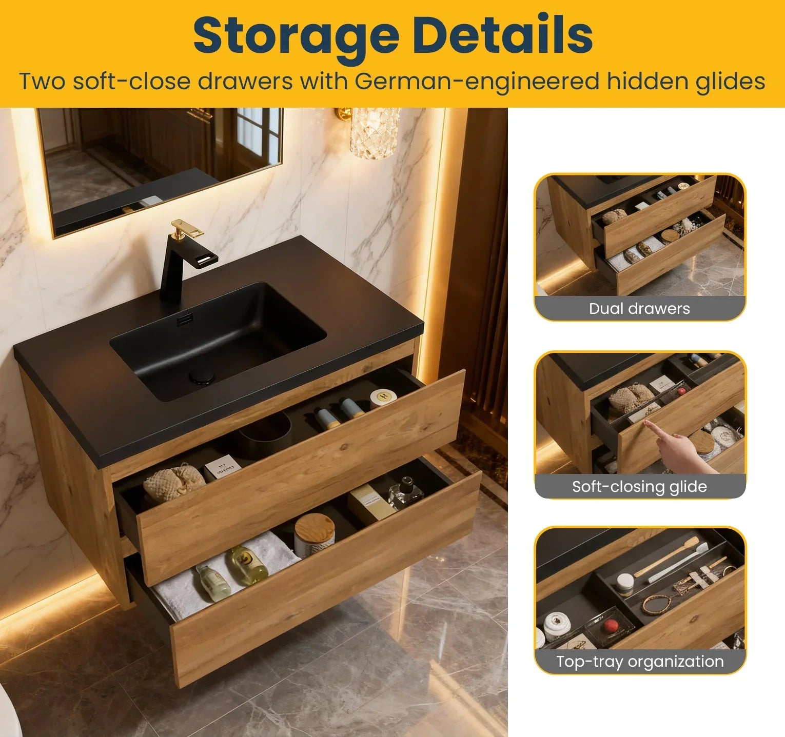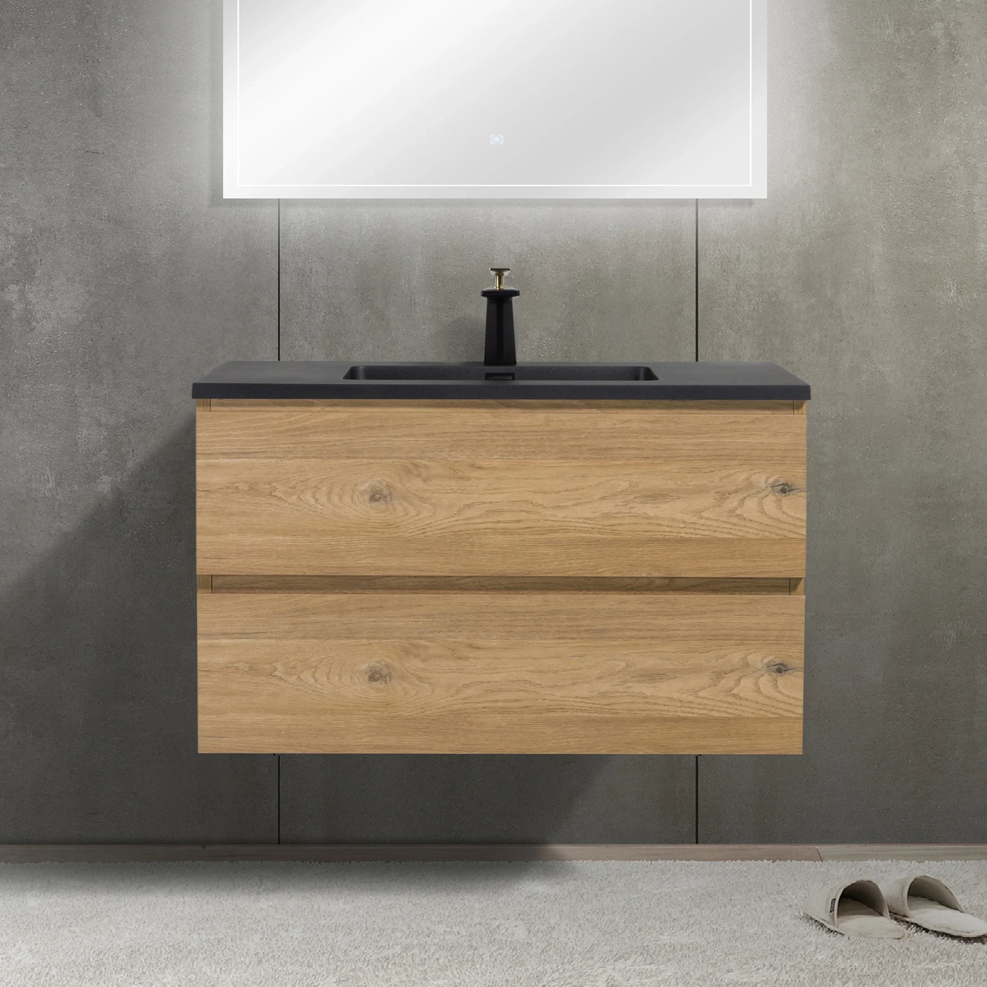 Meuble-Lavabo Mural 36po Chêne Brut avec Comptoir de Quartz d'ingénierie Noir