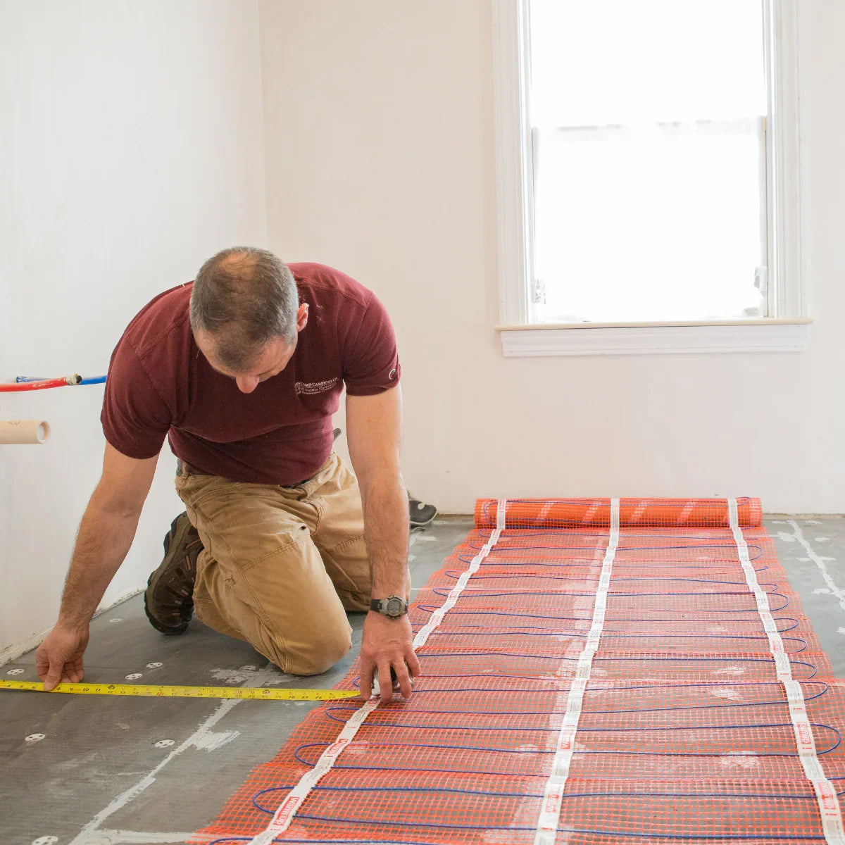 Si vous envisagez d'utiliser du vinyle, de la moquette, du bois, du carrelage ou tout autre revêtement de sol compatible avec le chauffage par le sol, le système peut (et doit, dans certains cas comme pour la moquette) être intégré dans un composé autonivelant pour fournir une surface de sol plane et de niveau sur laquelle poser le revêtement. Cela en fait le système idéal pour les projets de rénovation. N'oubliez pas de vérifier auprès de votre fournisseur de revêtements de sol que le type de sol que vous souhaitez choisir est compatible avec le système Mat.
