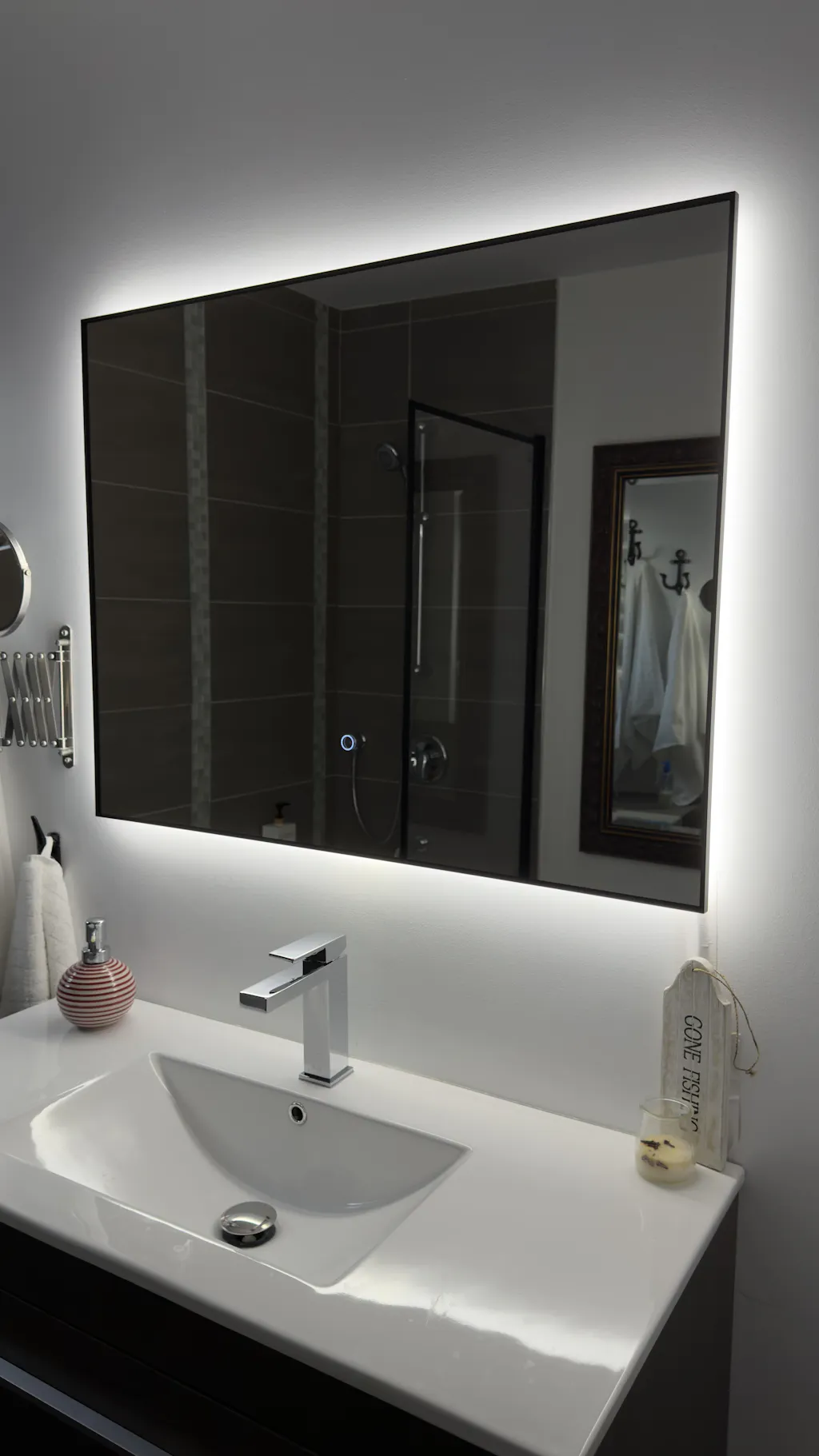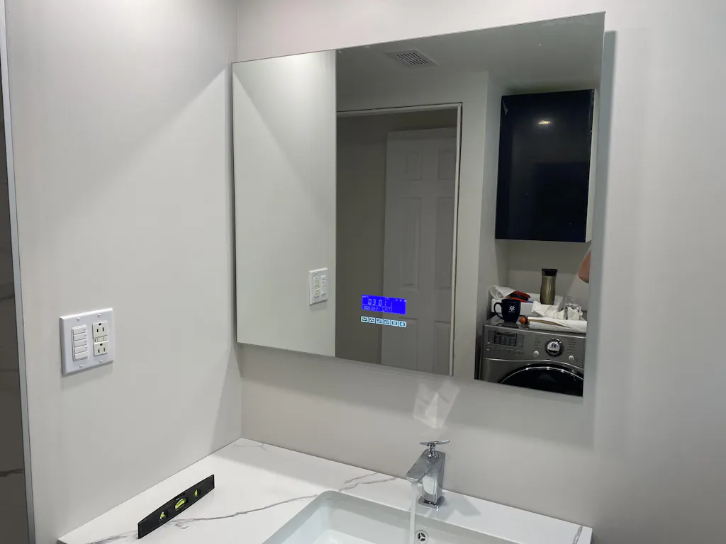 We’re not quite finished our renovations of our bathroom, but the mirror is up and looks and works great.
