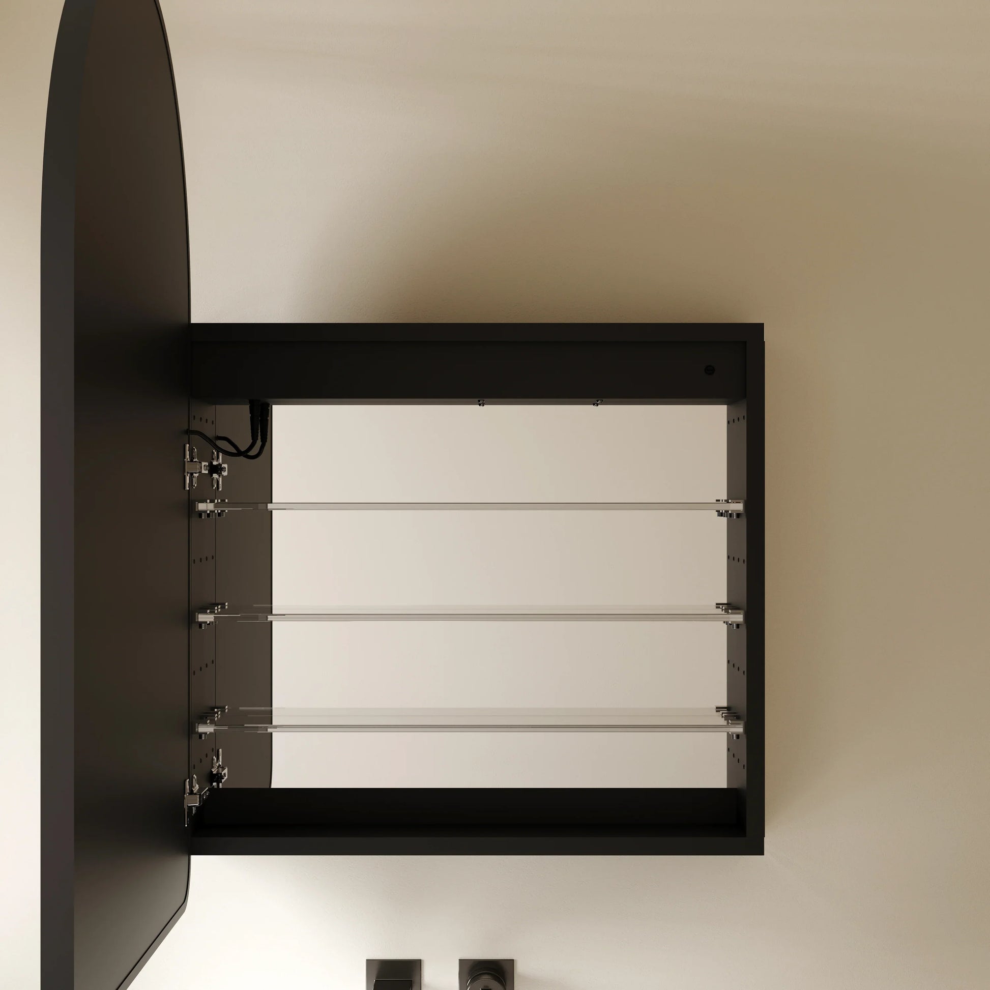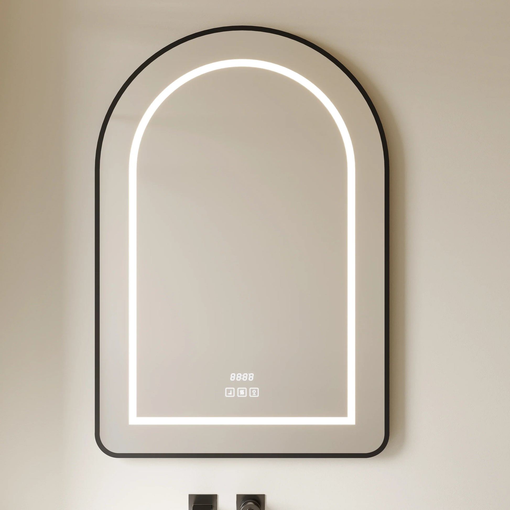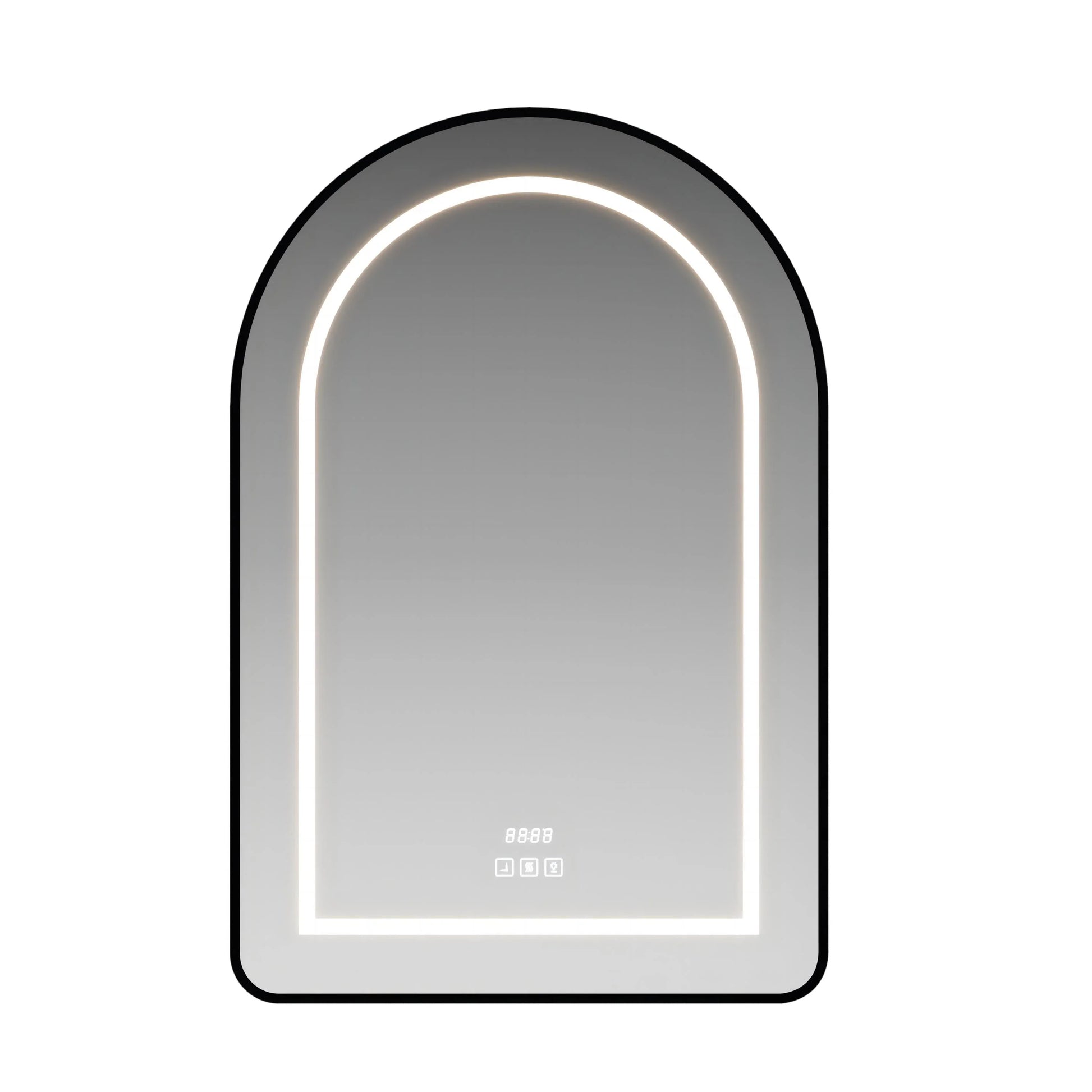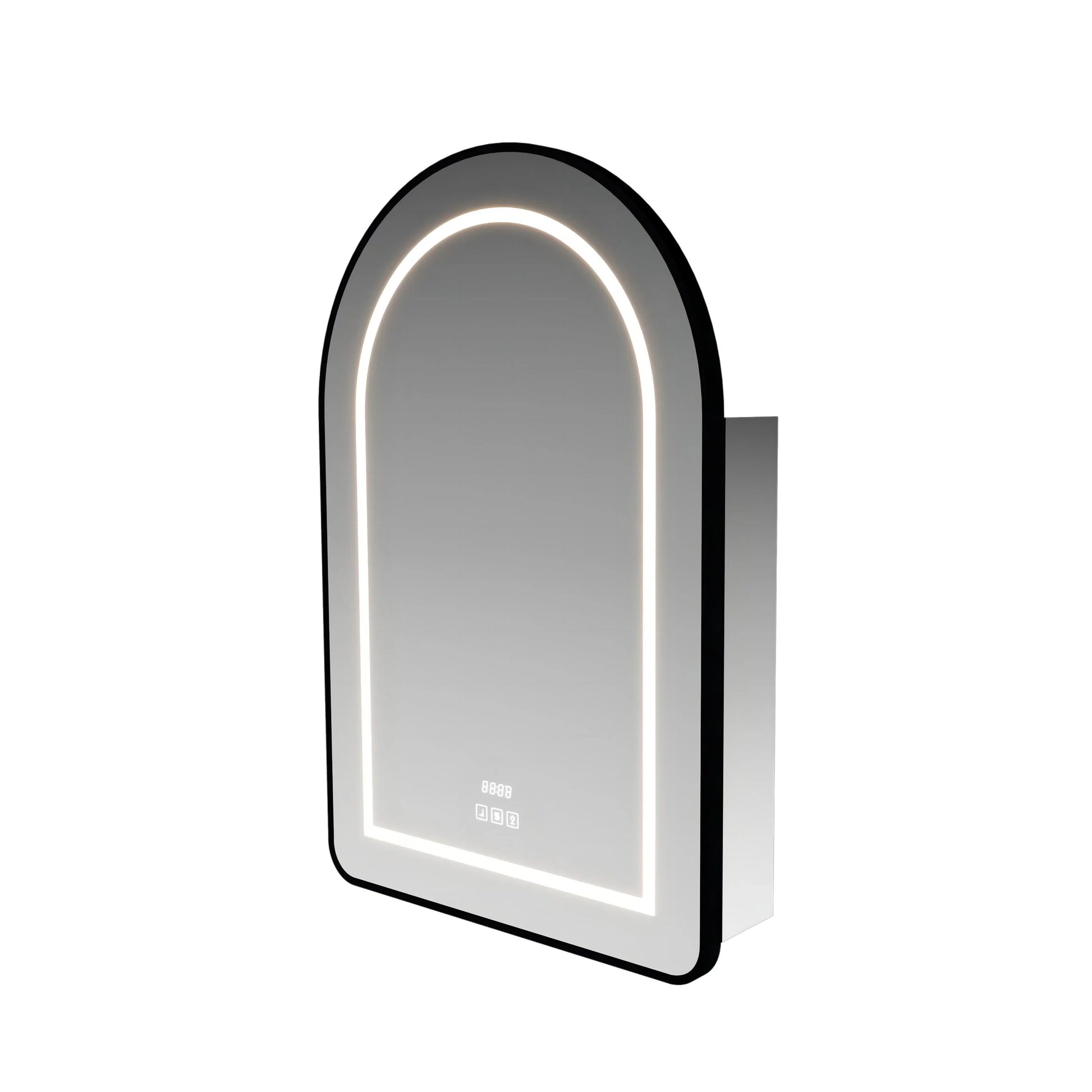 Transform your bathroom with this stunning 24" x 36" arched LED medicine cabinet featuring a sleek matte black aluminum frame. The elegant arch silhouette creates a striking focal point while providing practical storage and smart lighting technology for your daily routine.