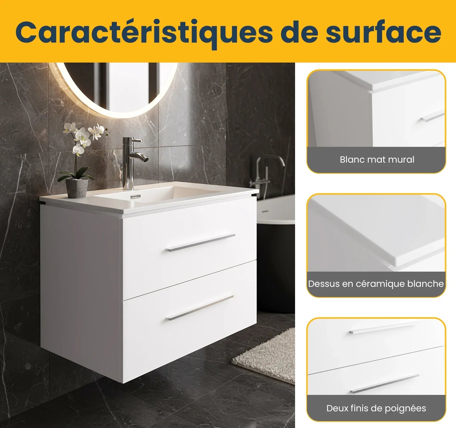 Note: The vanity comes with two sets of handles in matte white and chrome metal. Choose and install according to your preference to personalize your space.