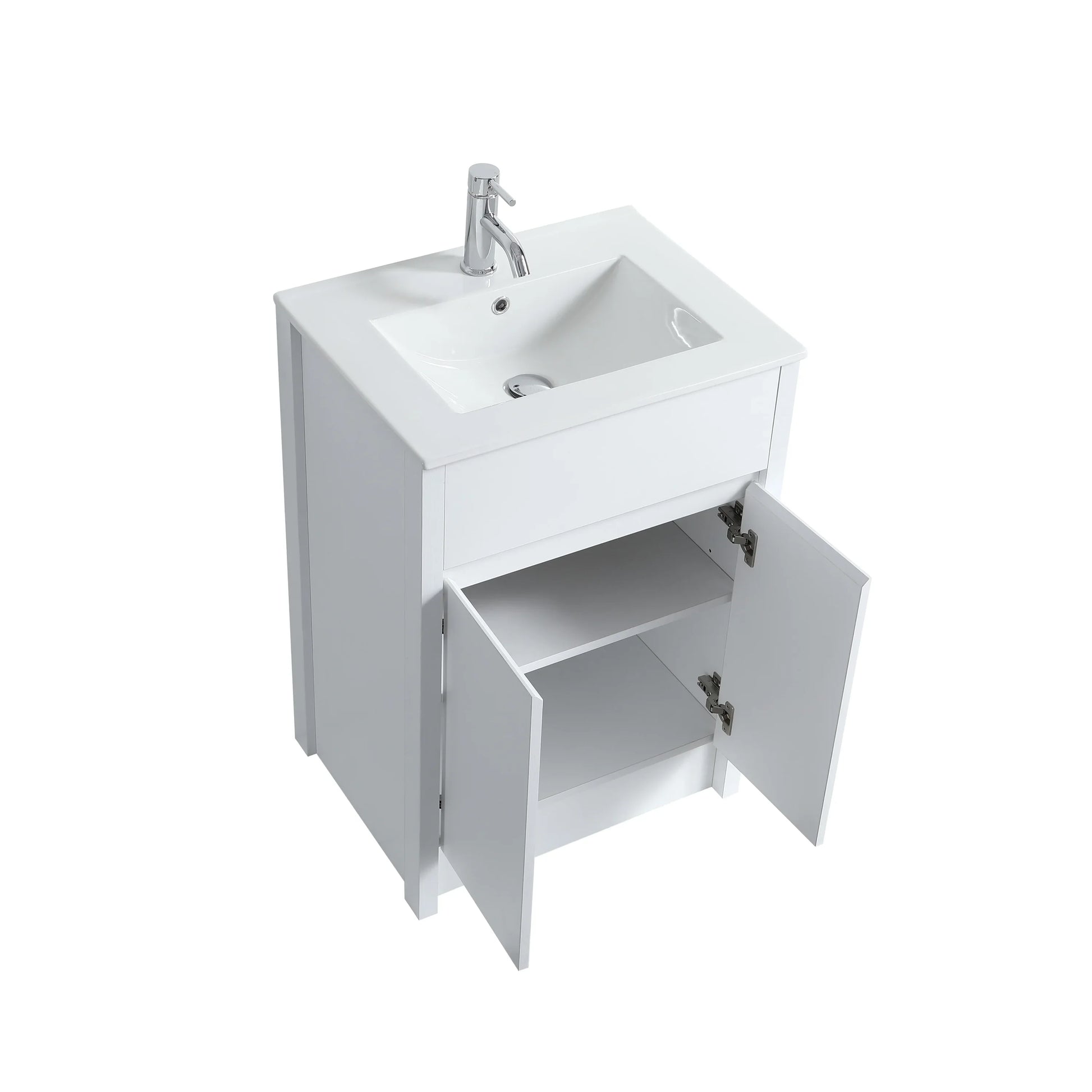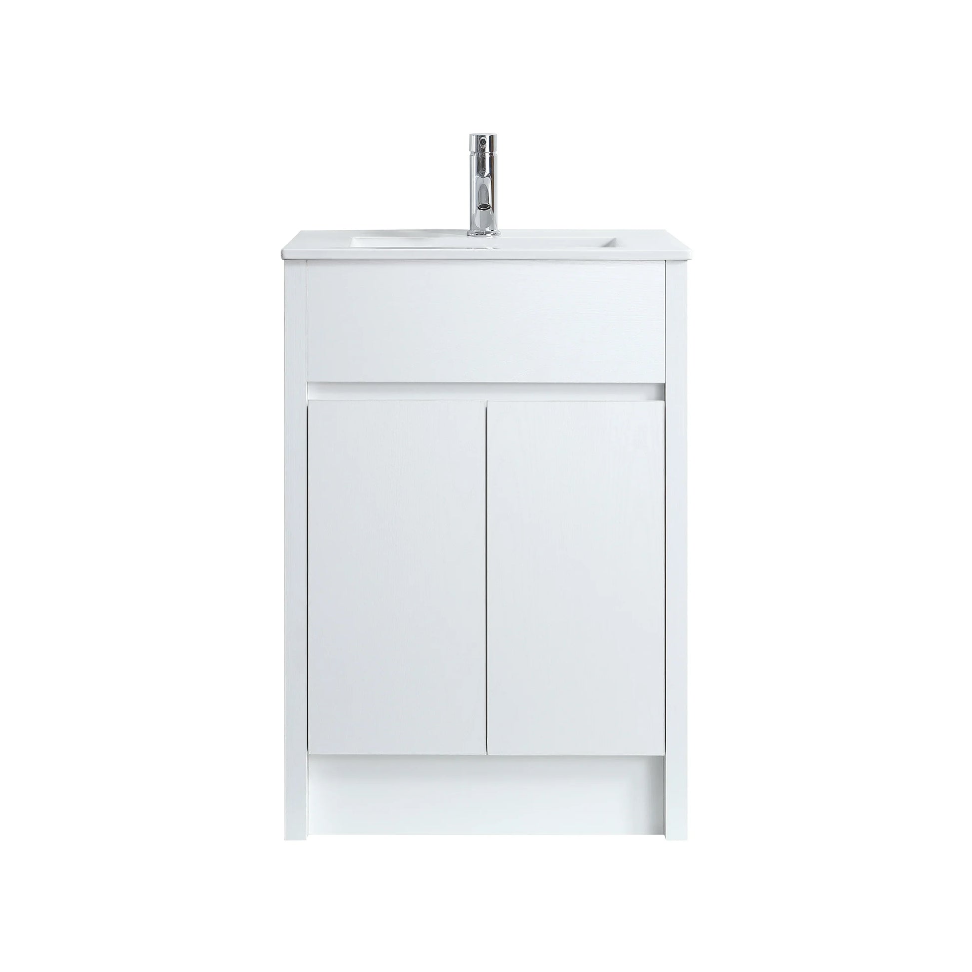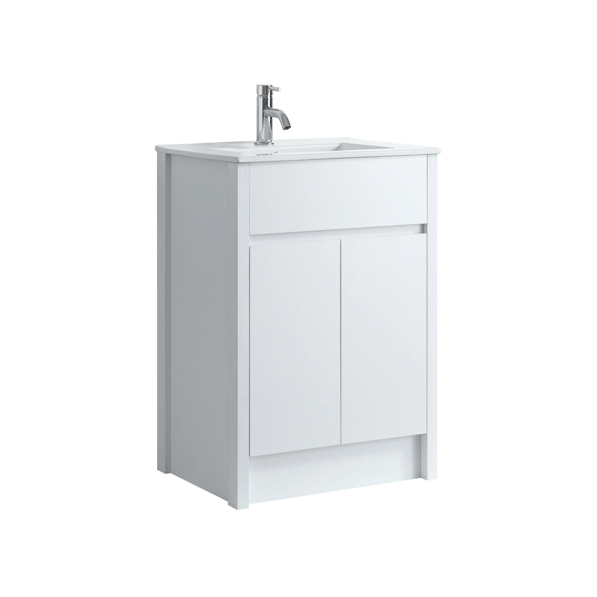Maximize compact charm with this 24″ freestanding vanity in crisp white oak, topped with a glossy white ceramic countertop that combines simplicity and sophistication.
