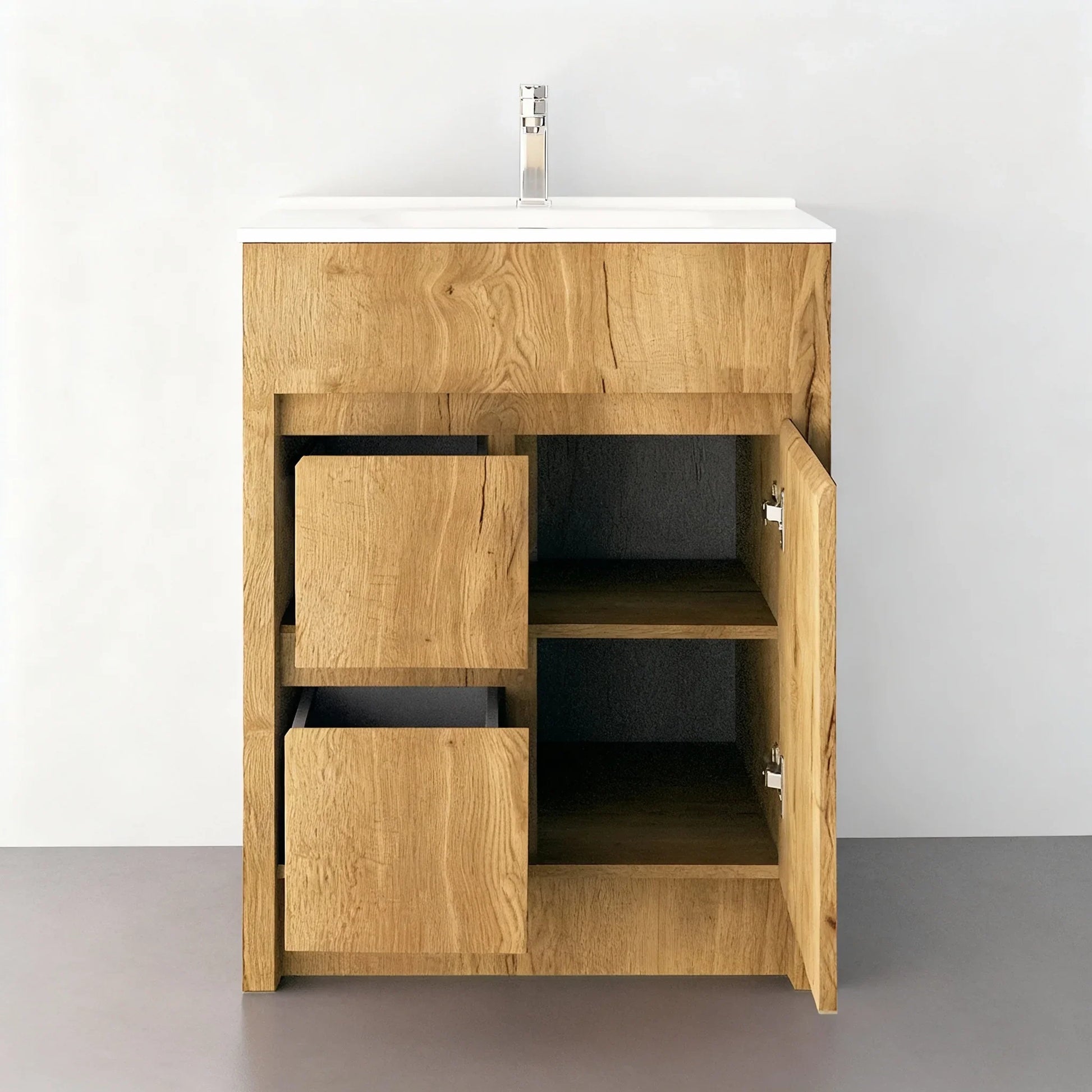 Sleek Ceramic Countertop White high-gloss ceramic countertop with integrated rectangular sink creates a bright, clean aesthetic that beautifully contrasts the warm frosted oak finish. Pre-drilled for single-mount faucet installation with overflow for added functionality.