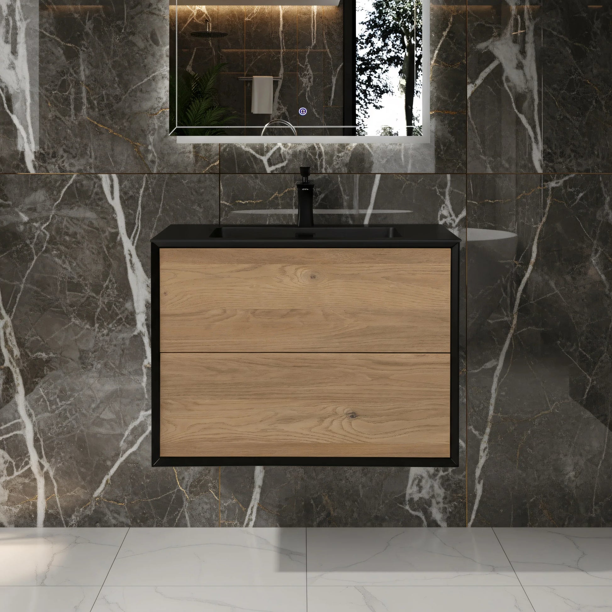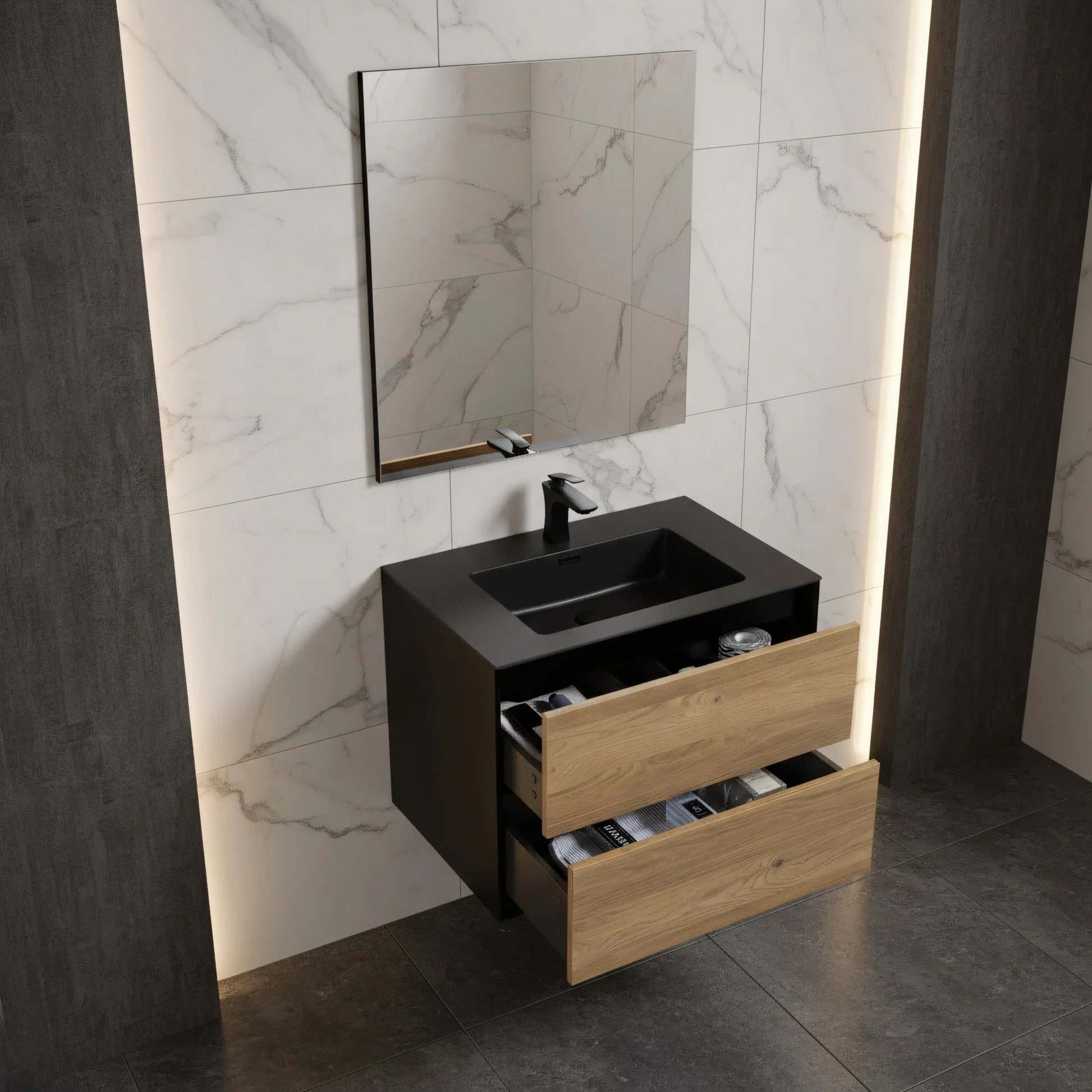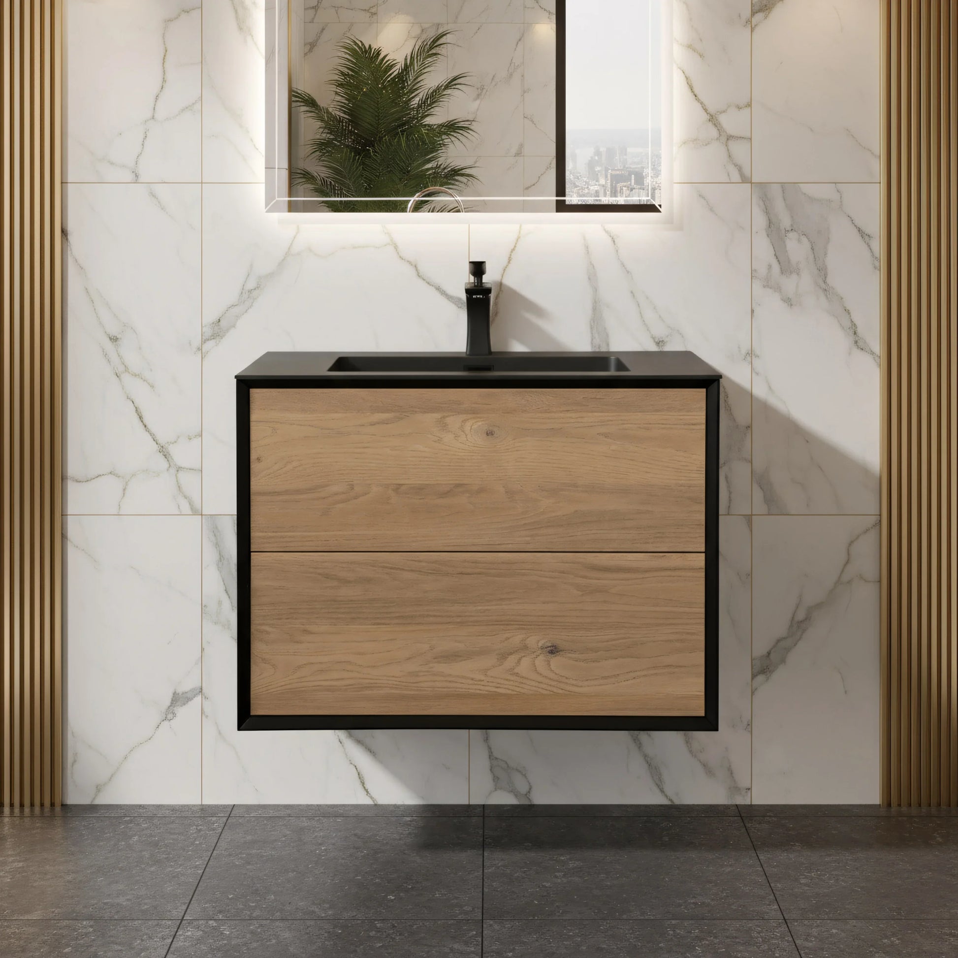 Elevate your bathroom with the Fleur 30" wall mount vanity, where contemporary design meets practical functionality. This stunning floating vanity combines rough oak drawer fronts with a sleek black matte engineered quartz countertop, creating a sophisticated focal point that maximizes both style and floor space in your modern bathroom.