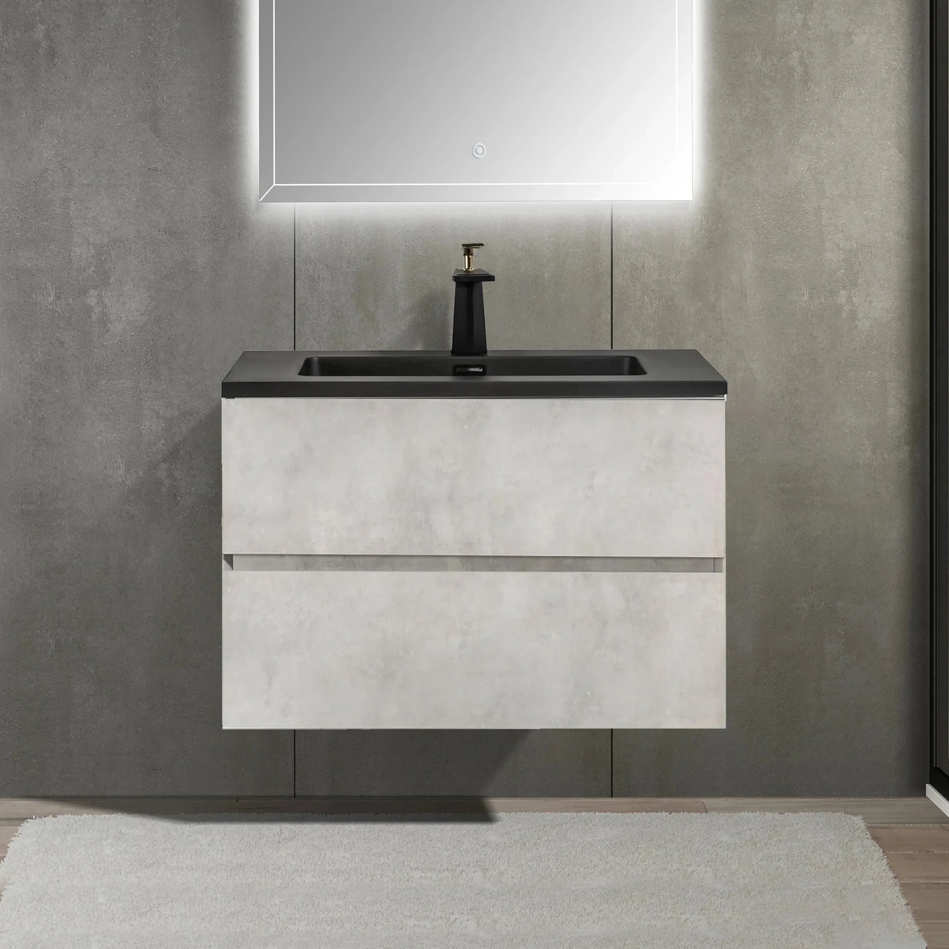 The Edge 30-inch wall-mounted vanity blends bold contrast with modern luxury. With its sleek grey finish, matte black engineered quartz countertop, and integrated rectangular sink, this floating vanity is designed to elevate your bathroom with clean lines and functional style.