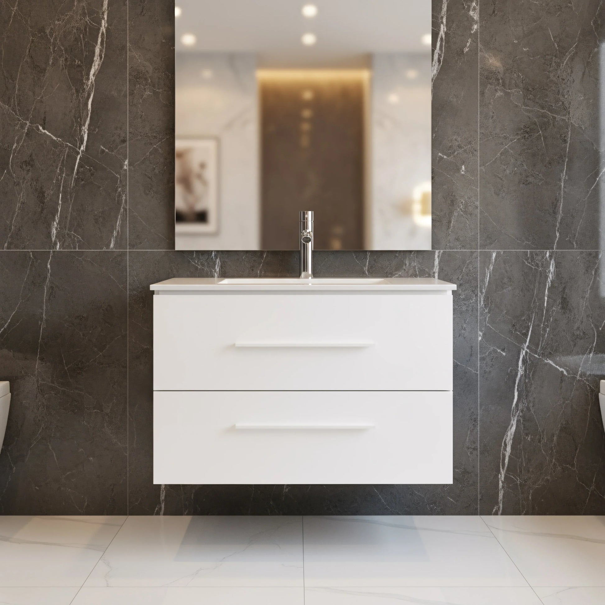 30" Matte White Wall Mount Bathroom Vanity with White Ceramic Countertop