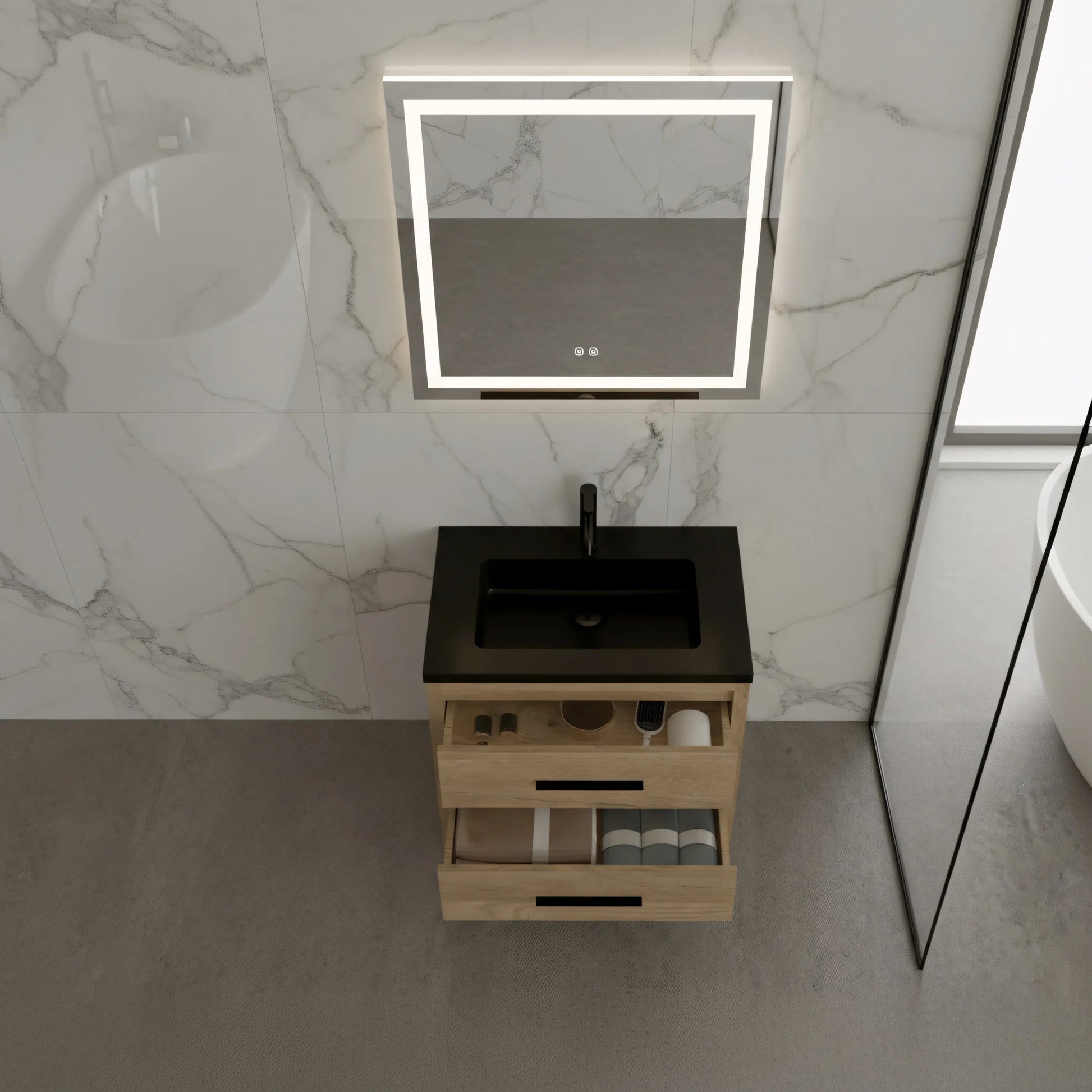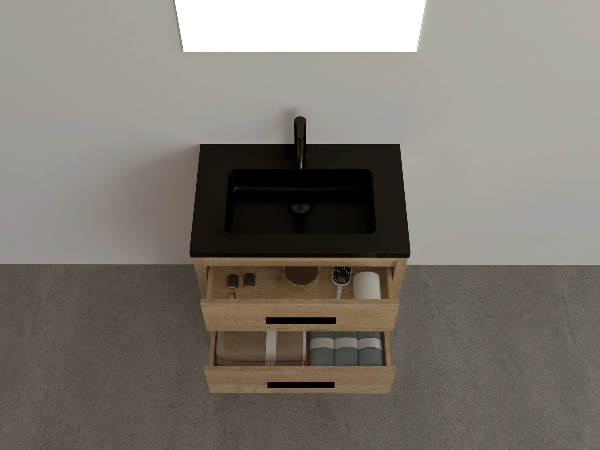 The Fiory vanity features an elegant melamine rough oak finish. It's simple, minimalistic look is sure to modernize and liven up any bathroom design, whether dark, light or in between, and contrasts beautifully with any ceramic tiling style. Its Countertop is a meticulously chosen black engineered quartz top that demonstrates excellence in quality and craftsmanship and comes polished for an enhanced appearance.