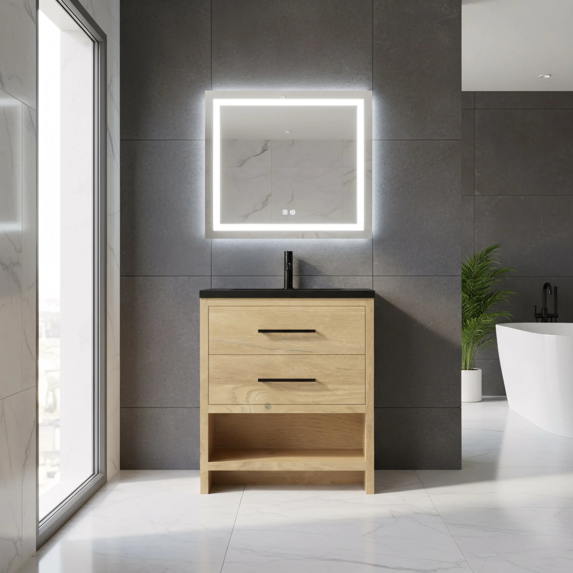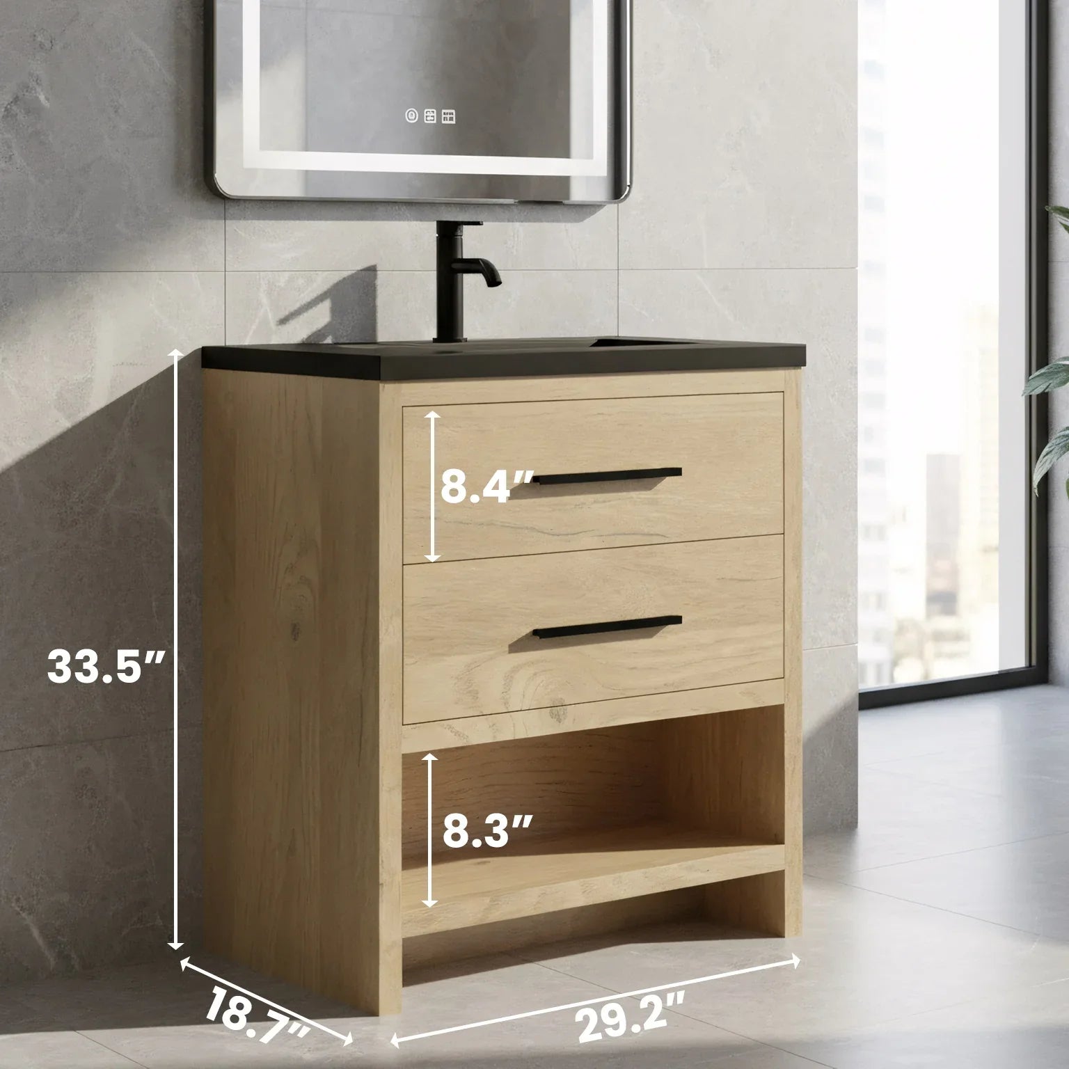 30" Rough Oak Freestanding Bathroom Vanity with Black Engineered Quartz Countertop