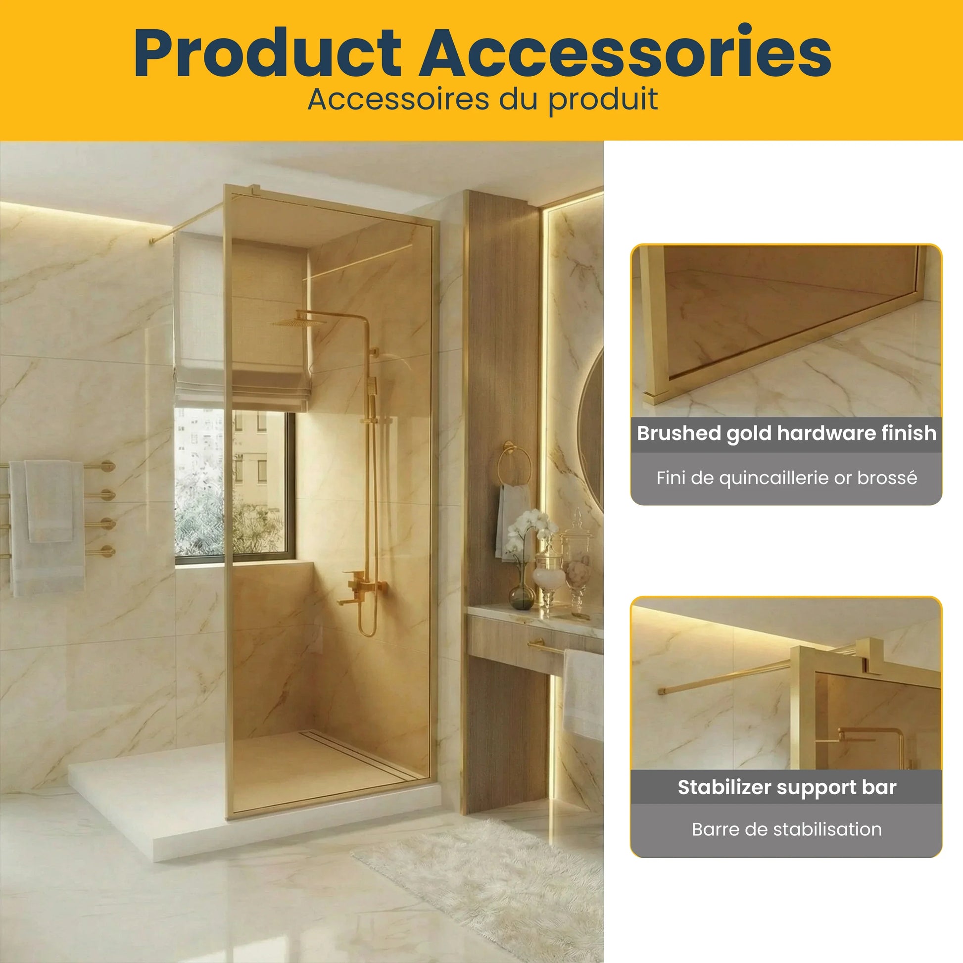 Transform your bathroom into a luxurious retreat with this stunning 34" x 79" reversible framed walk-in shower panel from the Czar Collection. Featuring an elegant brushed gold frame paired with sophisticated brown tinted tempered glass, this panel creates a warm, spa-like ambiance that elevates any modern bathroom design.