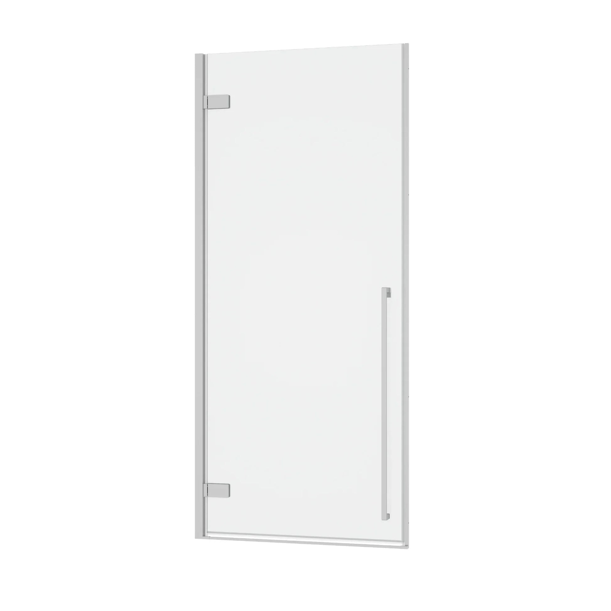 The reversible pivot door design accommodates left or right installation. Polished chrome hardware and sleek vertical handles complete the modern aesthetic visible in every detail.