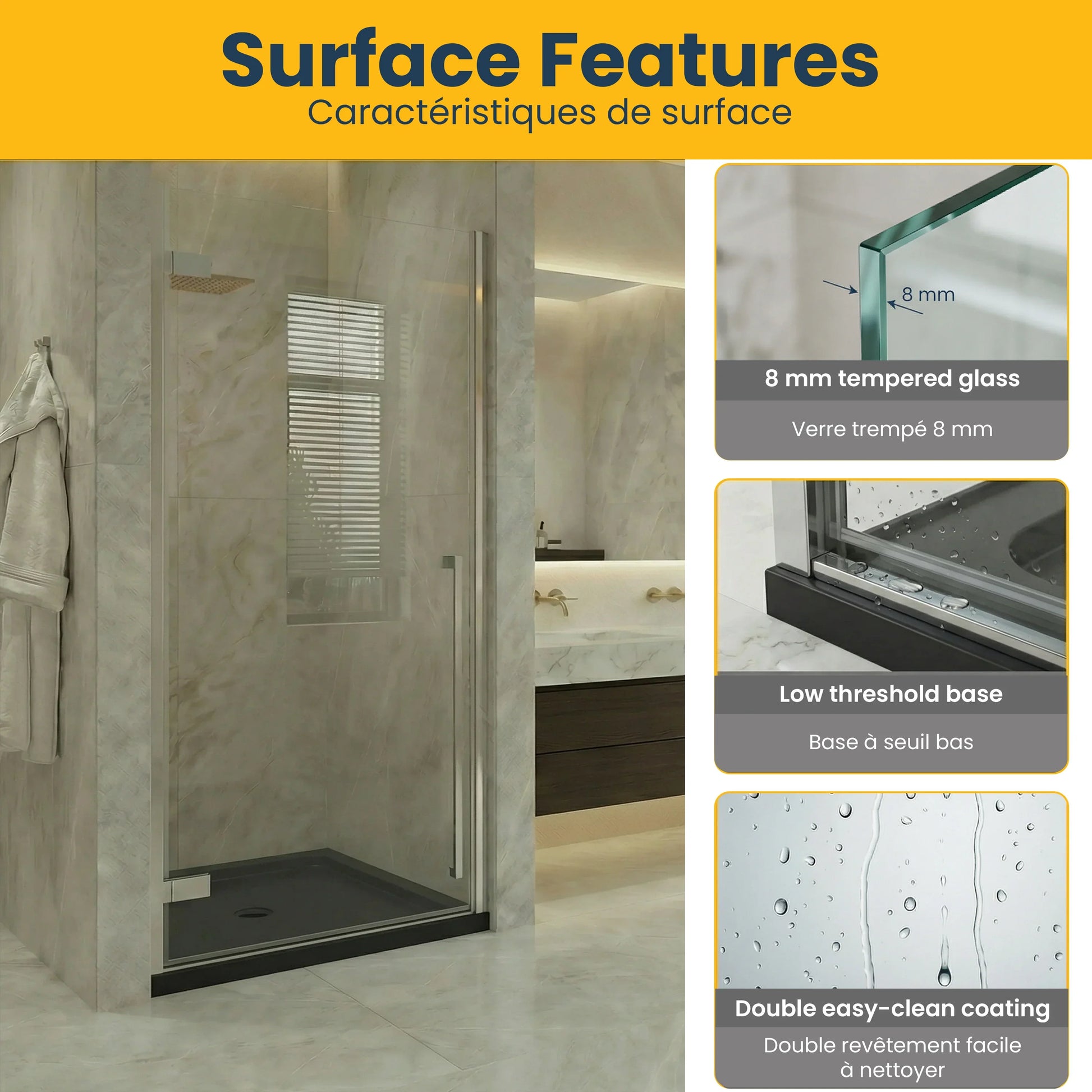 The 8mm tempered glass provides exceptional clarity and durability. A soft-close mechanism and magnetic seal ensure quiet, secure closure every time. The easy-clean protective coating minimizes water spots and soap buildup, keeping your shower looking pristine with less effort.